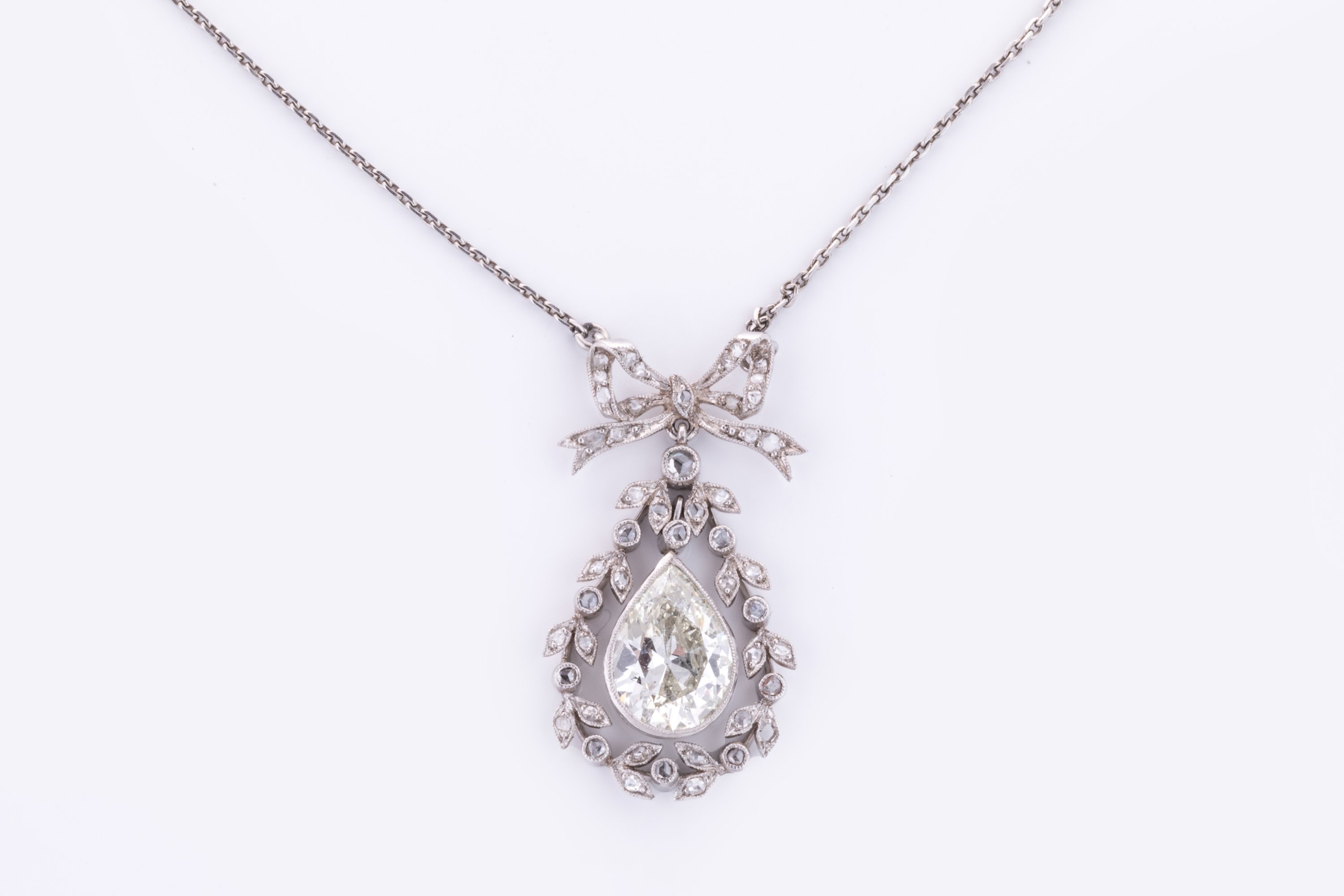 en platine 850 millièmes retenant en pendentif un motif nœud orné de diamants taillés en rose supportant au centre un diamant poire en pampille d'env. 1.60/2.00 ct. dans un entourage feuillagé également serti de diamants taillés en rose.