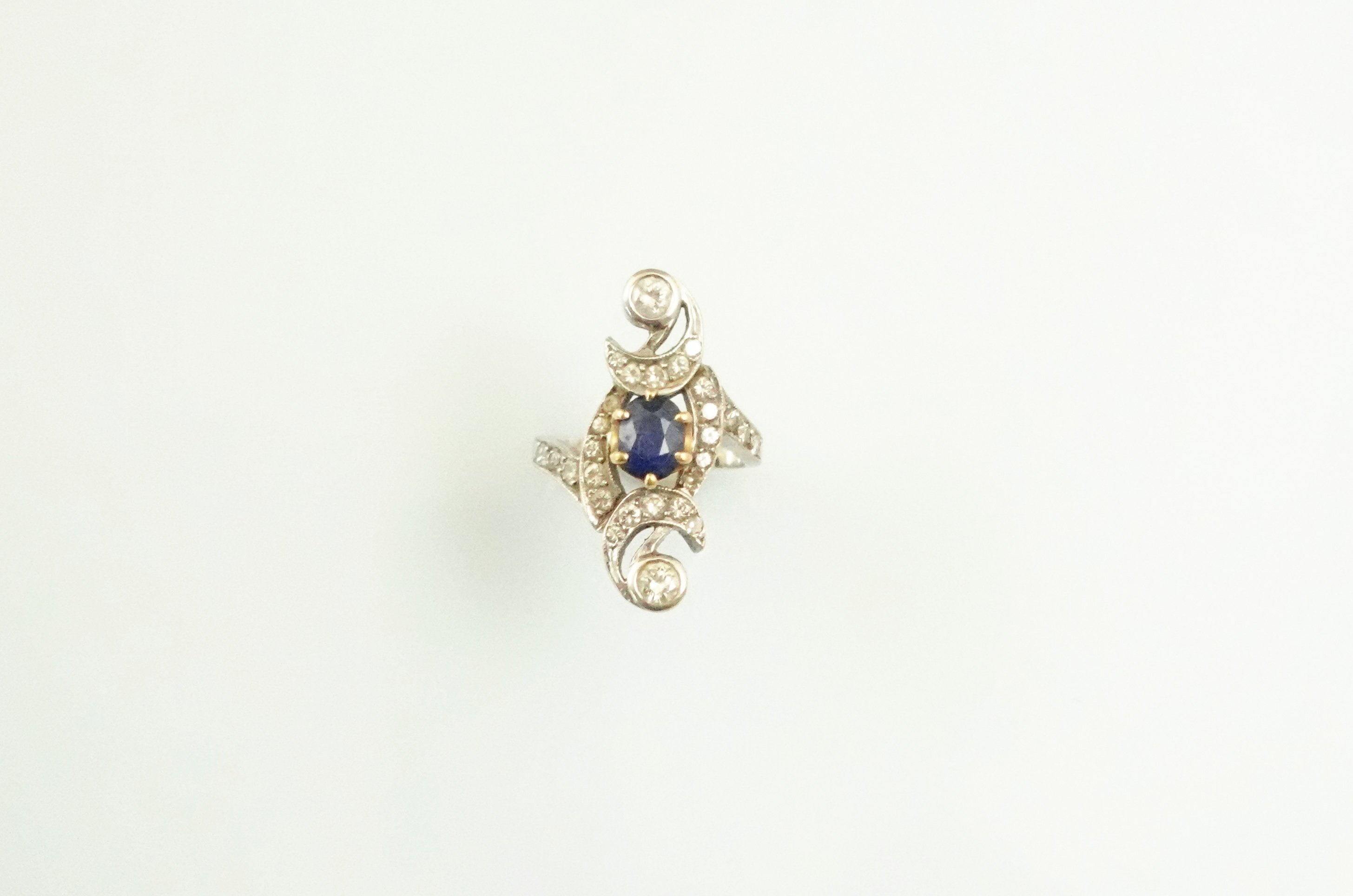 en or gris et jaune 750 millièmes sertie d'un saphir dans un entourage de rinceaux pavés de brillants et terminés par deux diamants ronds taillés en brillant.