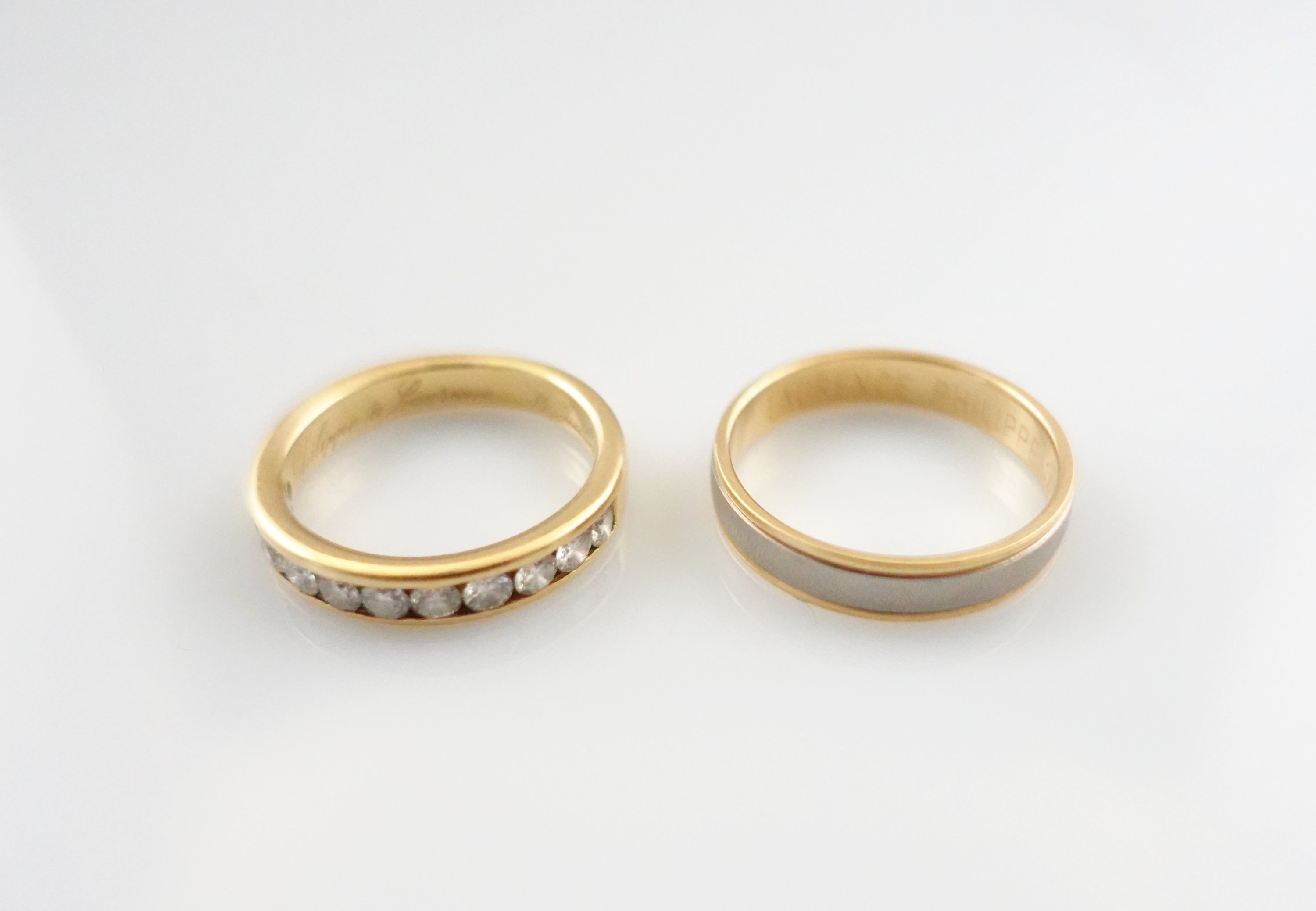 en or jaune 750 millièmes, l'une à décor godronné en or gris 750 milièmes et l'autre ornée de 11 petits diamants en demi-alliance américaine.