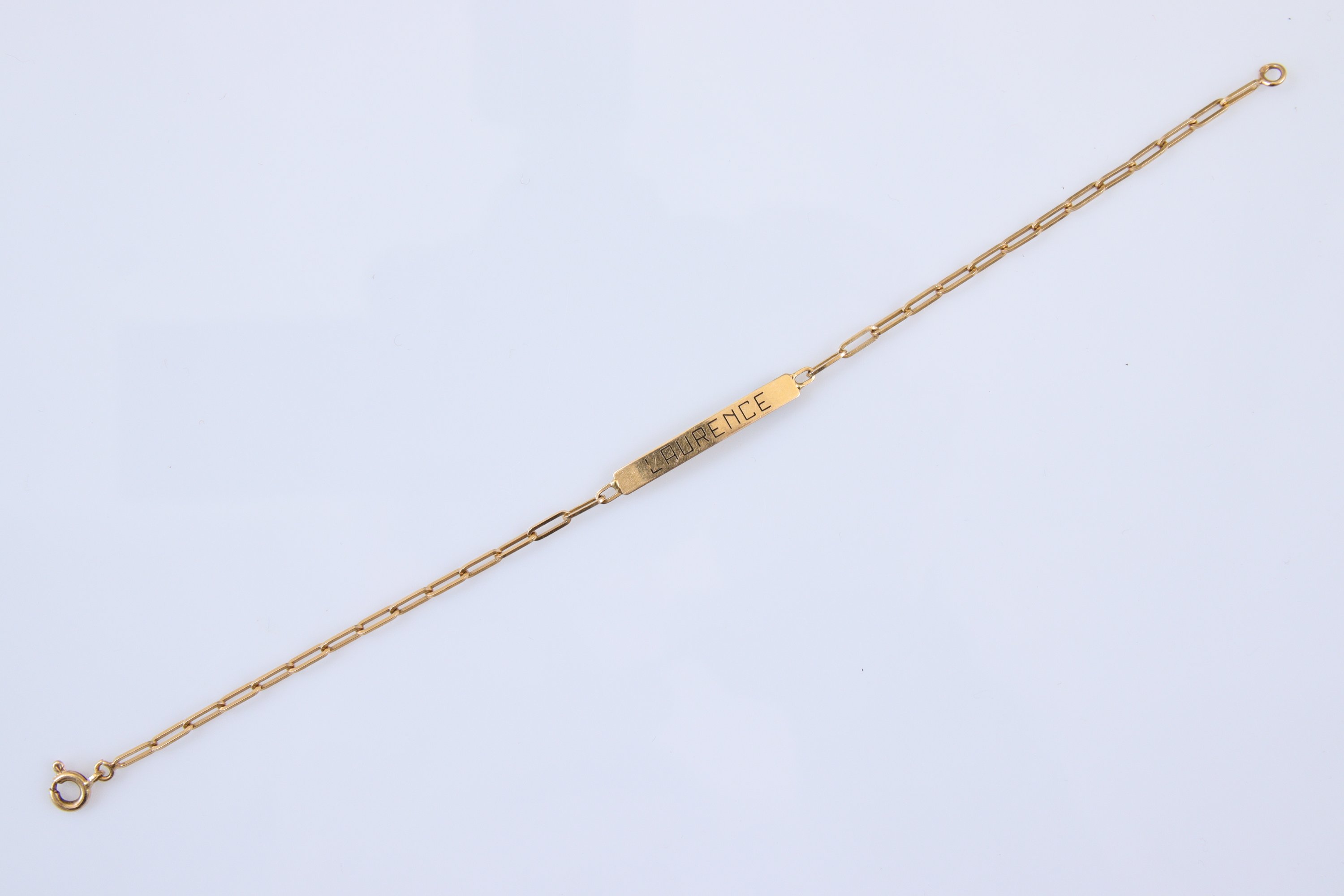 en or jaune 750 millièmes, une plaque gravée "Laurence" d'un côté et "Francis" de l'autre.