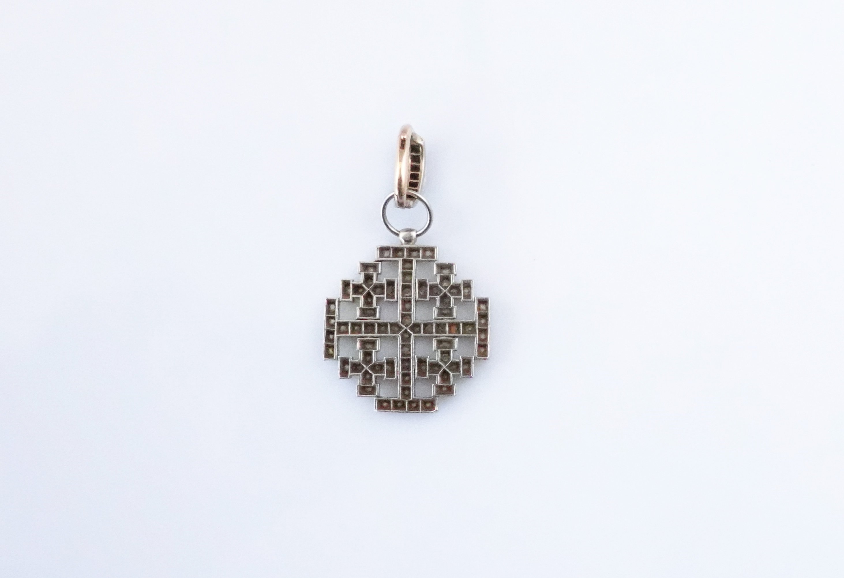 en platine 850 millièmes, sertie de diamants taillés en huit-huit. La bélière en or rose 750 millièmes et argent 800 millièmes sertie de pierres blanches.
