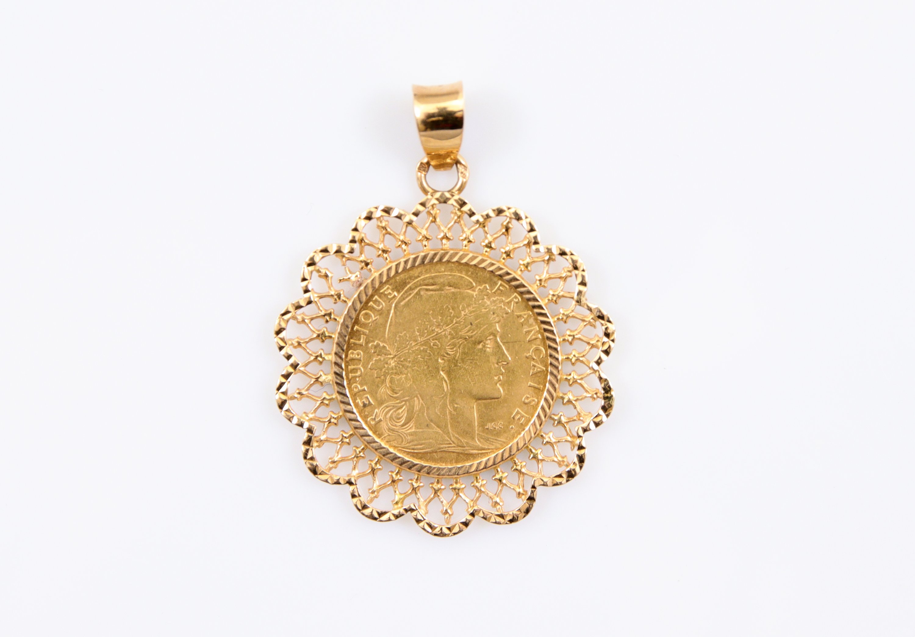 en or jaune 750 millièmes sertie d'une pièce de 10 francs or, Marianne, 1900.
