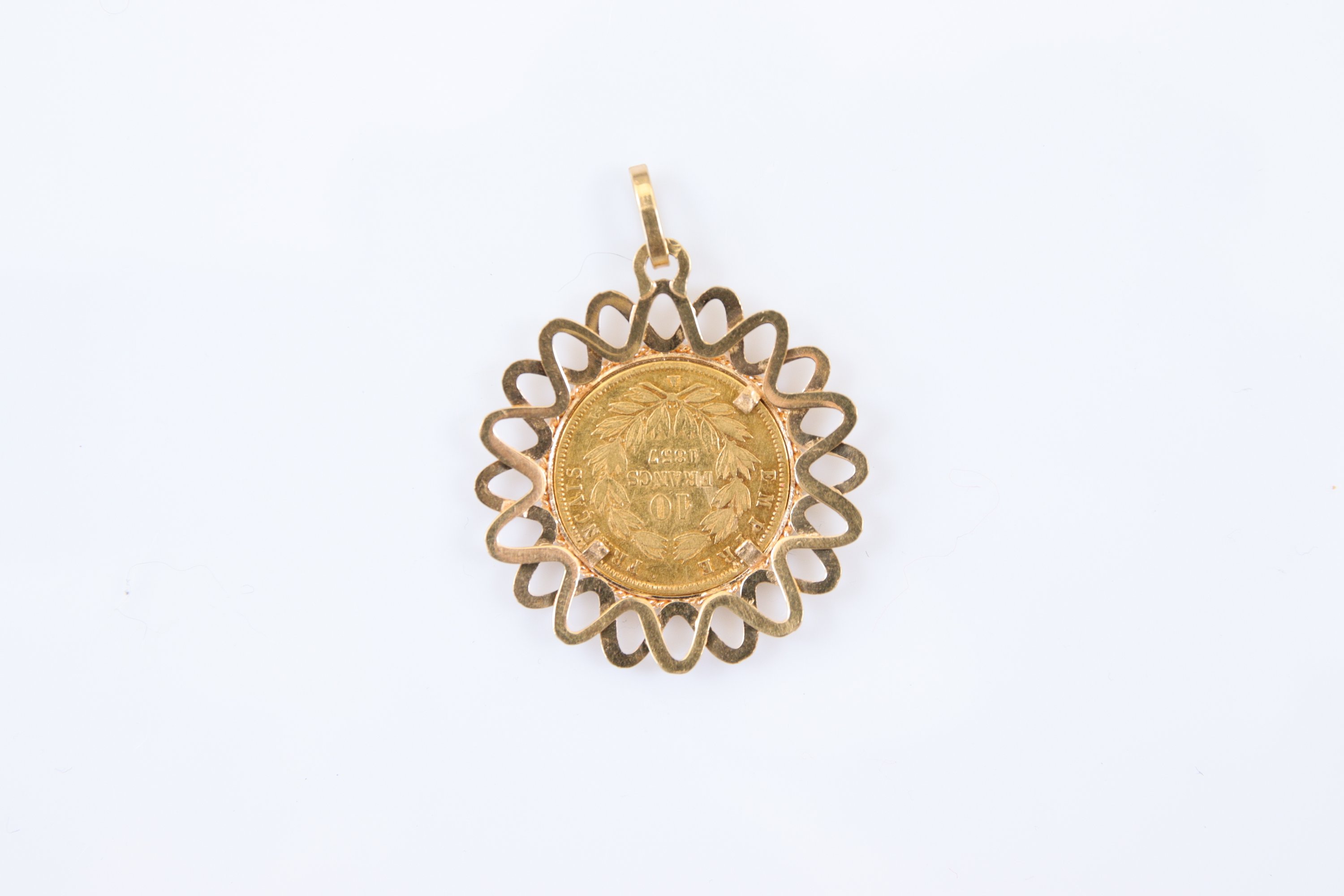 en or jaune 750 millièmes sertie d'une pièce de 10 francs or Napoléon III tête nue, 1857.