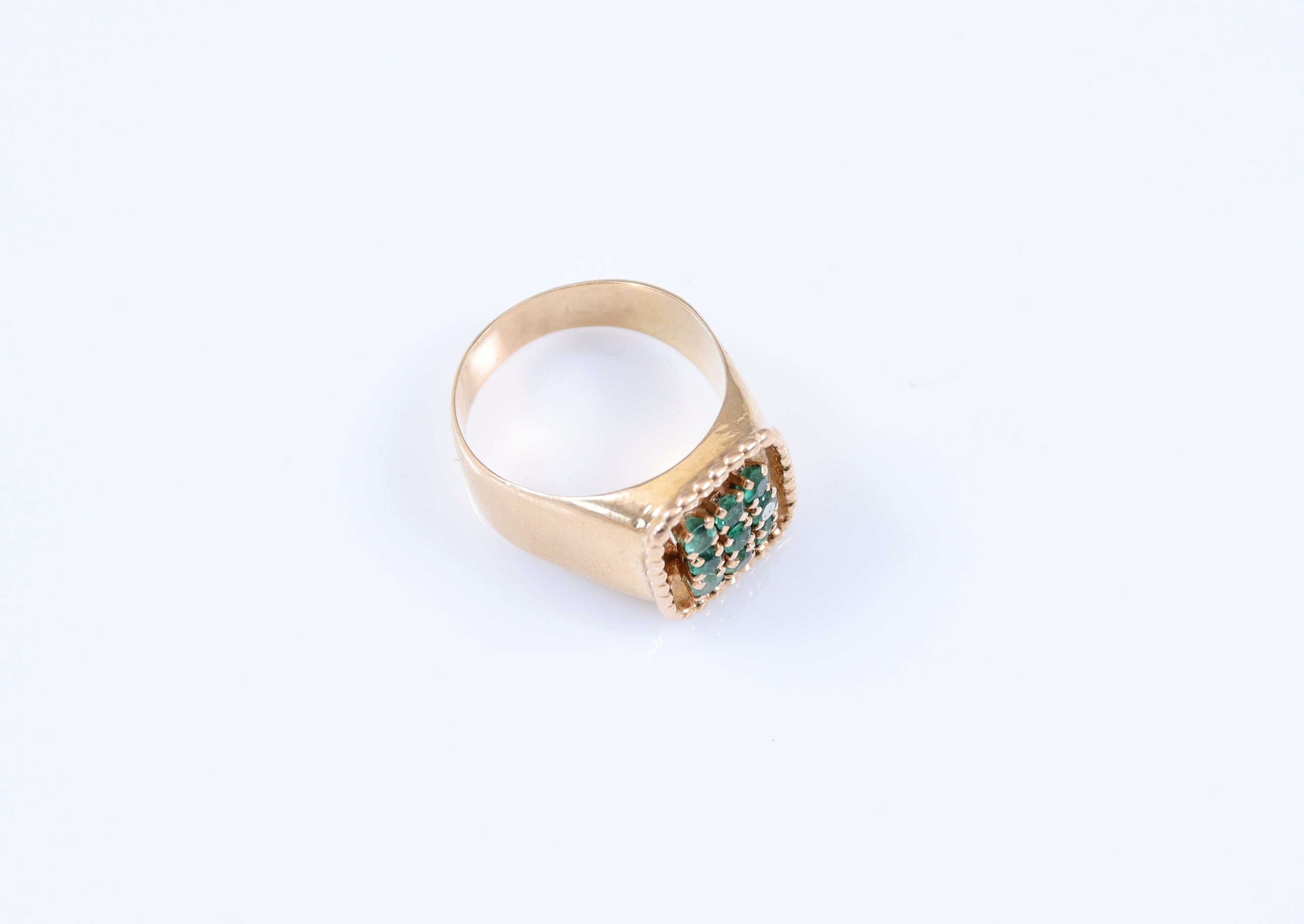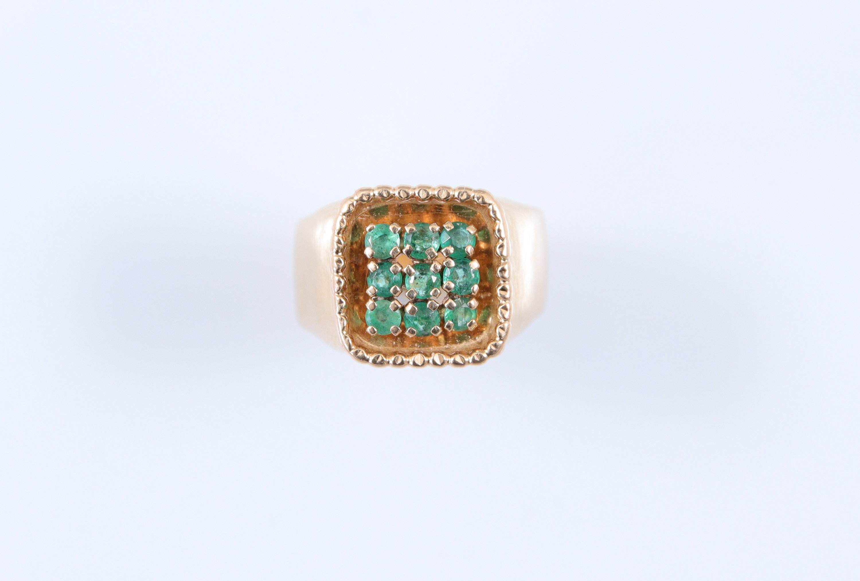 en or jaune 750 millièmes sertie de neuf petites émeraudes.