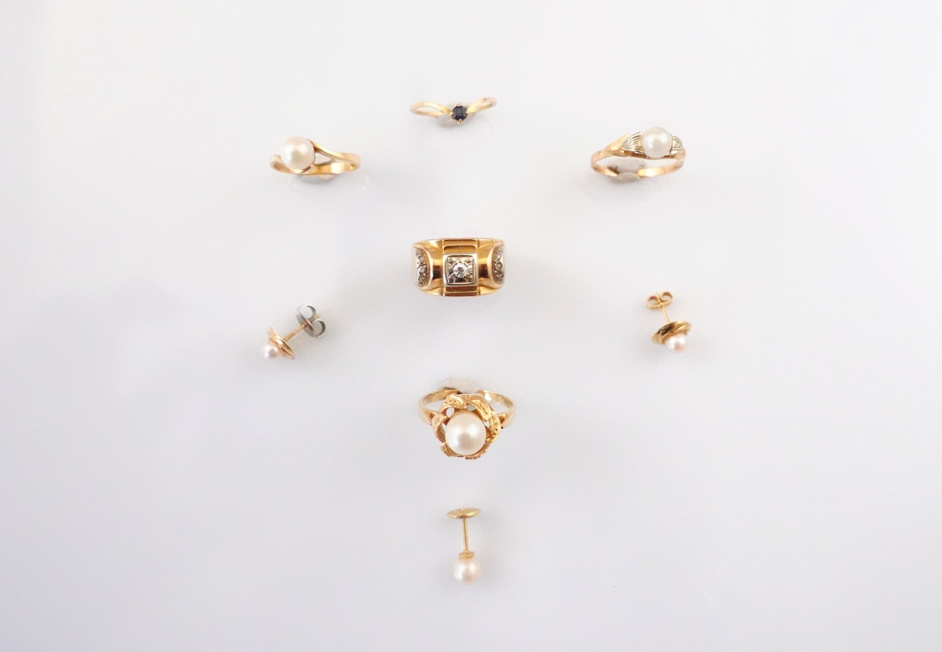 Joint: une paire de clous d'oreilles sertis de perles et un clou en or jaune.