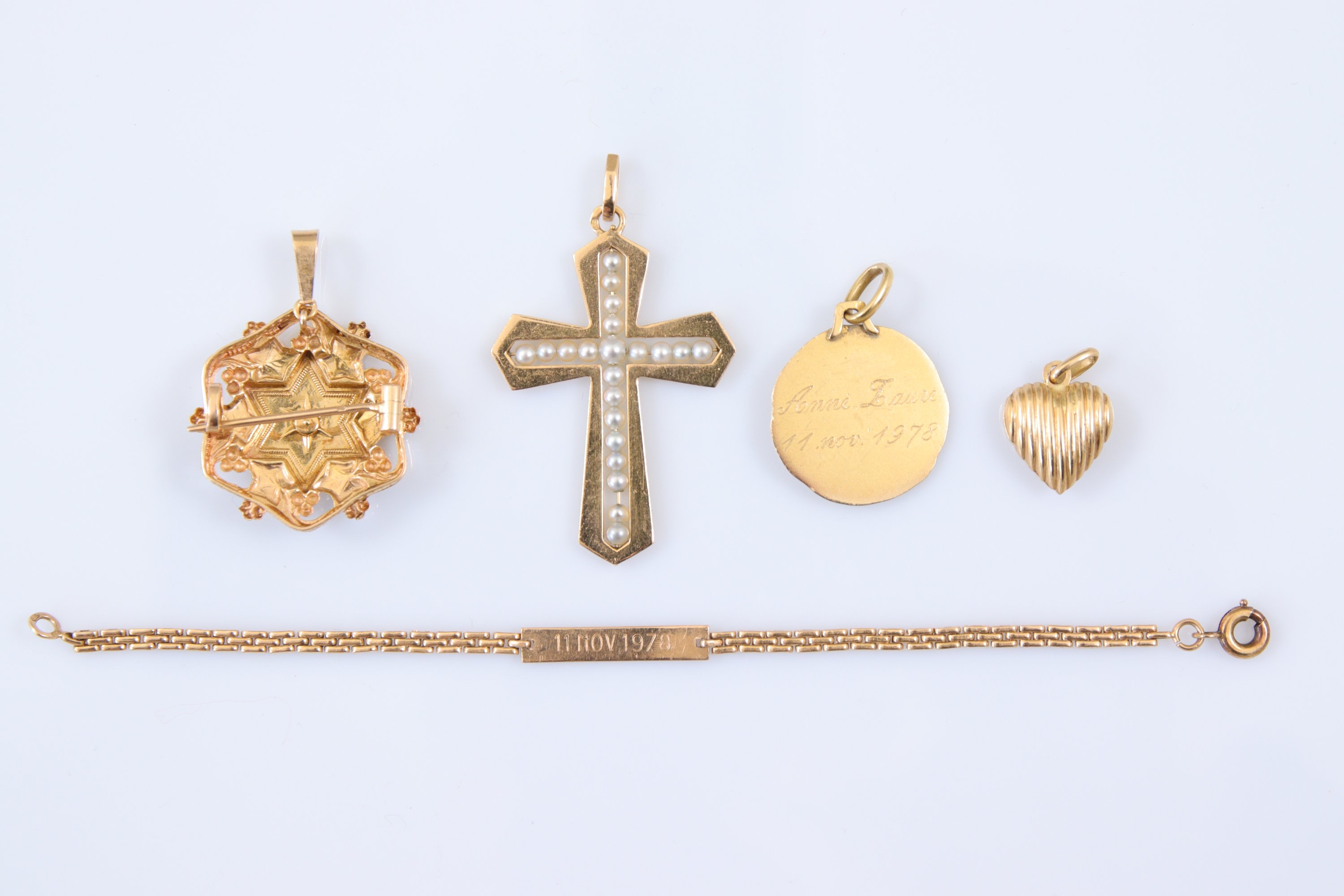Une gourmette, une broche et trois pendentifs