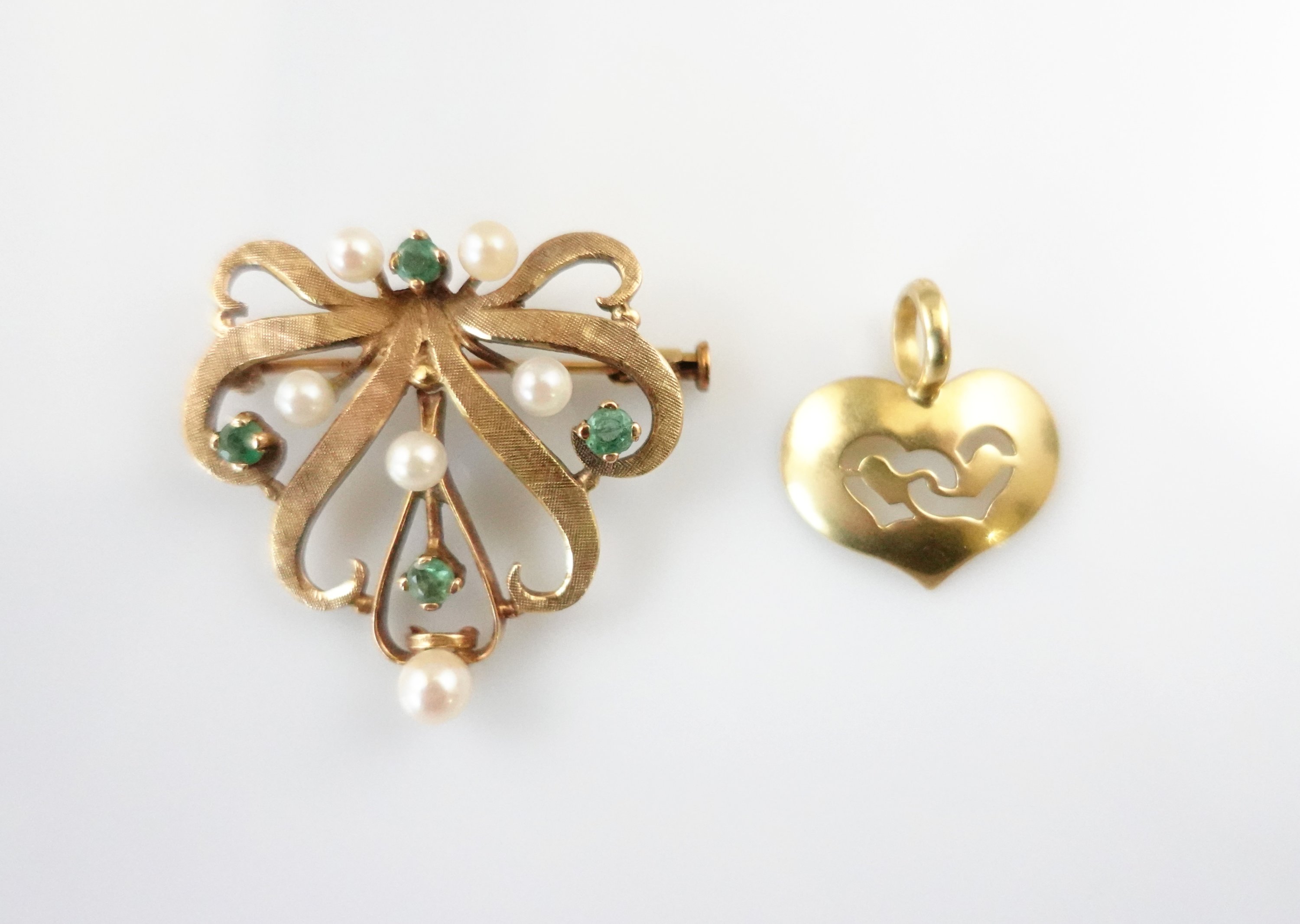 en or 585 millièmes, sertie de six perles et quatre pierres vertes.