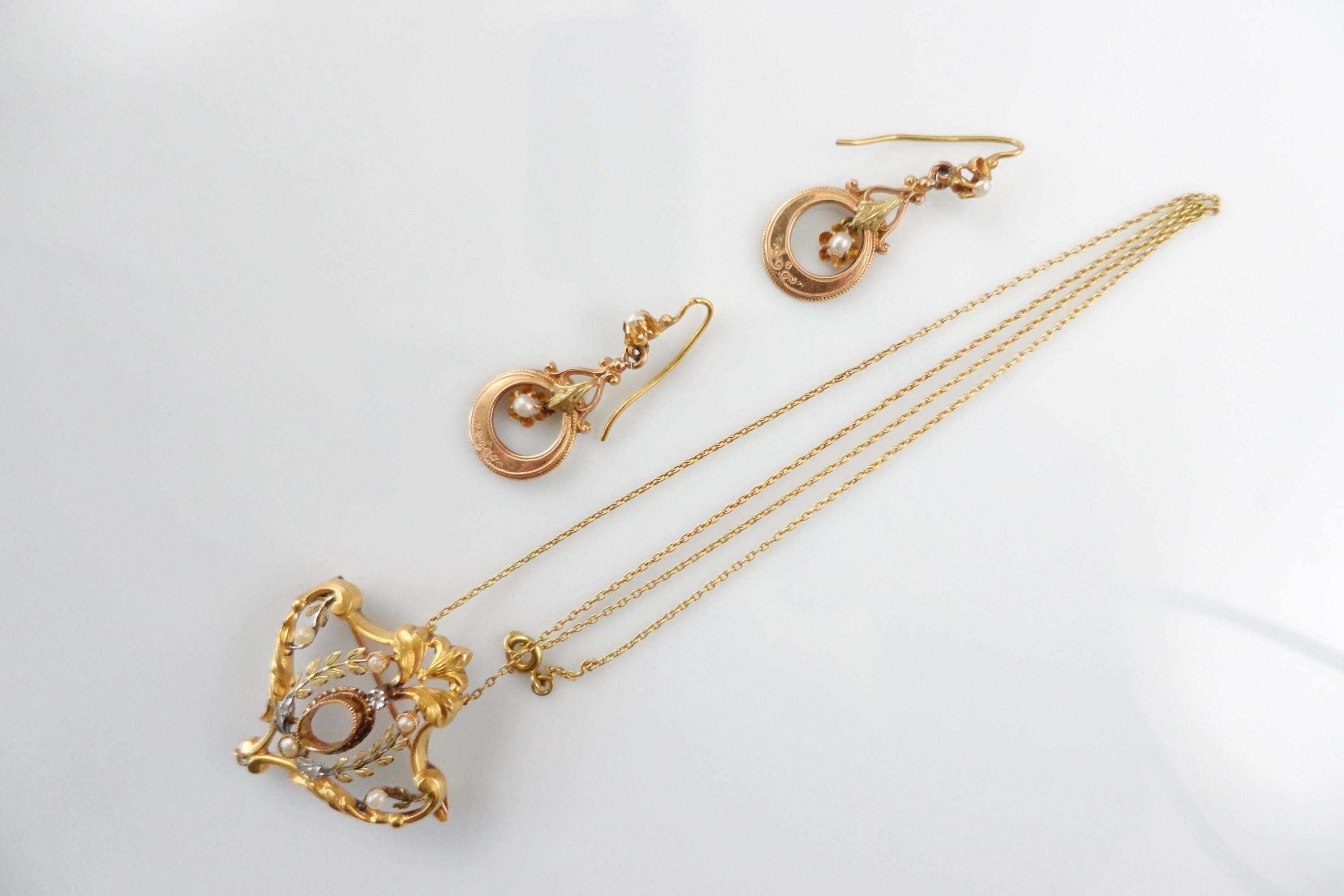 Ensemble d'une paire de boucles d'oreilles et broche-pendentif et sa chaîne formant parure