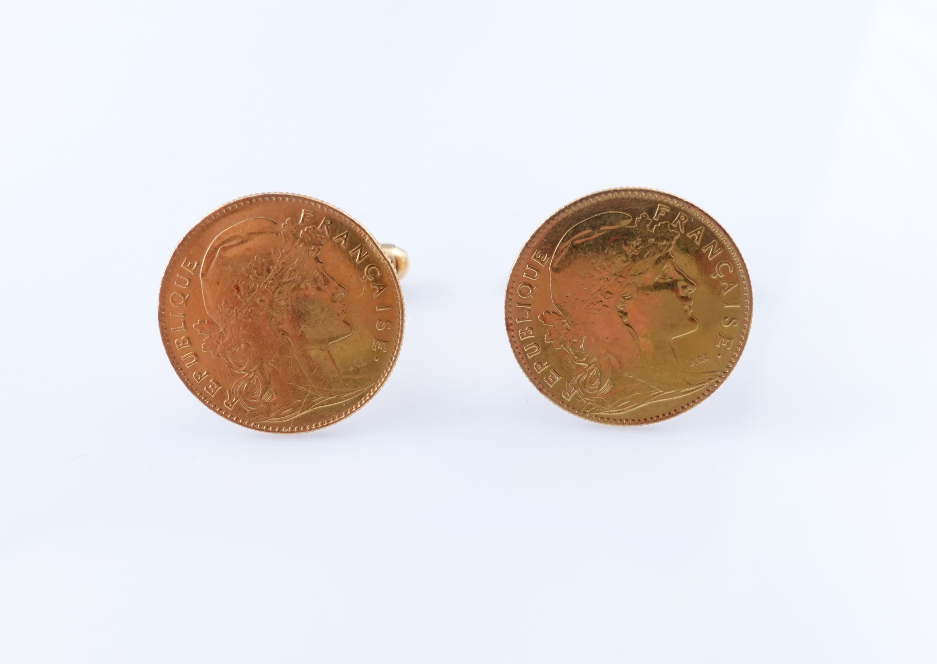 en or jaune 750 millièmes, sertis de deux pièces de 10 francs or au coq 1907 et 1910.
