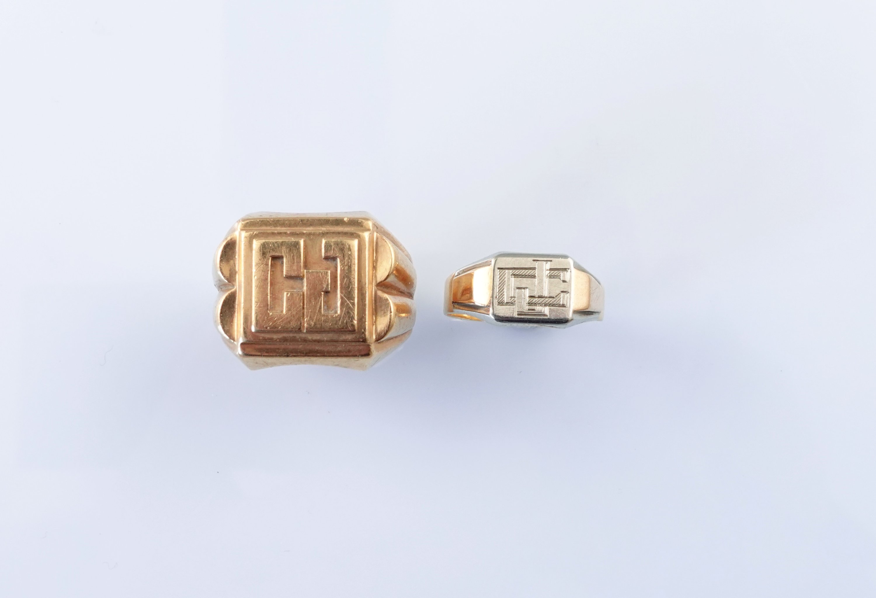 Joint: Chevalière en or jaune 750 millièmes et argent 800 millièmes monogrammée "CJ". TDD 55. Poids brut: 2,9 g.