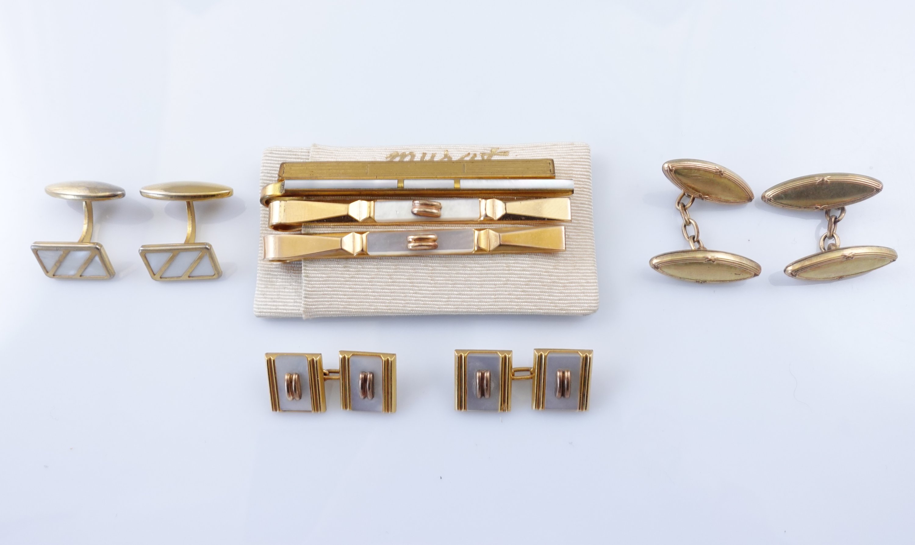 - Trois paires de boutons de manchette en métal doré, dont deux en placage de nacre ;