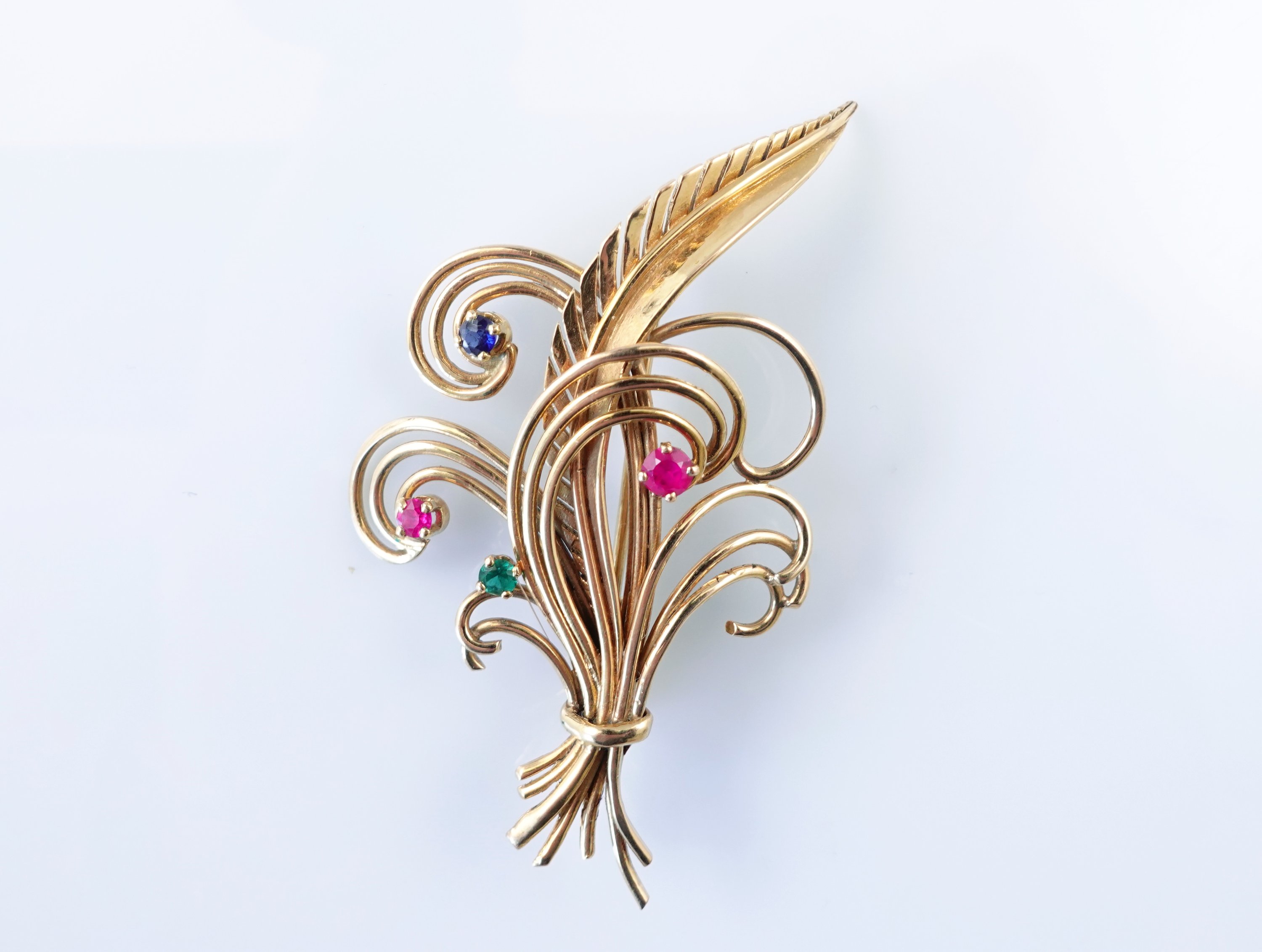en or jaune 750 millièmes sertie de deux rubis, un saphir et une émeraude.