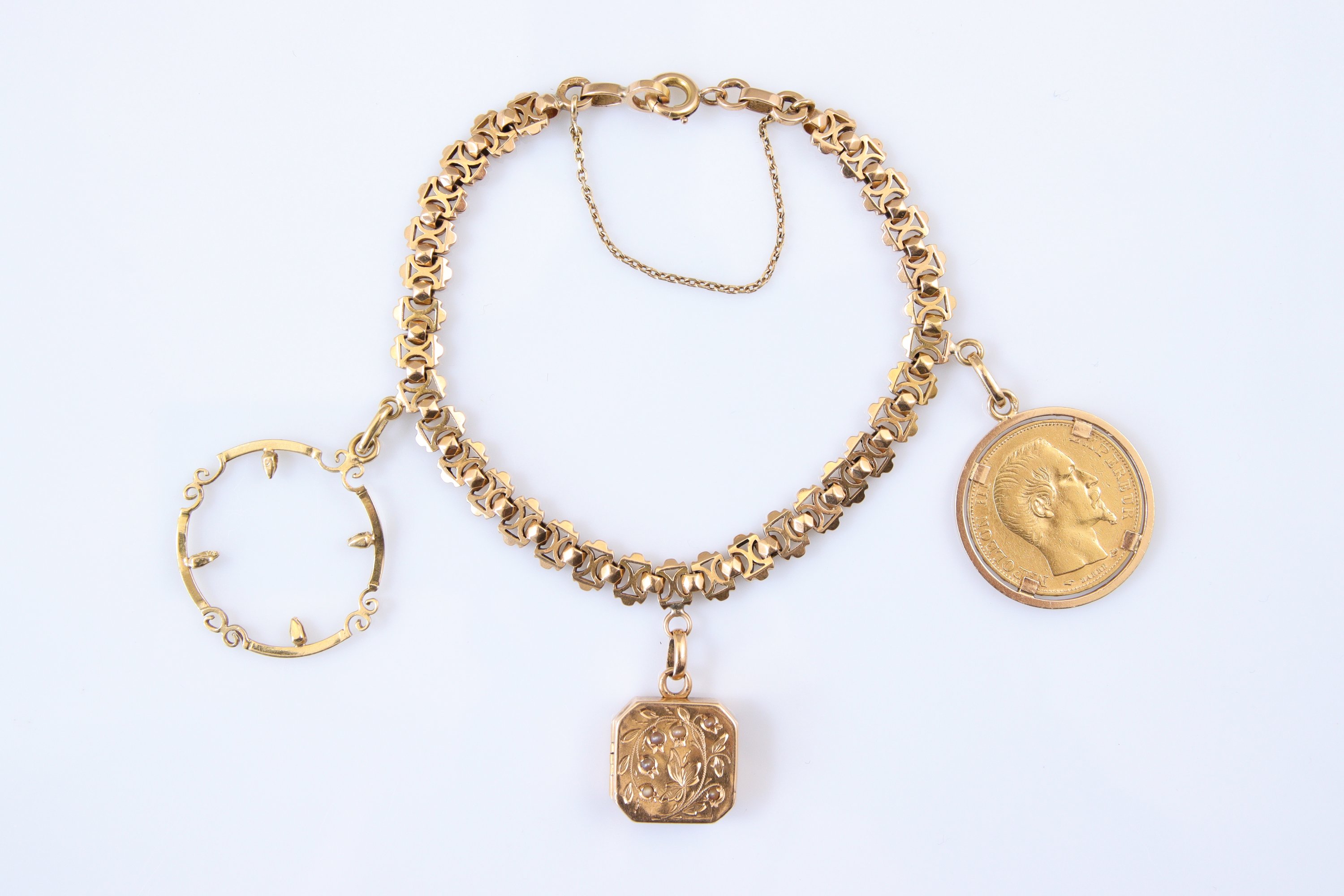 en or jaune 750 millièmes serti d'une pièce de 20 francs or Napoléon tête nue de 1857, d'une breloque porte-photo et d'un autre emplacement pour une pièce.