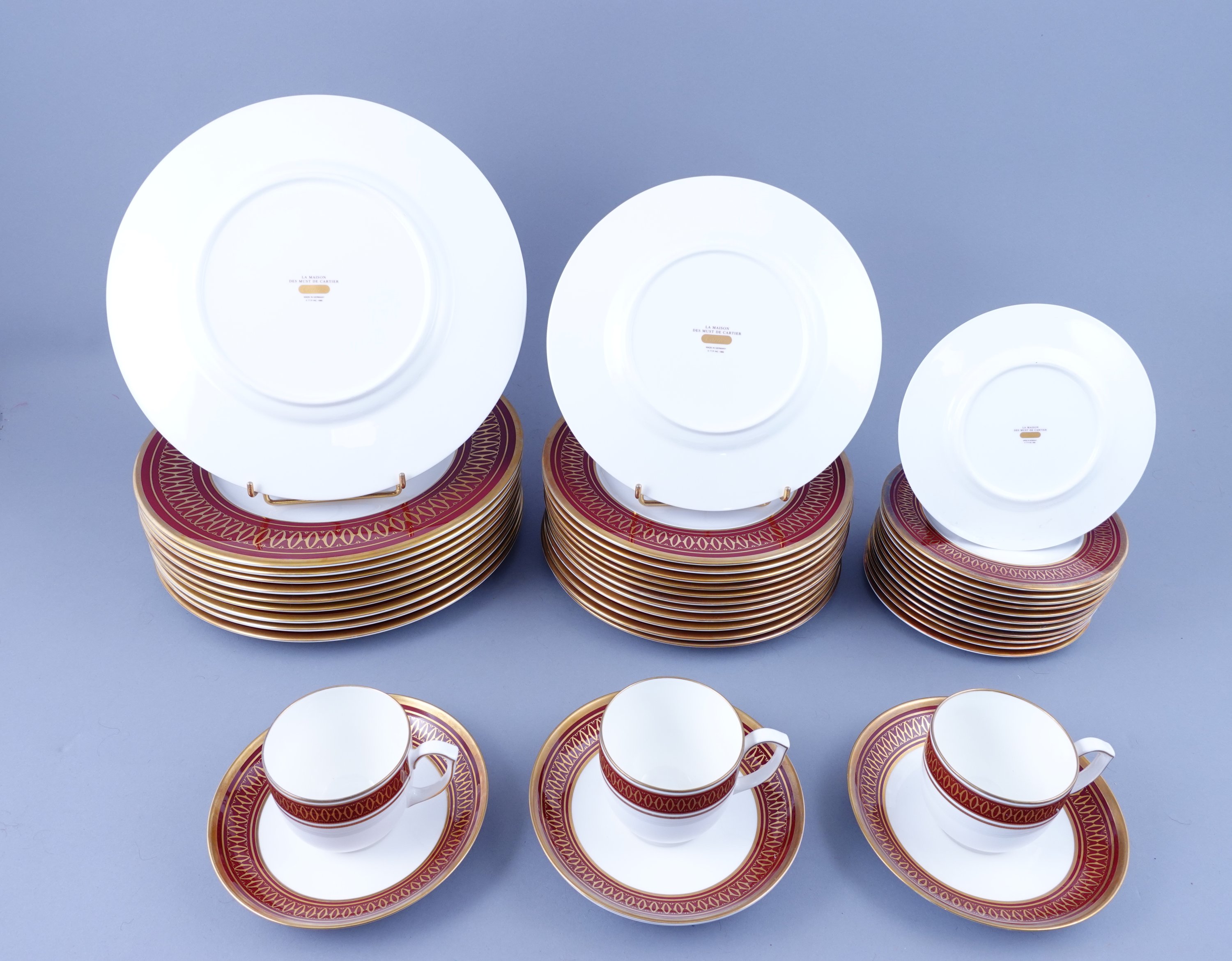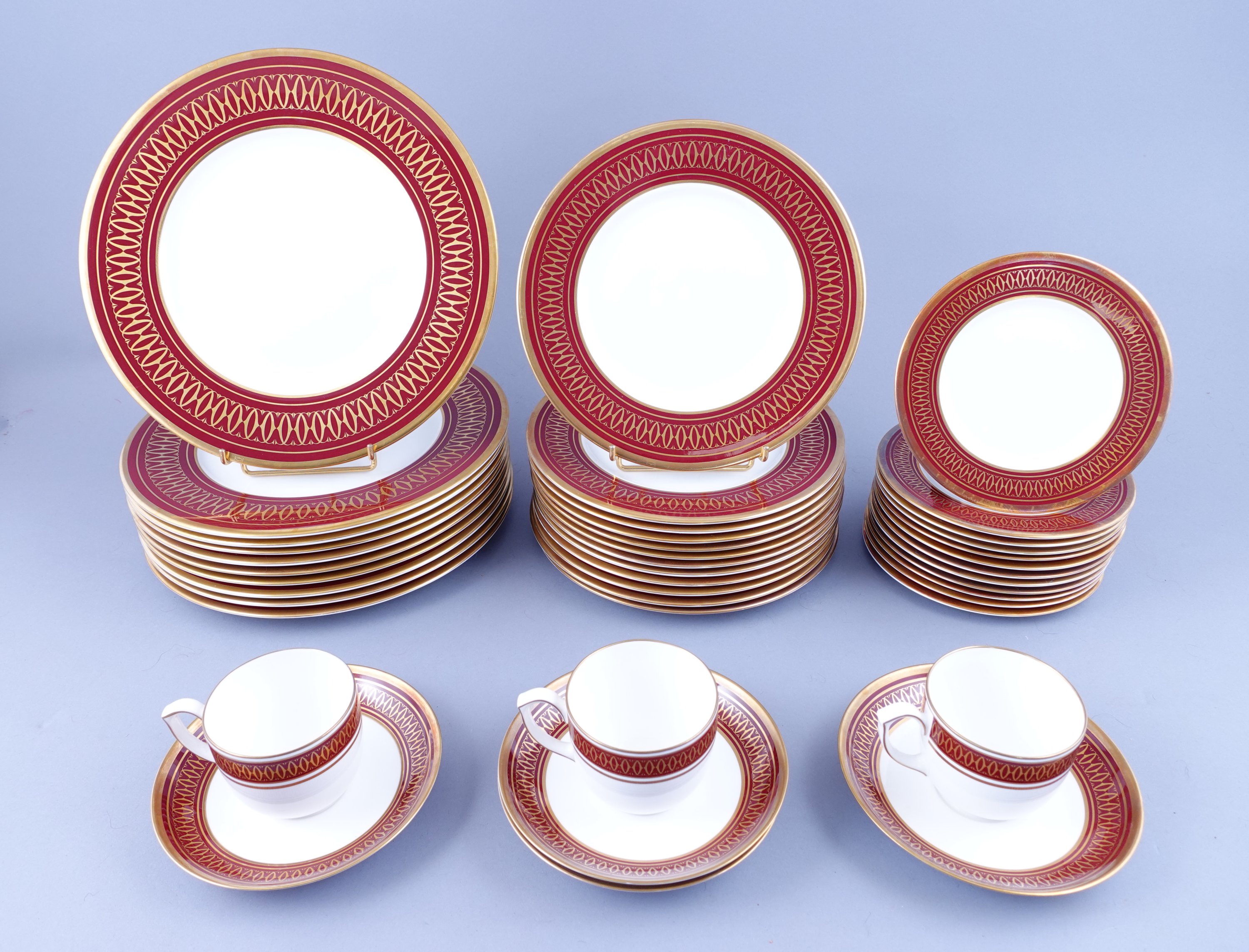 en porcelaine émaillée blanche, à la bordure carmin rehaussée de filets et entrelacs dorés. Il se compose de 12 assiettes à dessert, 12 assiettes à entremets et 10 assiettes de table, trois tasses et quatres soucoupes.