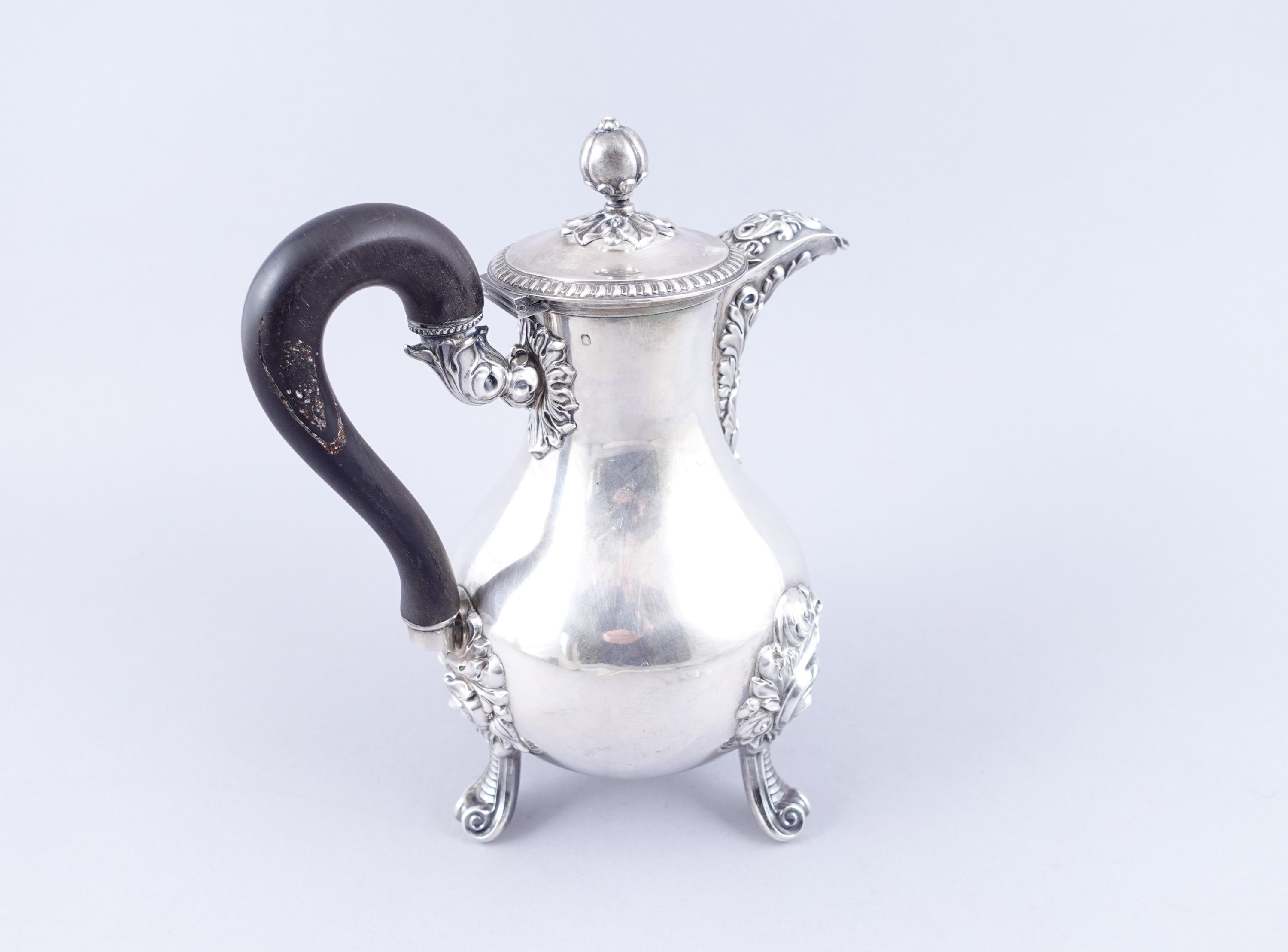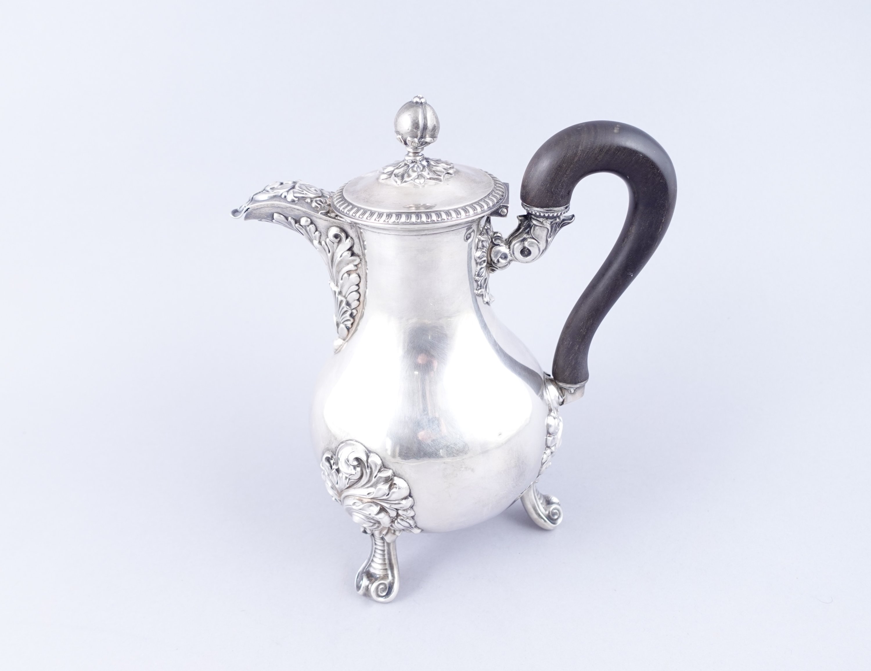 en argent, le fretel en grenade sur une terrasse de feuilles, le bec à décor de feuilles d'acanthe. Piétement tripode à enroulements. Anse en bois noirci.