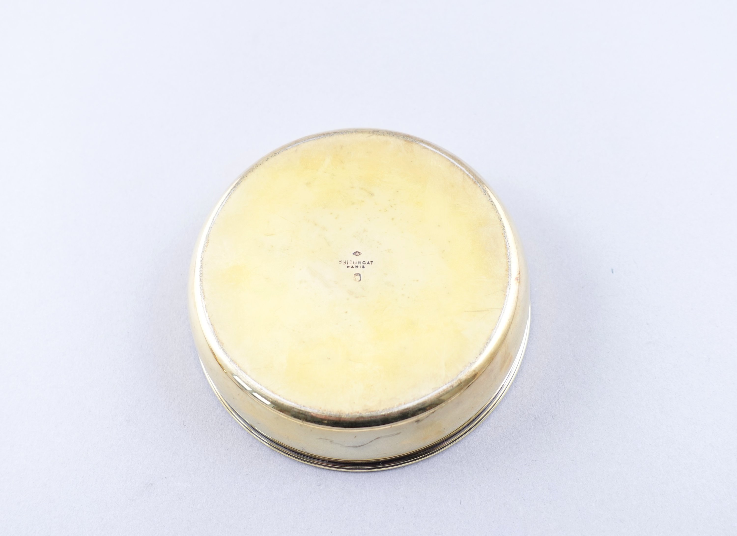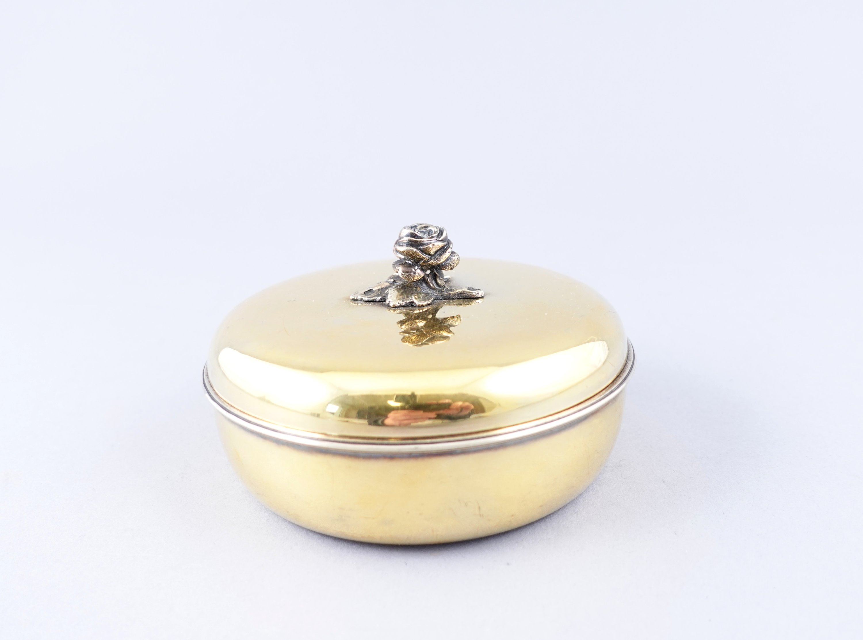 en vermeil, de forme circulaire, au couvercle sommé d'un fretel en forme de rose sur une terrasse végétale.
