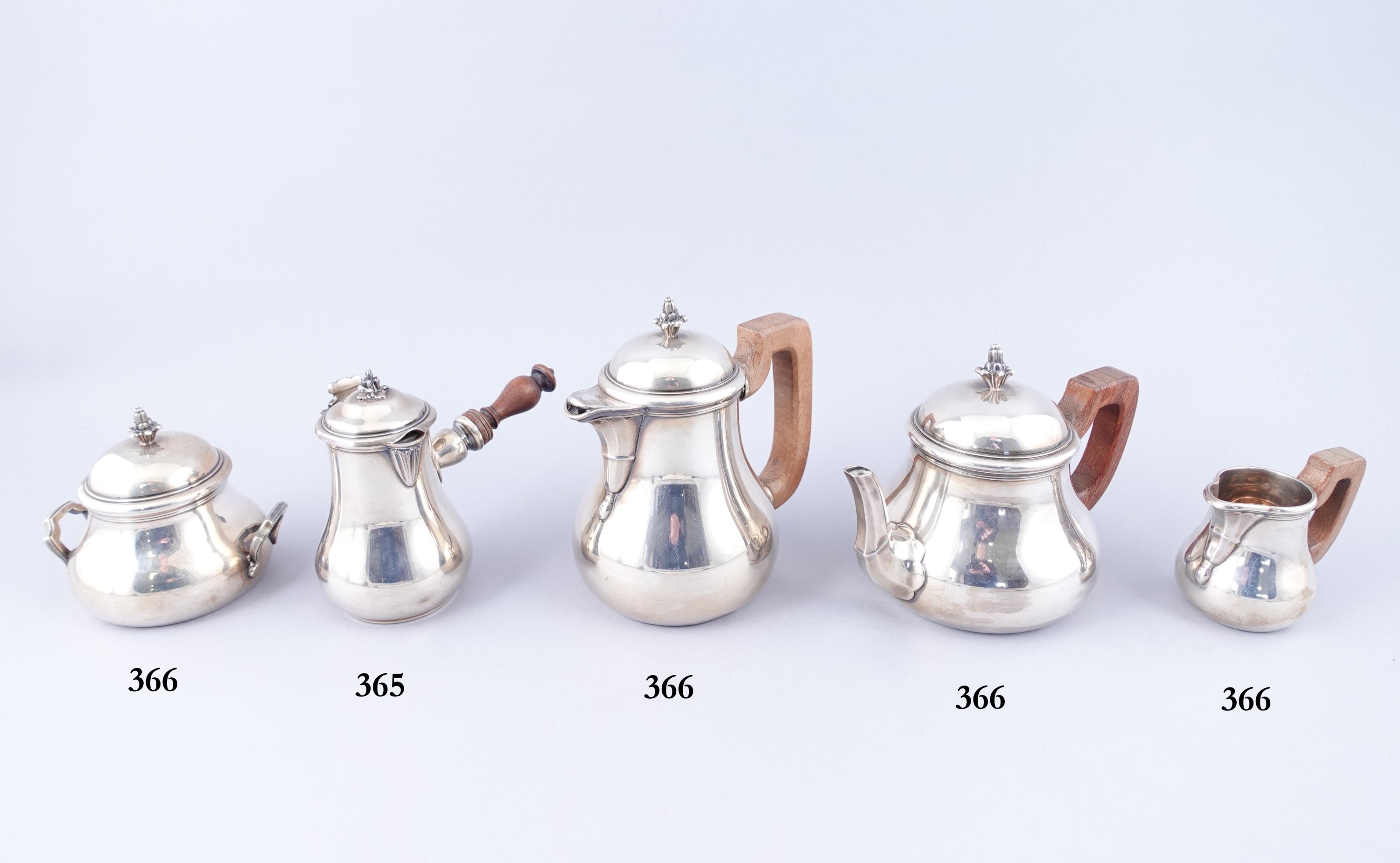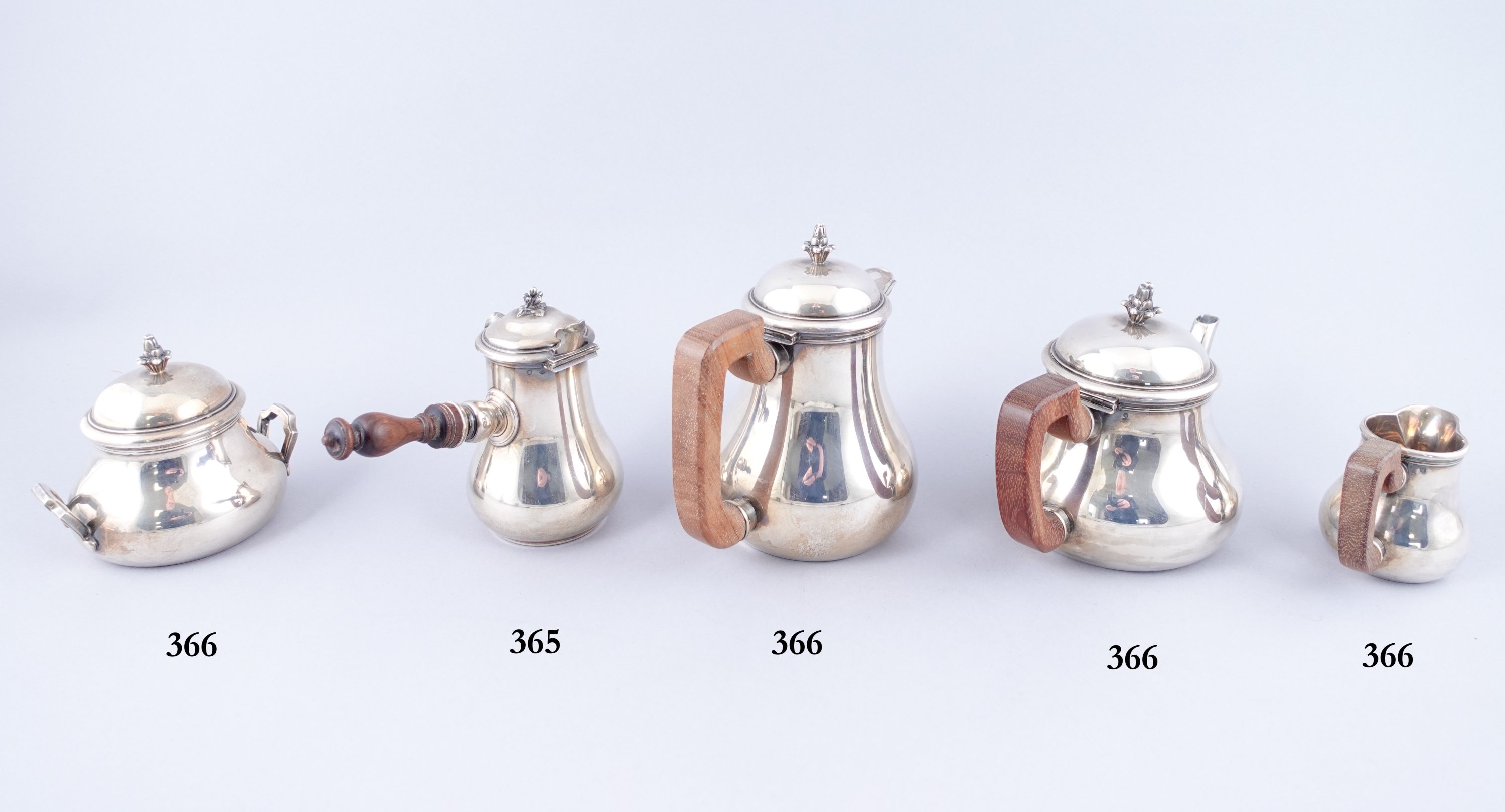 en argent à couvercle sommé d'un fretel de forme végétal. Anse en bois tourné.