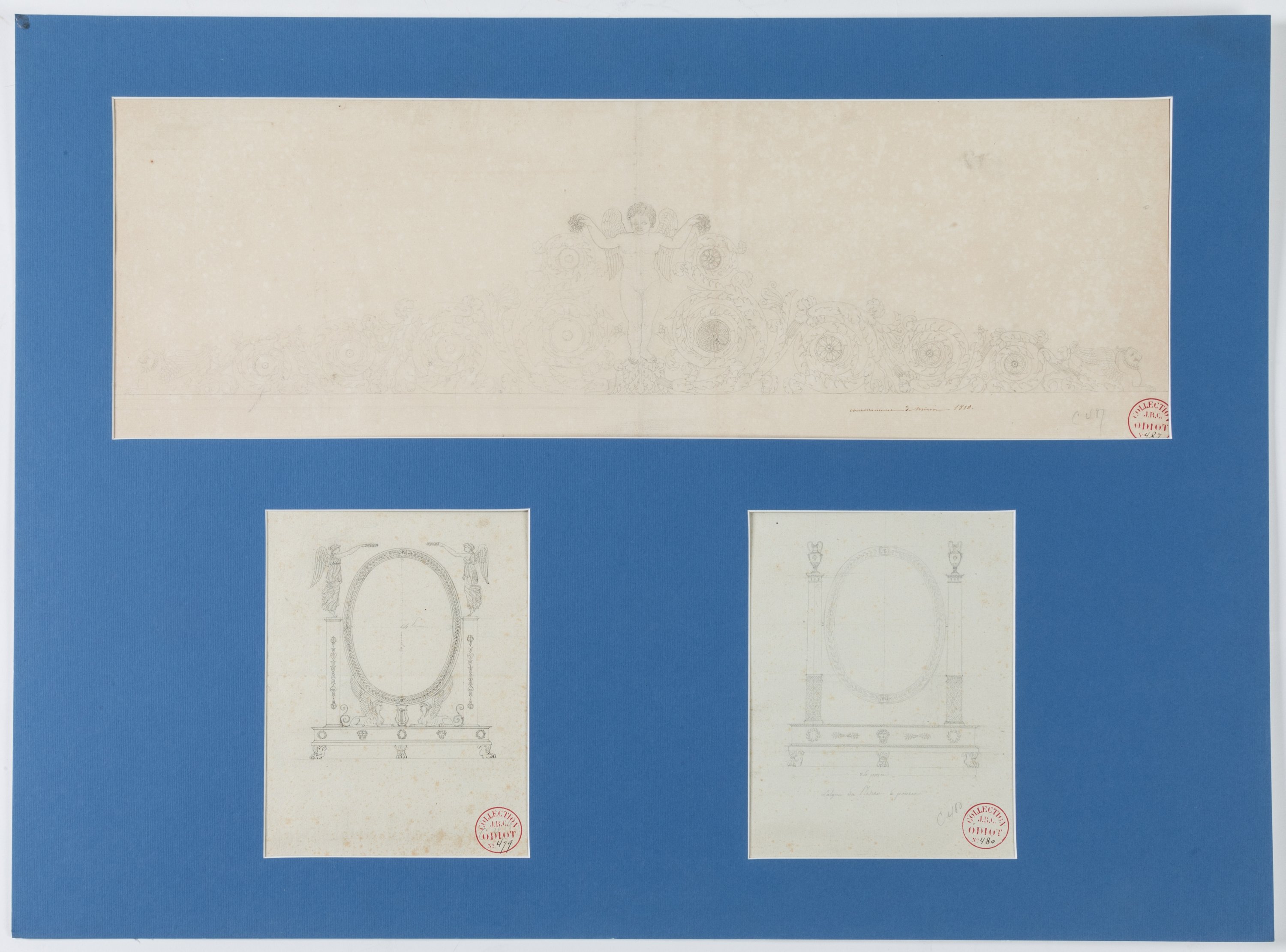 Ces dessins sont référencés dans les archives Odiot. Sous le numéro « 487 » est désigné un « Dessin au trait. Fronton de grande glace Amour debout entre des rinceaux décroissants, extrémités lions ailés. Annoté couronnement de miroir 1810 ». Le numéro « 479 » présente un « Petit dessin au trait. Grande glace - socle sur trois griffes, bandeau appliques, mascarons et couronnes très espacées: au dessus, une lyre au centre flanqué de deux sphinx accroupis. Latéralement, deux pylones carrés sommés de deux femmes ailées se regardant et tendant des couronnes. Miroir ovale, branches lauriers et rosaces ». Enfin le numéro « 480 » décrit un « Petit croquis au crayon. Grande glace socle bas sur trois griffes, bandeau mascaron, double palmettes et couronnes. Deux pylones, décorés d’imbrications et sommés de deux vases à anses. Cadre ovale, branches lauriers et rosacés ».