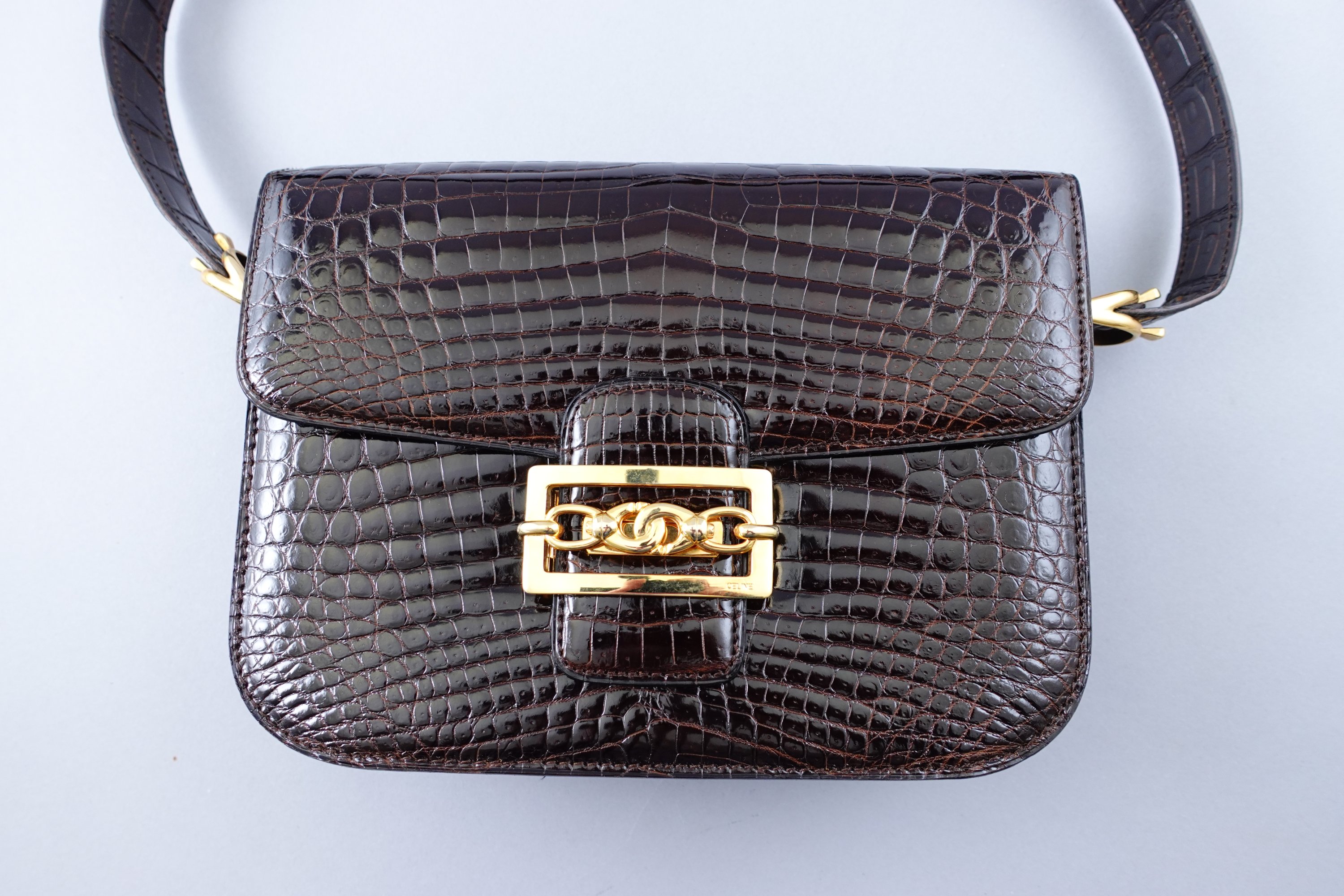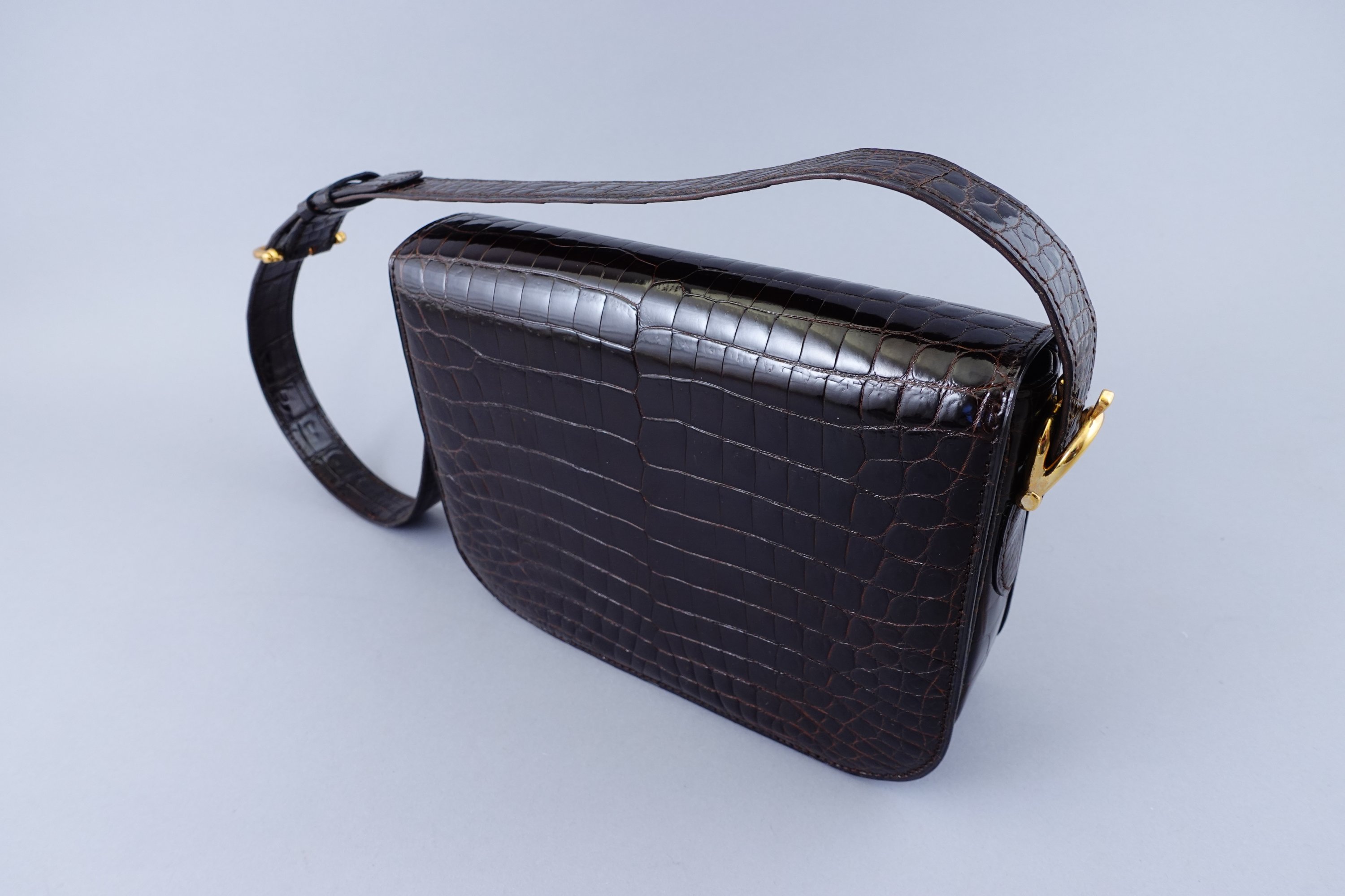 en crocodile brun à 3 soufflets. Fermeture dorée. Bandoulière réglable.