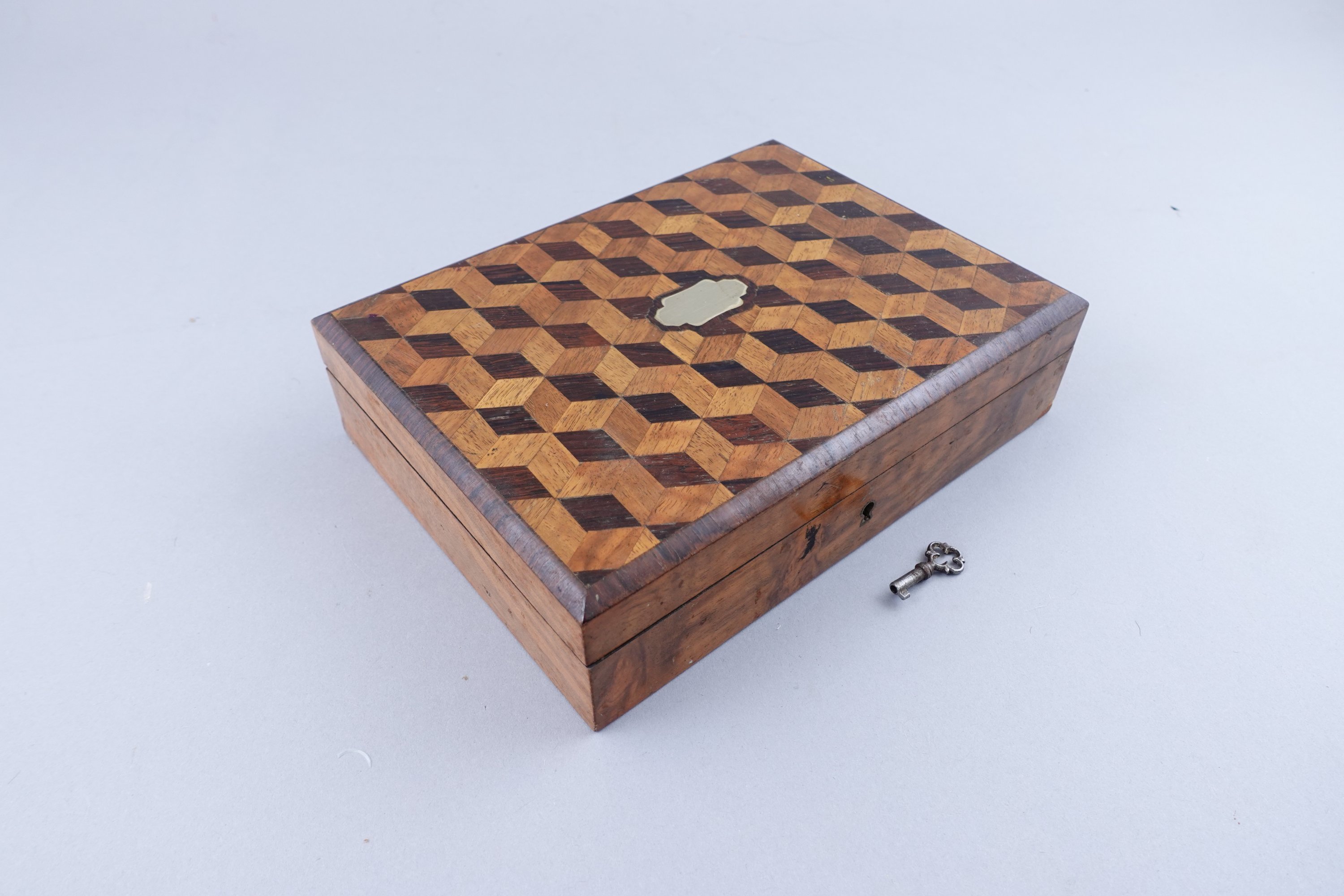 dans sa boîte en bois à marqueterie de cubes, comprenant des pinceaux, blocs d'aquarelle et deux petits pots à eaux.