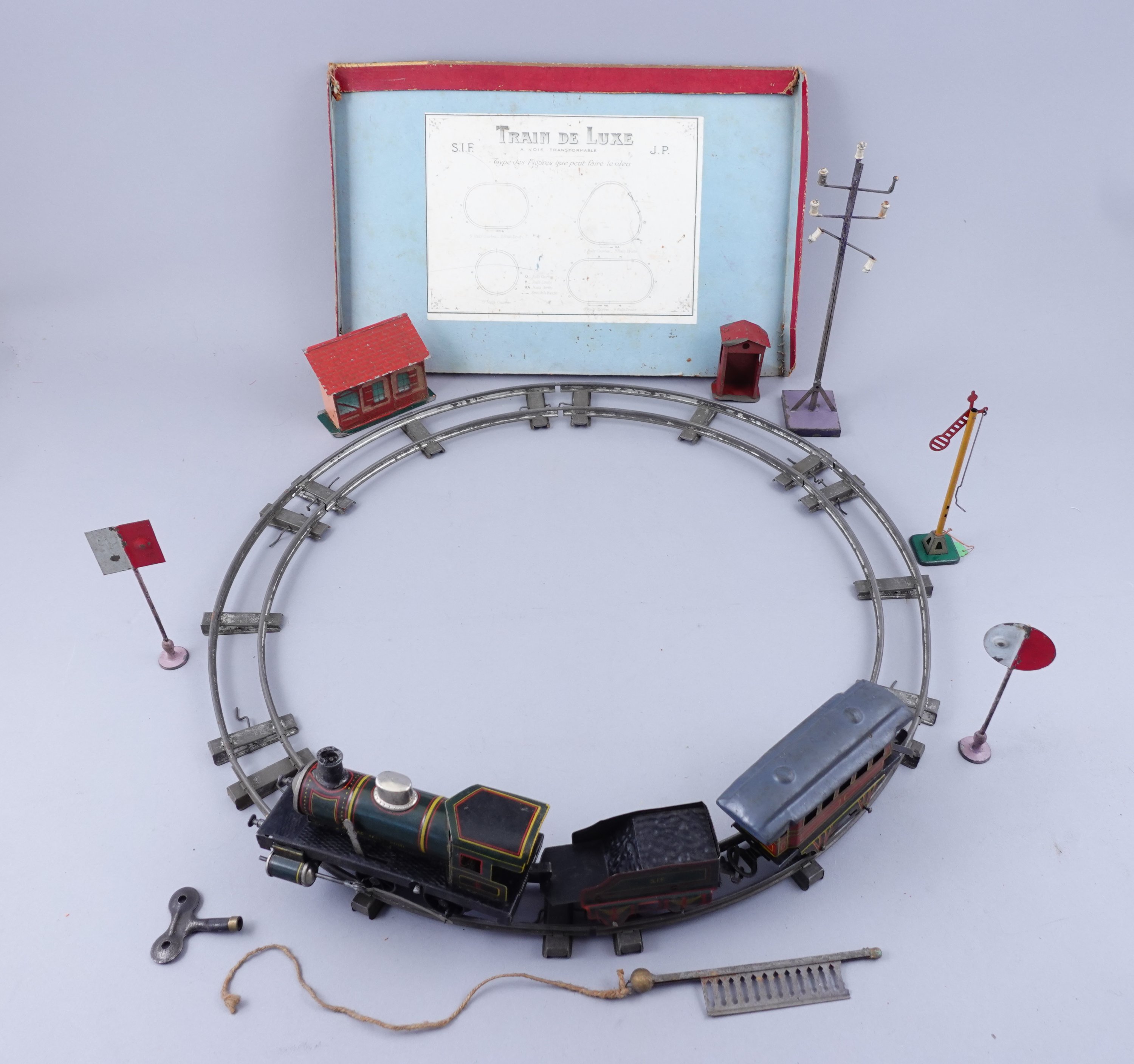 - "Le Jouet de Paris", une boîte de la collection "Train de luxe et circuit transformable", vers 1930, une locomotive mécanique type 020 à écart 0, verte et noire avec liserets doré et rouge avec tender, une voiture à essieux, six rails courbes, siglés "S.I.F" et "J.P", un passage à niveau et une cabine de gare. Long. 44 Larg. 28 cm pour la boîte.