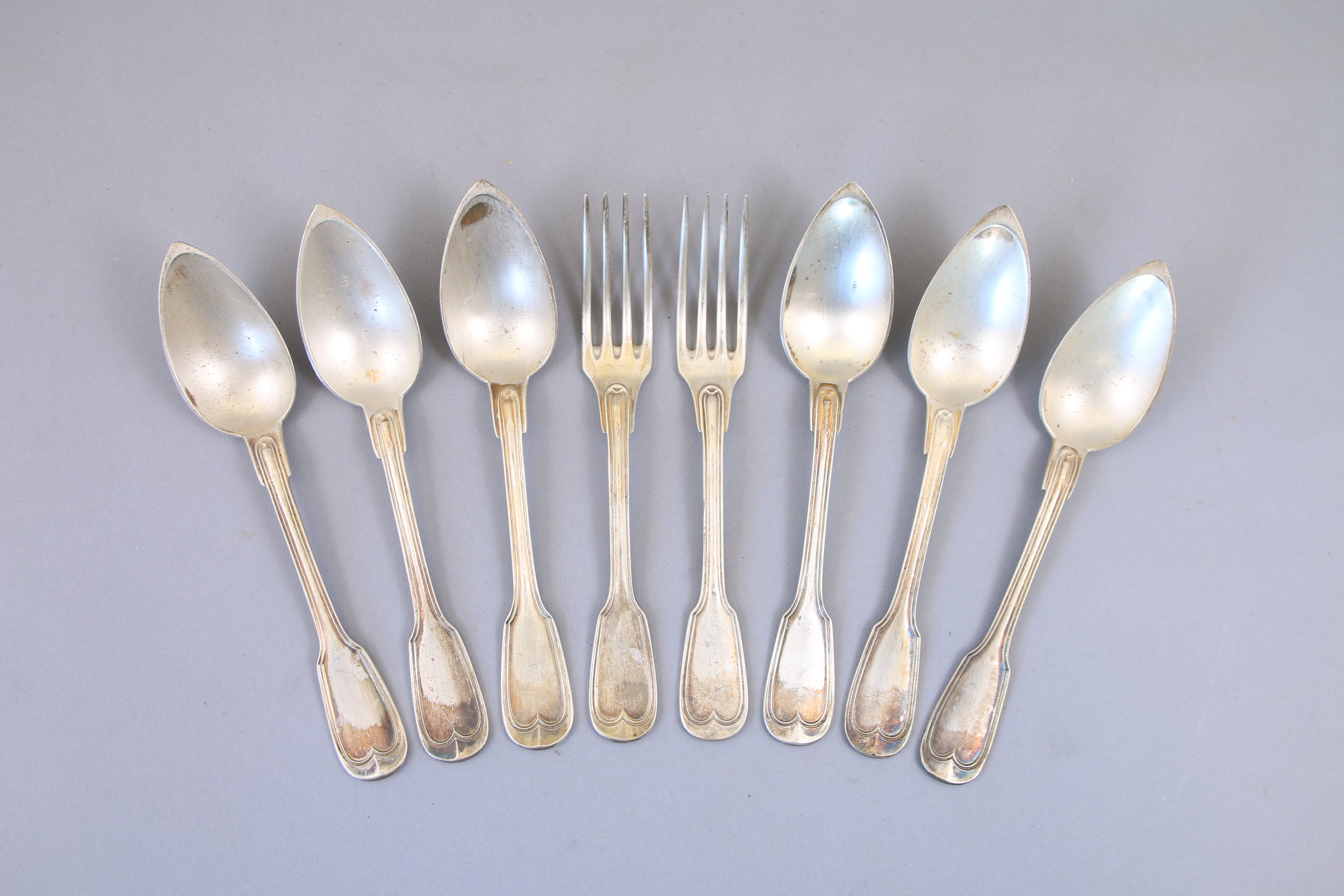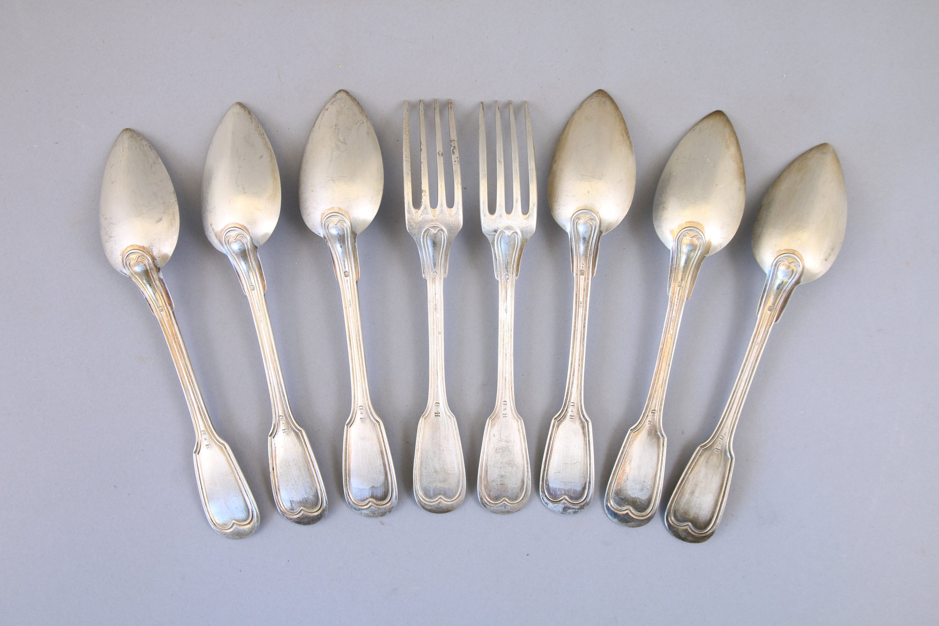 - Une fourchette en argent, modèle à filet coquille. Poinçon Vieillard (1819-1838). Poids: 81 g.