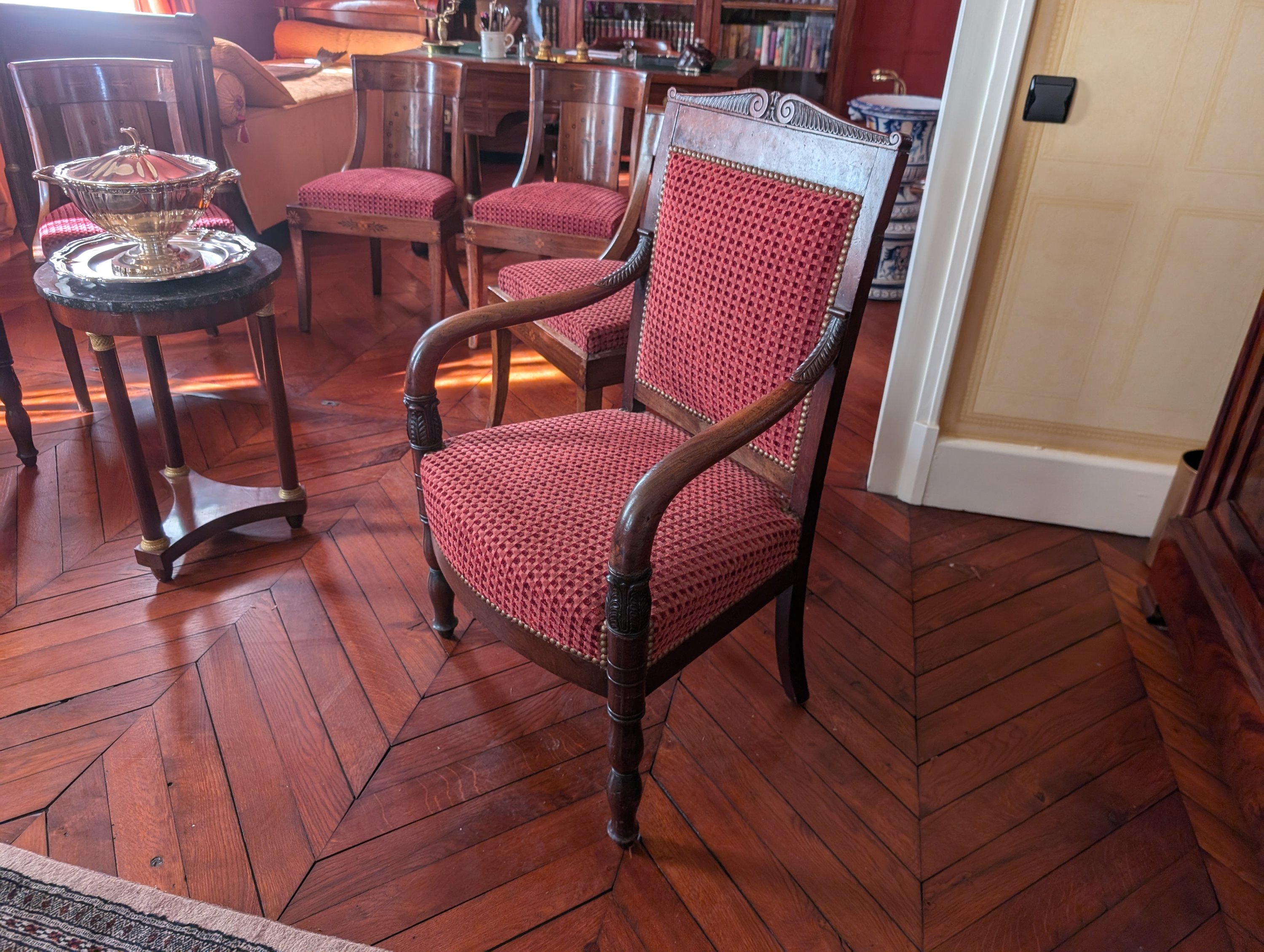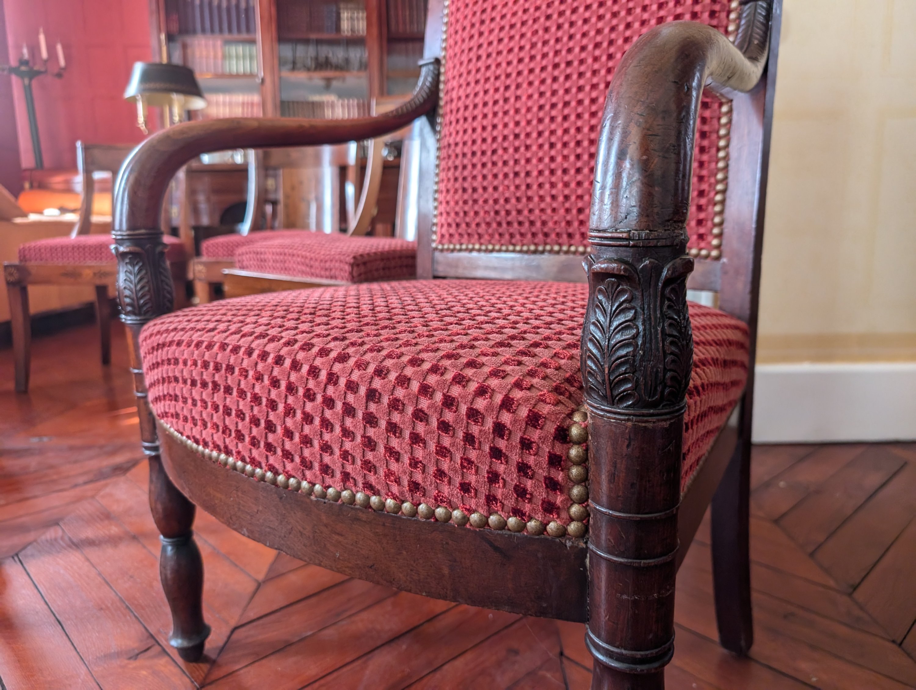 en acajou mouluré et sculpté à dossier droit présentant à l'amortissement un fronton à deux enroulements, les accotoirs à décor de feuilles d'eau se prolongeant sur les supports d'accotoir. Les pieds antérieurs dits "Jacob" et les postérieurs sabres.