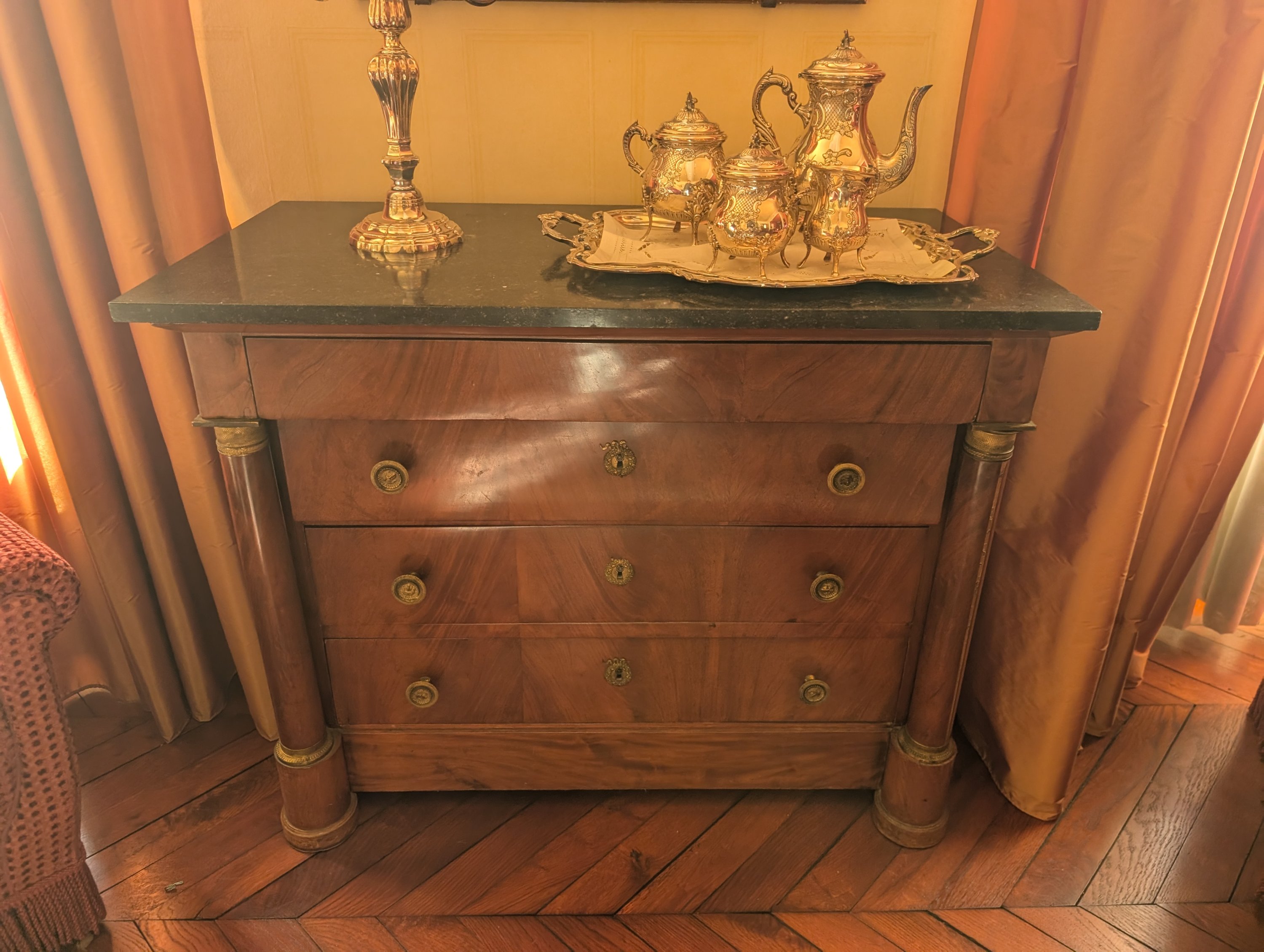 en acajou et placage d'acajou de forme rectangulaire ouvrant par quatre tiroirs sur quatre rangs. Dessus de marbre.