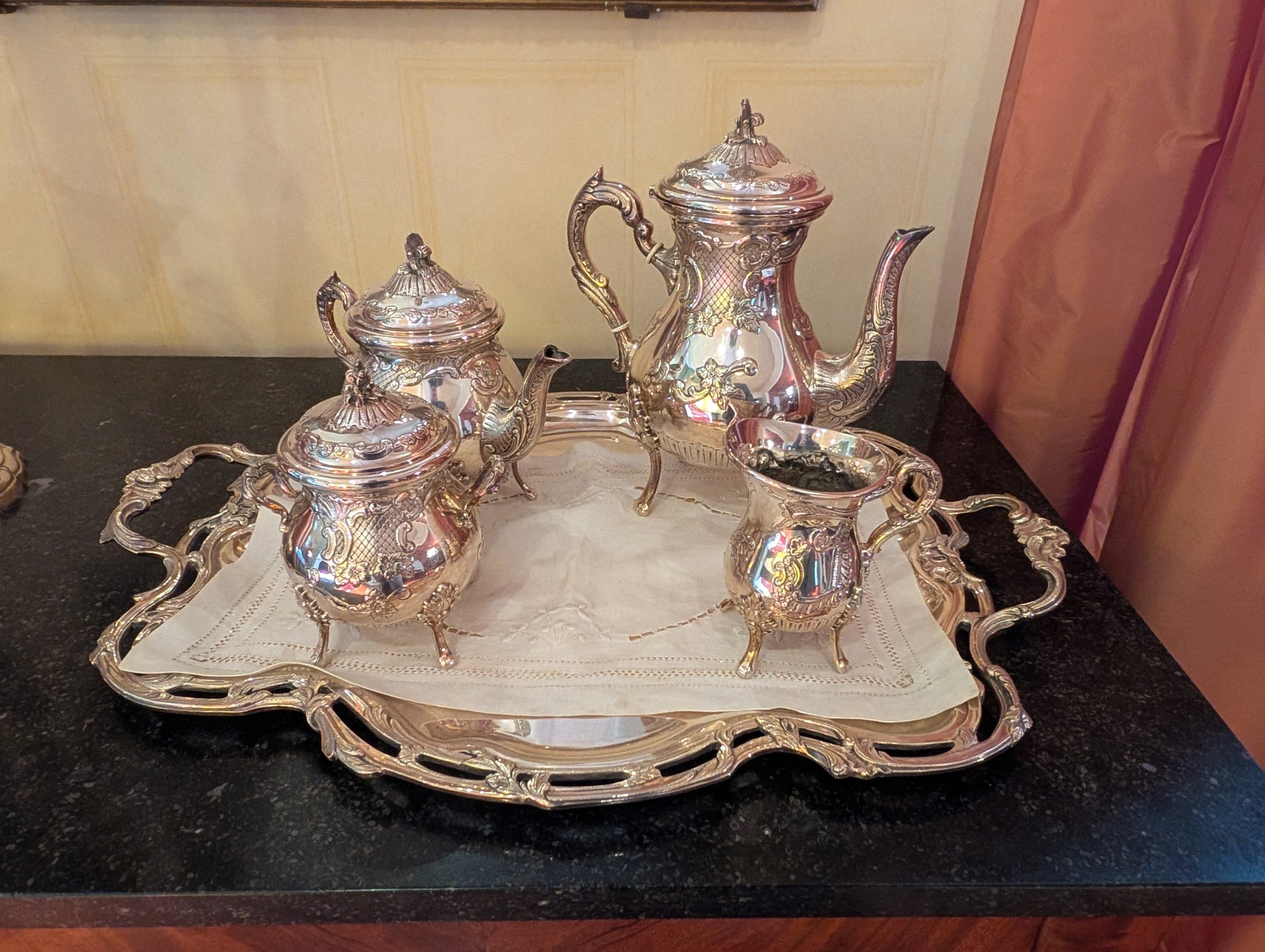 en métal argenté composé d'une théière, une cafetière, un sucrier, un pot à lait et un plateau.