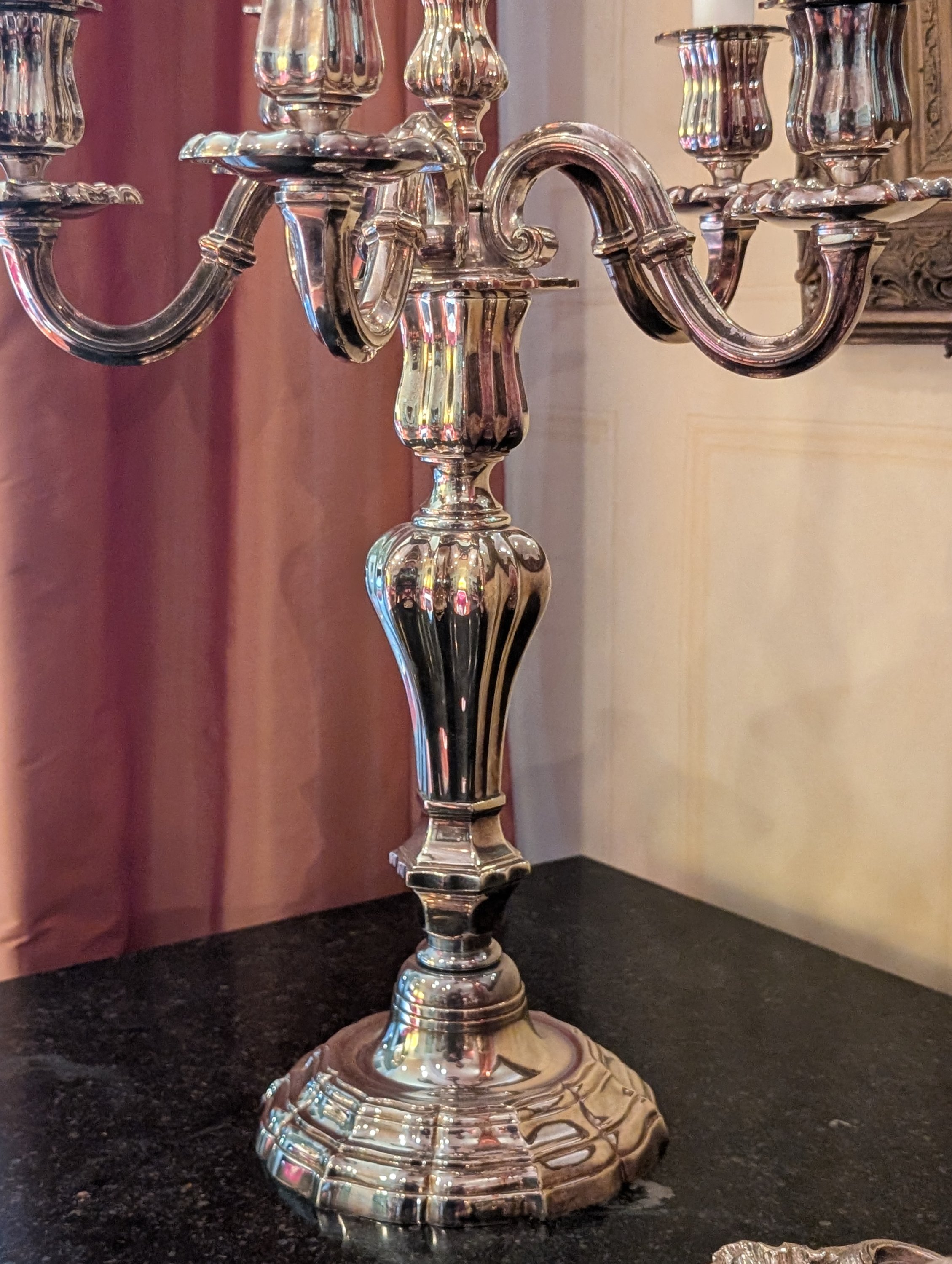 en métal argenté à six lumières reposant sur un fût à godrons.