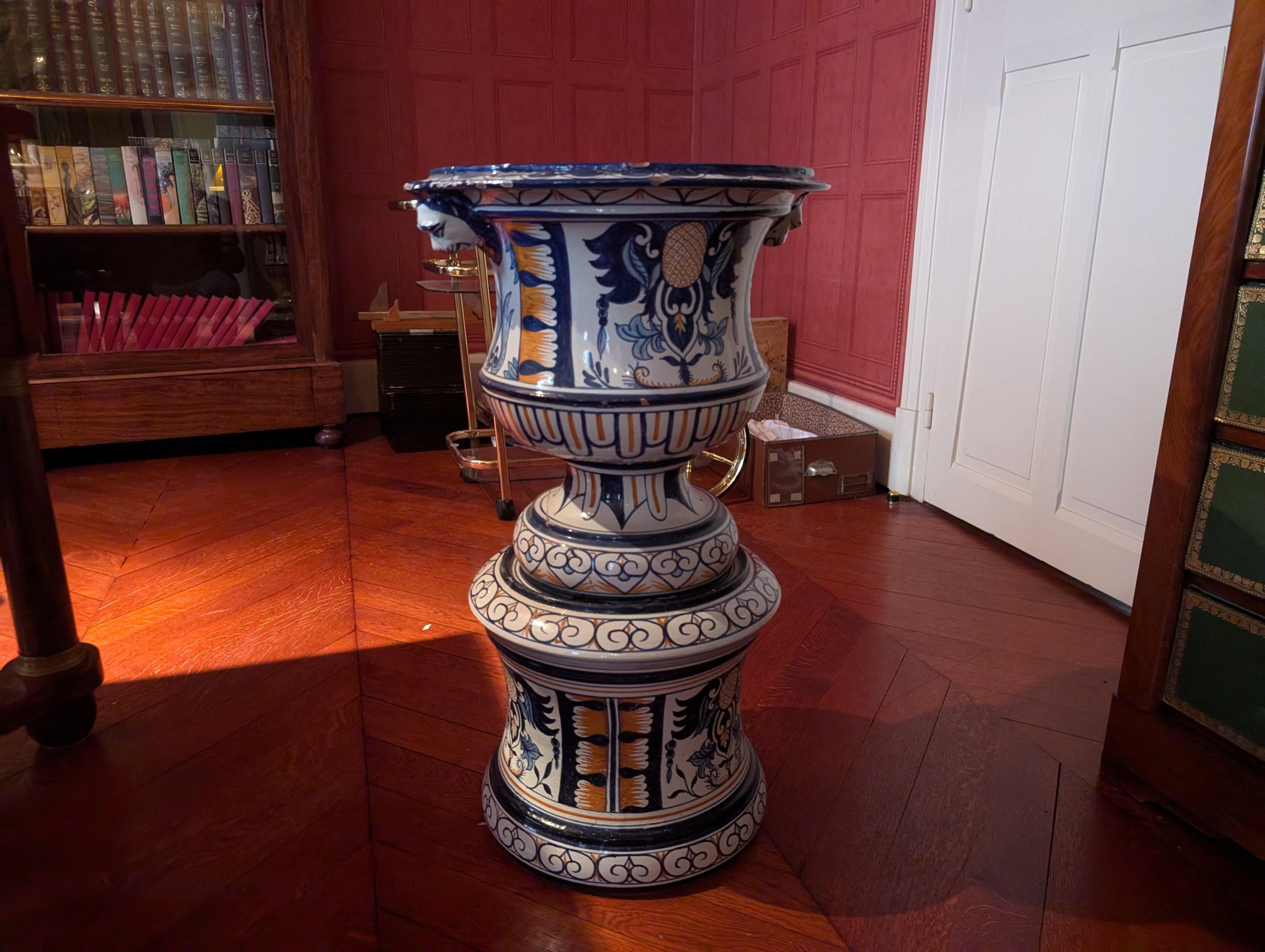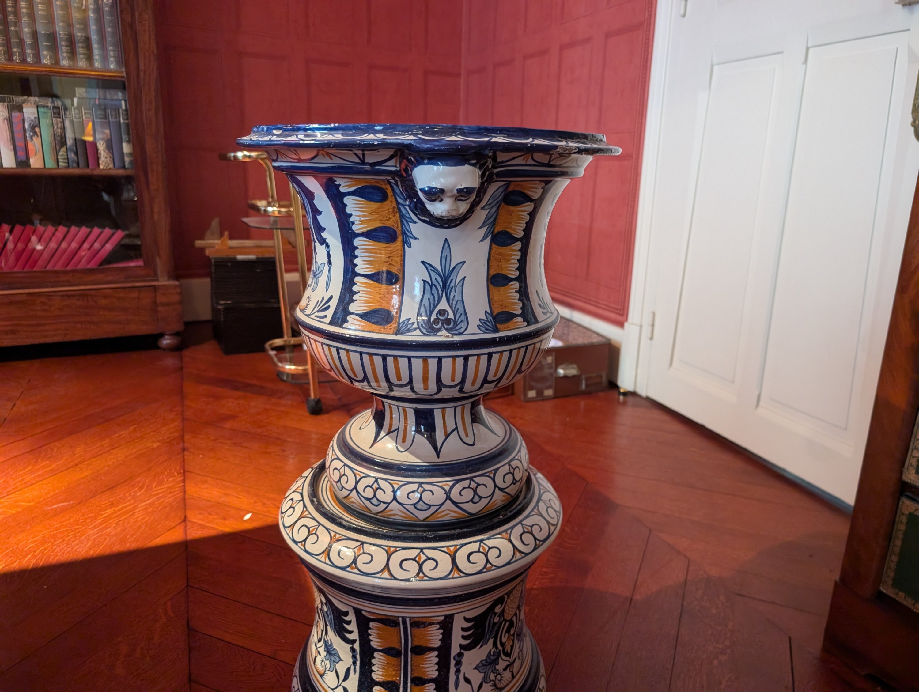 en faïence polychrome à décor de cartouches ornés de motifs végétaux. Les anses à décor de tête de lion.