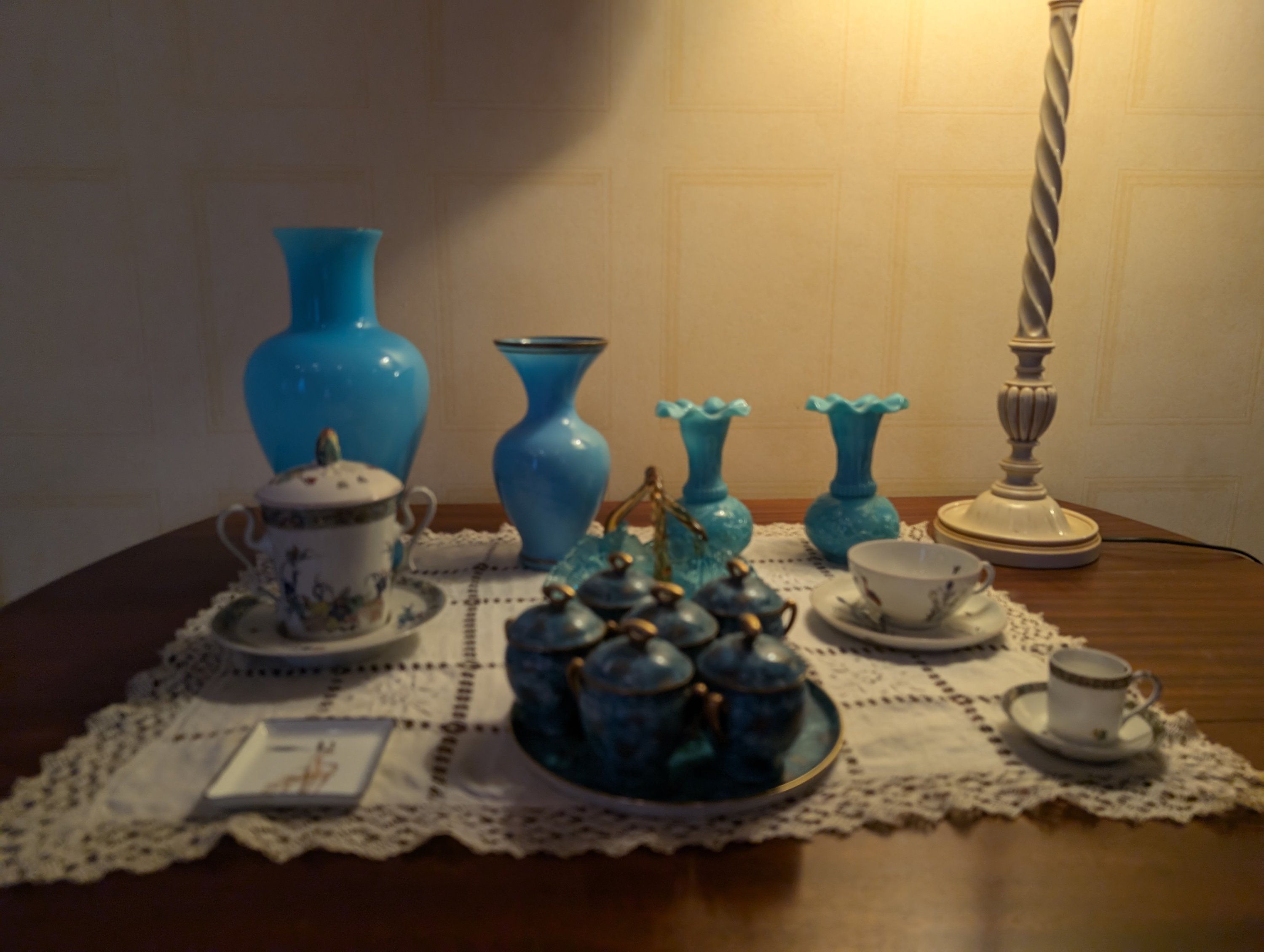 comprenant vases en opaline, tasses et leurs soucoupes, six pots à crème et leur plateau, lampe à fût torsadé.