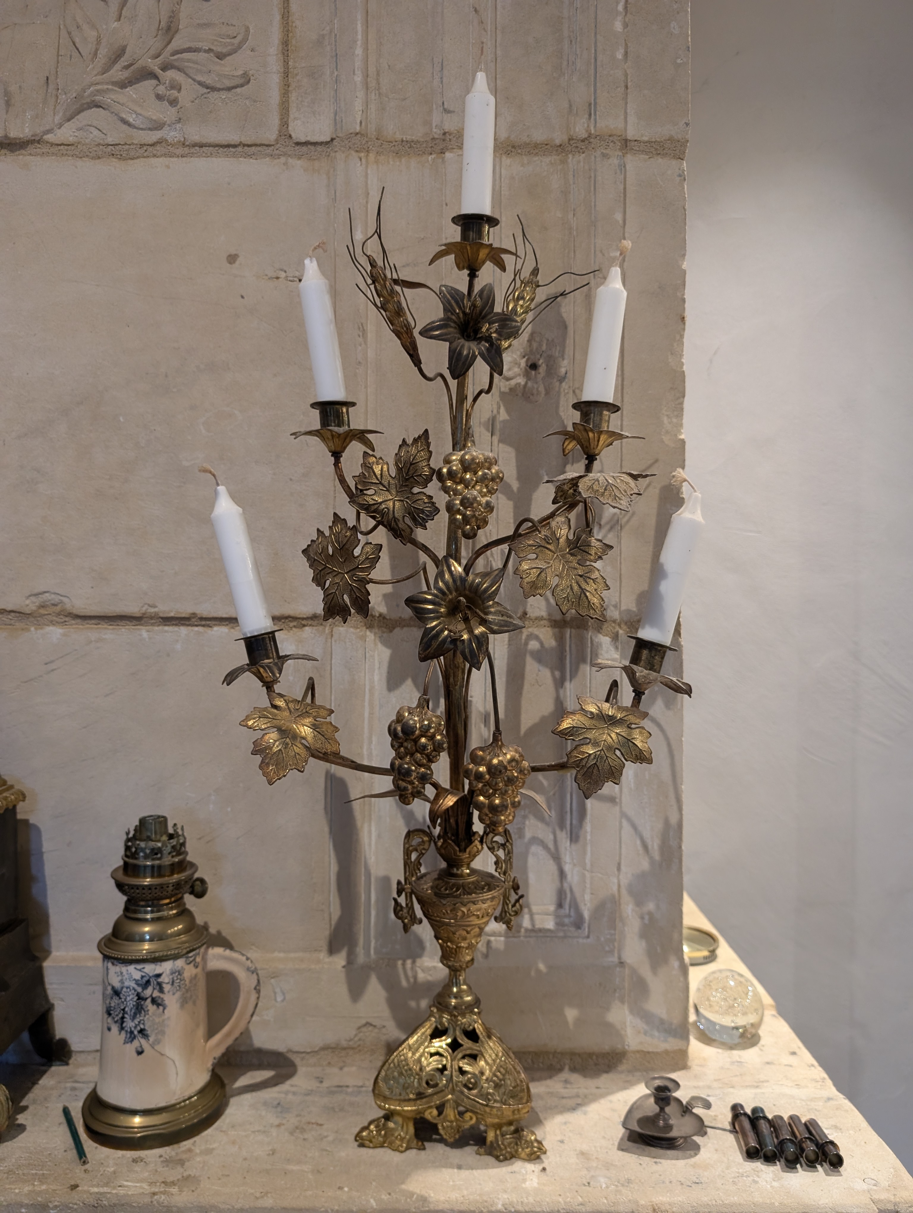 à cinq lumières à décor de pampres de vignes et épis de blé. La base à décor de vases reposant sur un piétement tripode.