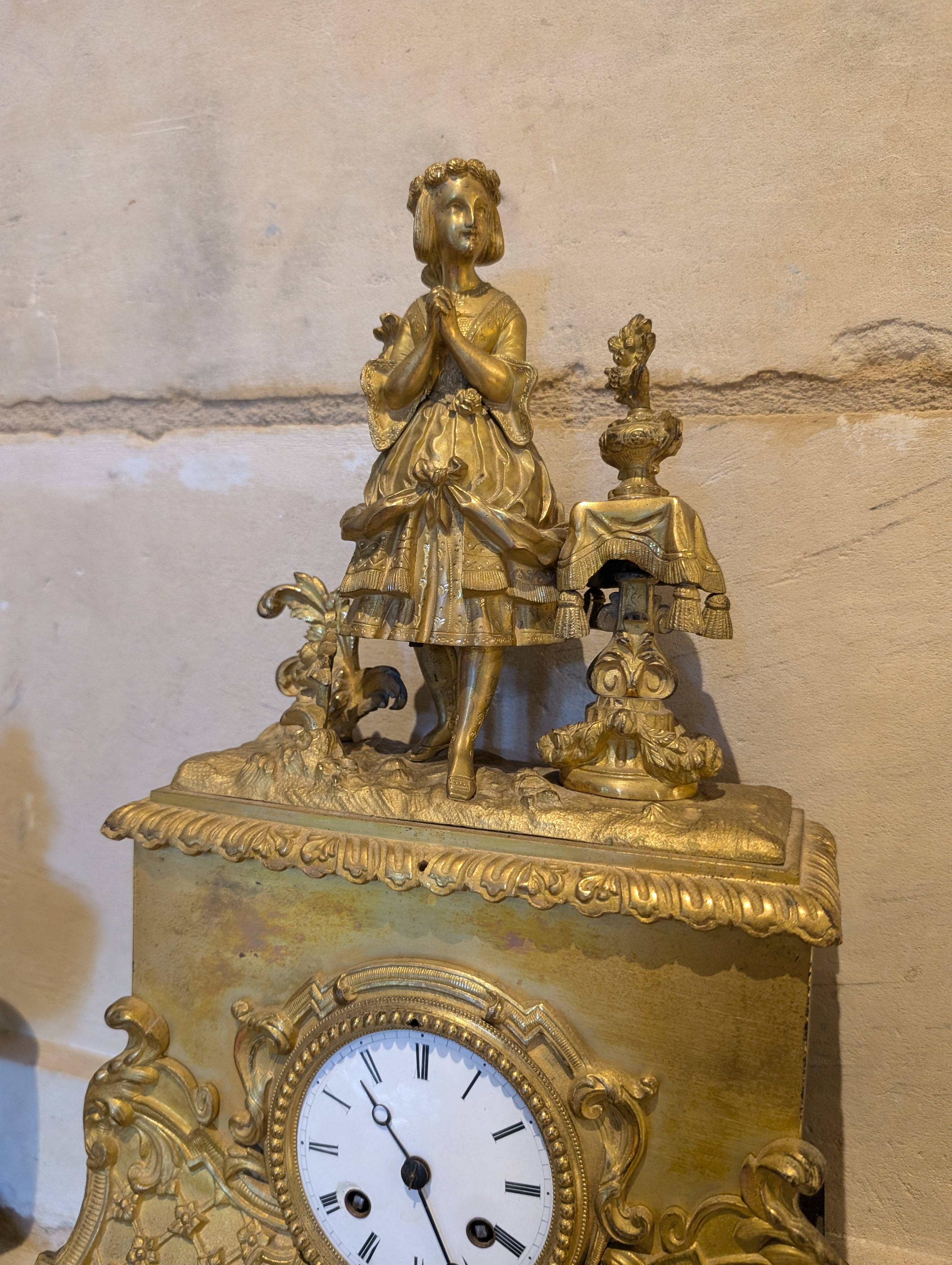 à cadran émaillé blanc indiquant les heures en chiffres romains, les minutes par un chemin de fer. Il est surmonté d'une jeune femme aux mains jointes auprès d'une table. Il surmonte un décor de croisillons. L'ensemble repose sur des pieds en enroulement.