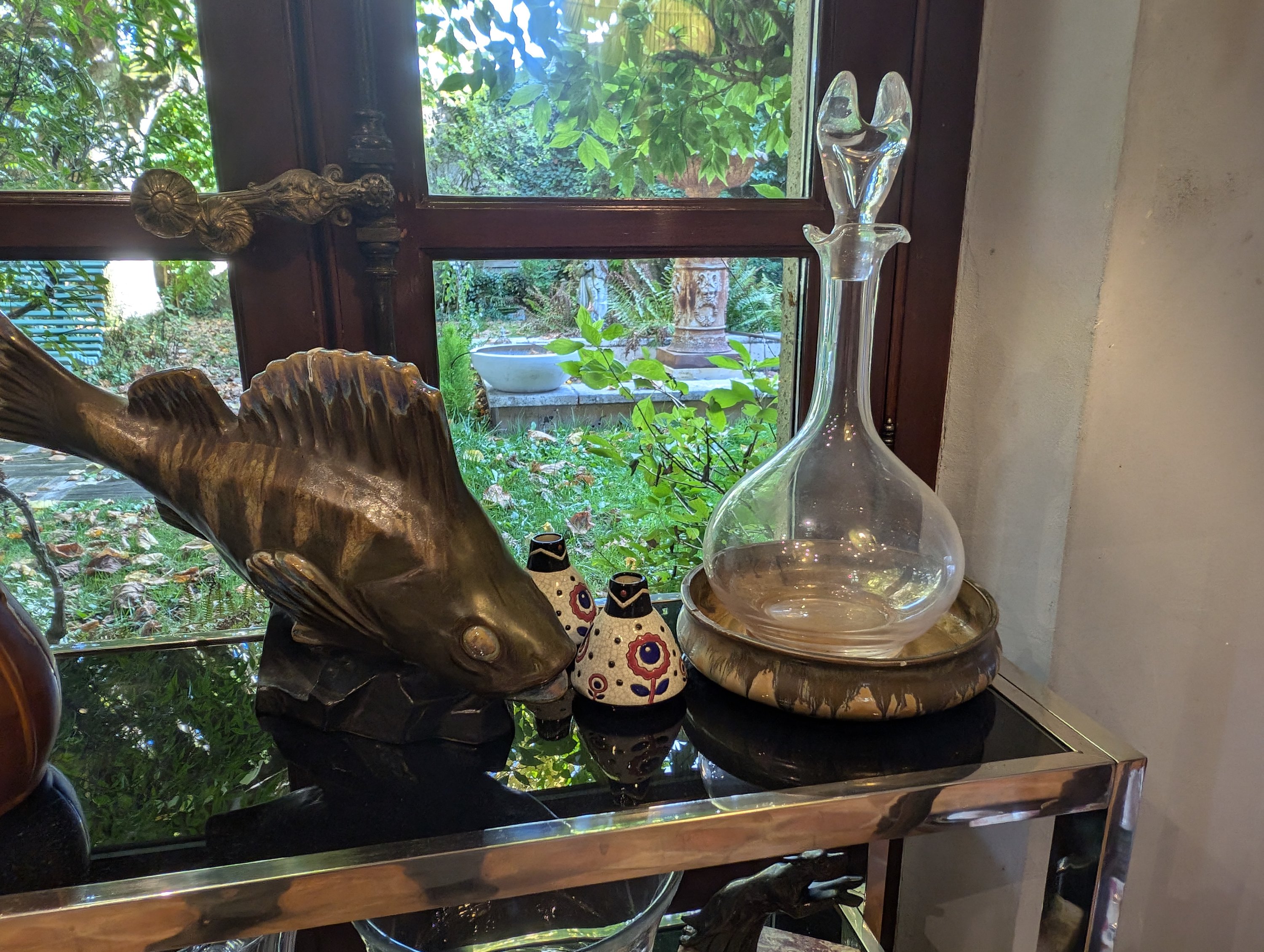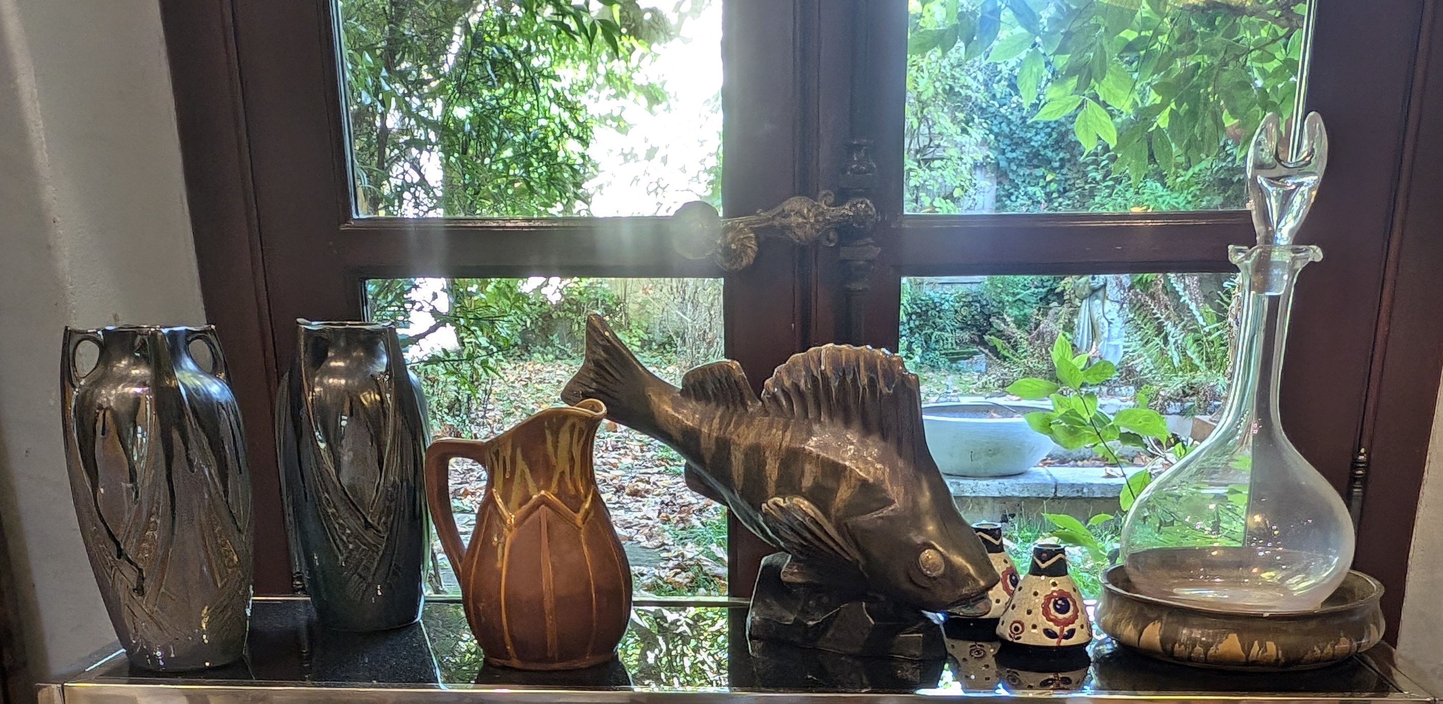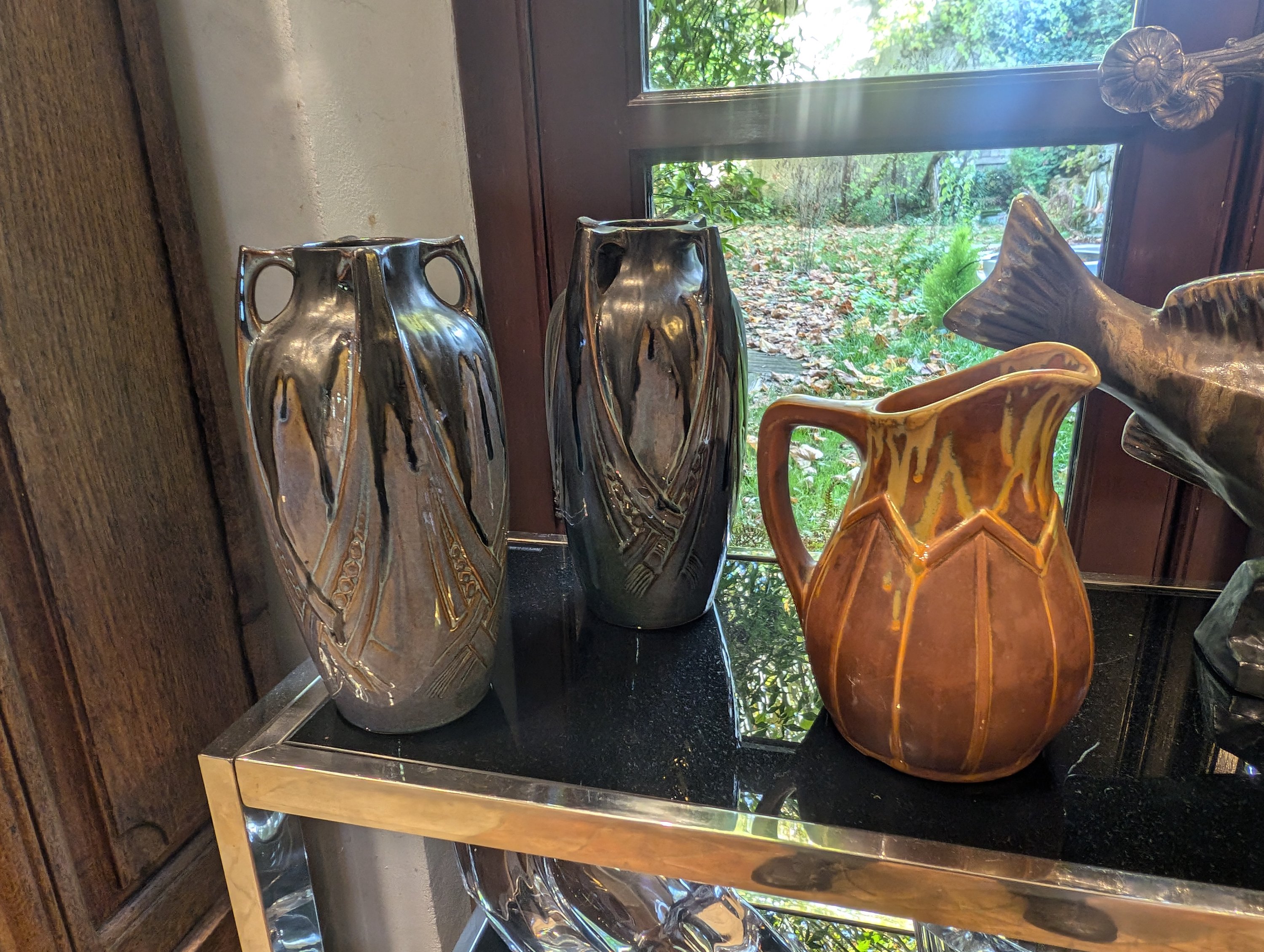 dont paire de vases à quatre anses, pichet, poisson, et carafe.