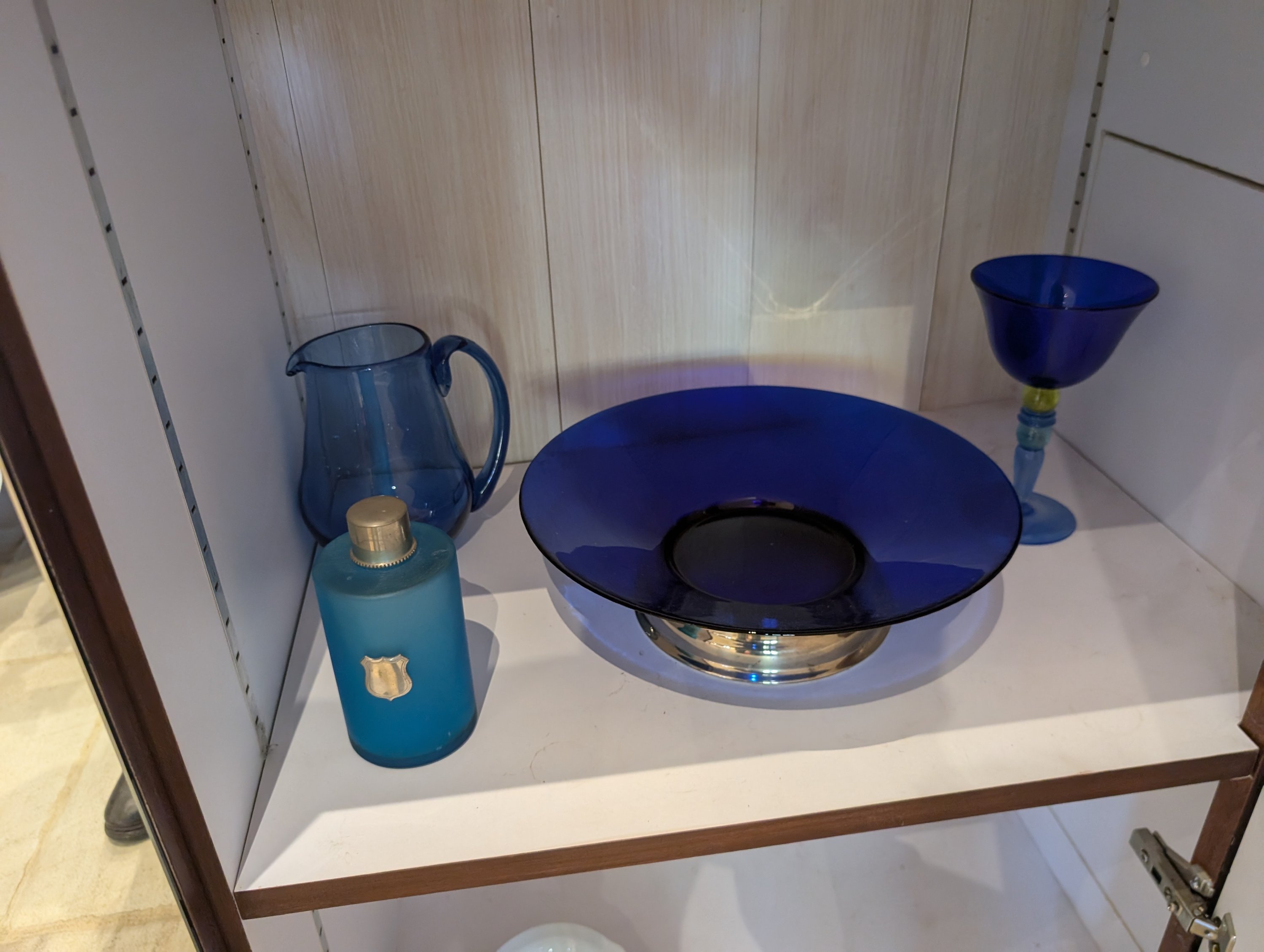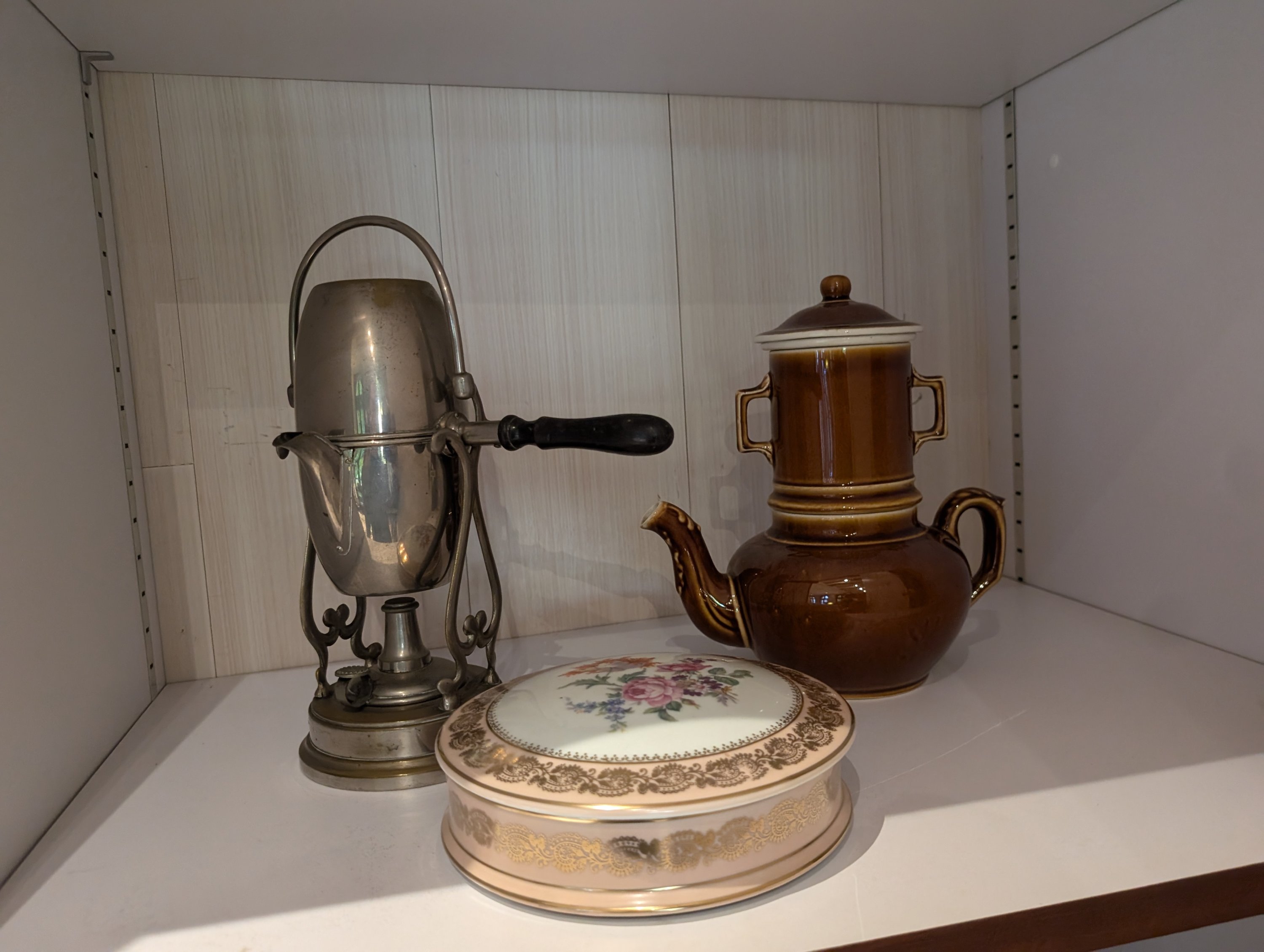 comprenant: un samovar en métal, une théière, une boîte en porcelaine, un service et son plateau, une coupe, un verre et un pichet.