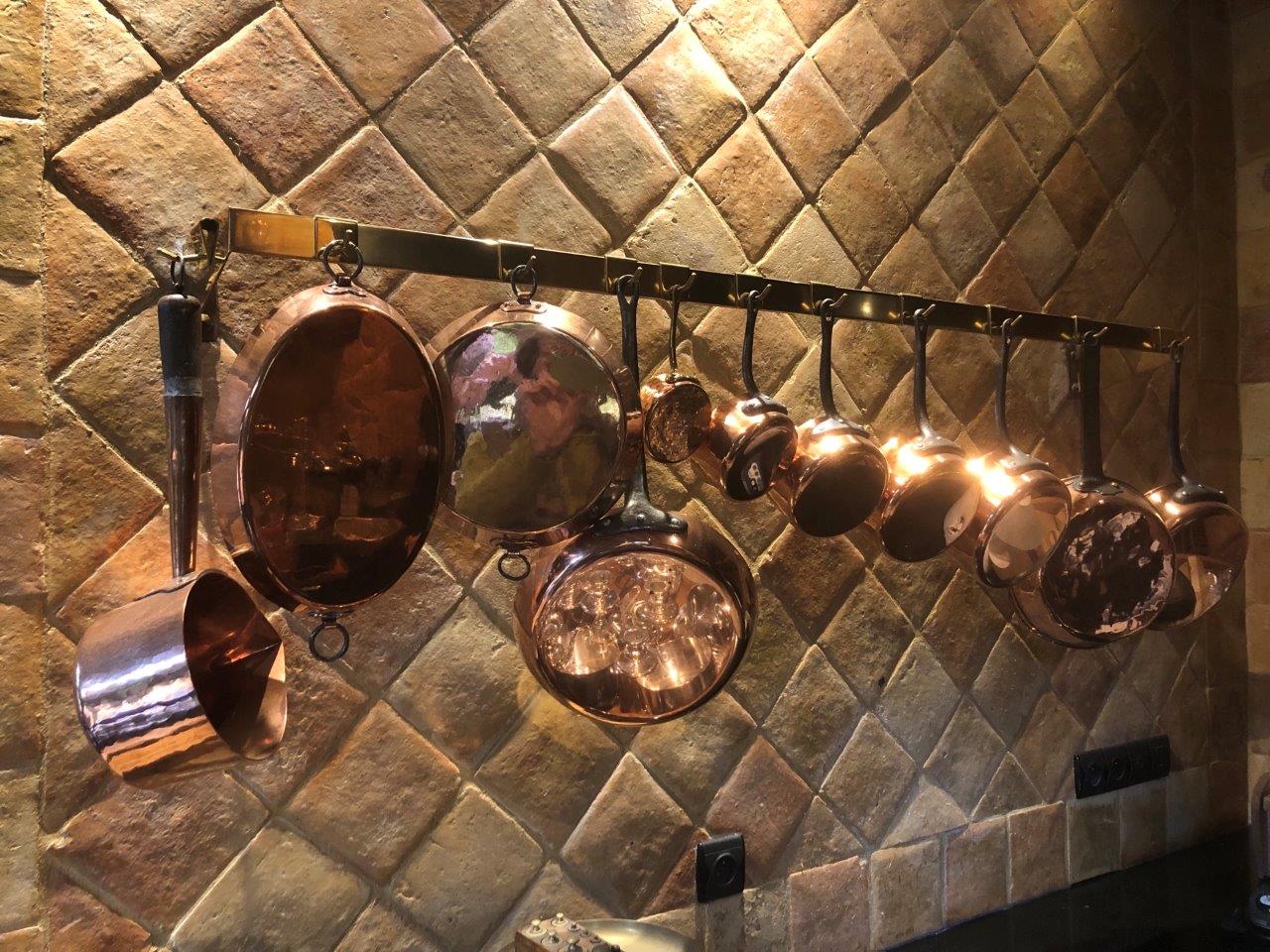 Onze cuivres: poêles, casseroles et instruments de cuisine utilisés par Alain Barrat puis par son gendre Didier Clément, alors que le restaurant détenait deux étoiles au Guide Michelin, de 1977 à 2007.