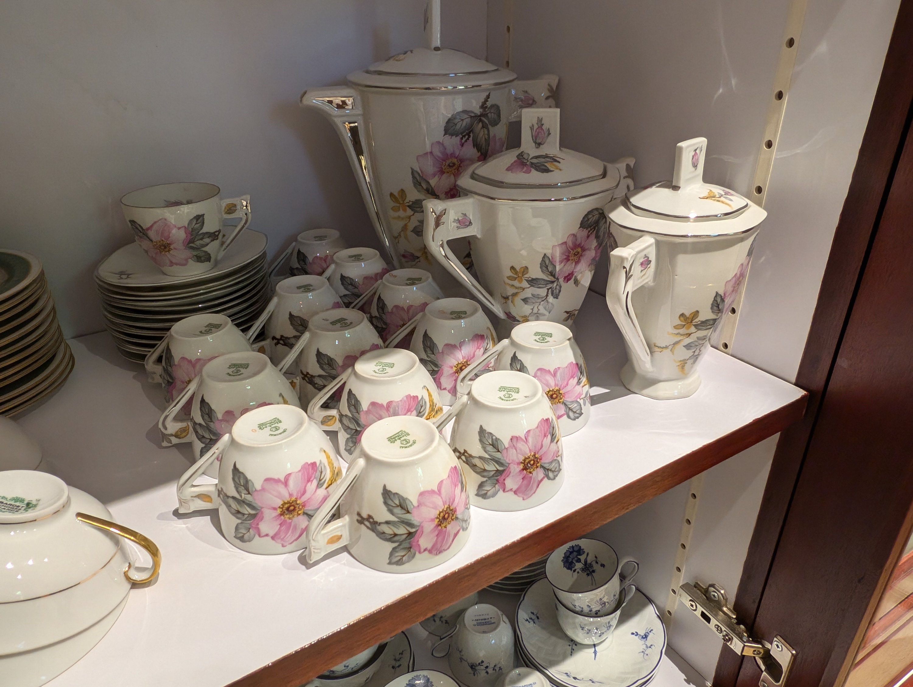 comprenant tasses, soucoupes, théière, cafetière et pot à sucre.