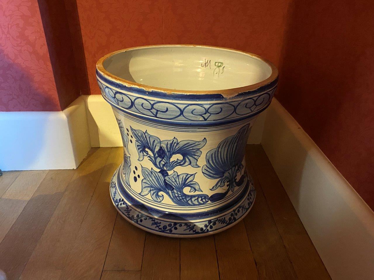 Nevers. Grand cache pot en faïence bleue-blanc à décor végétal.
