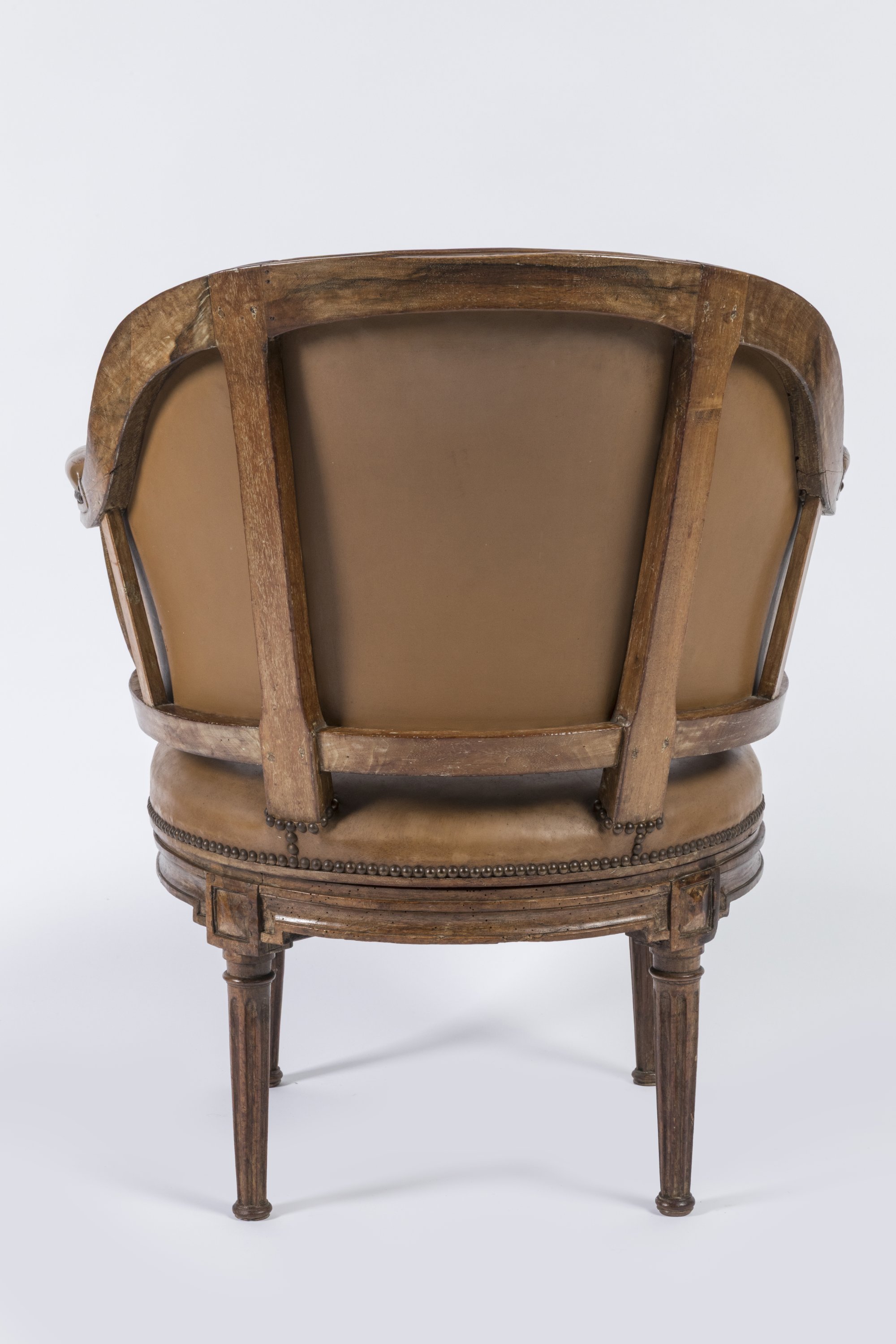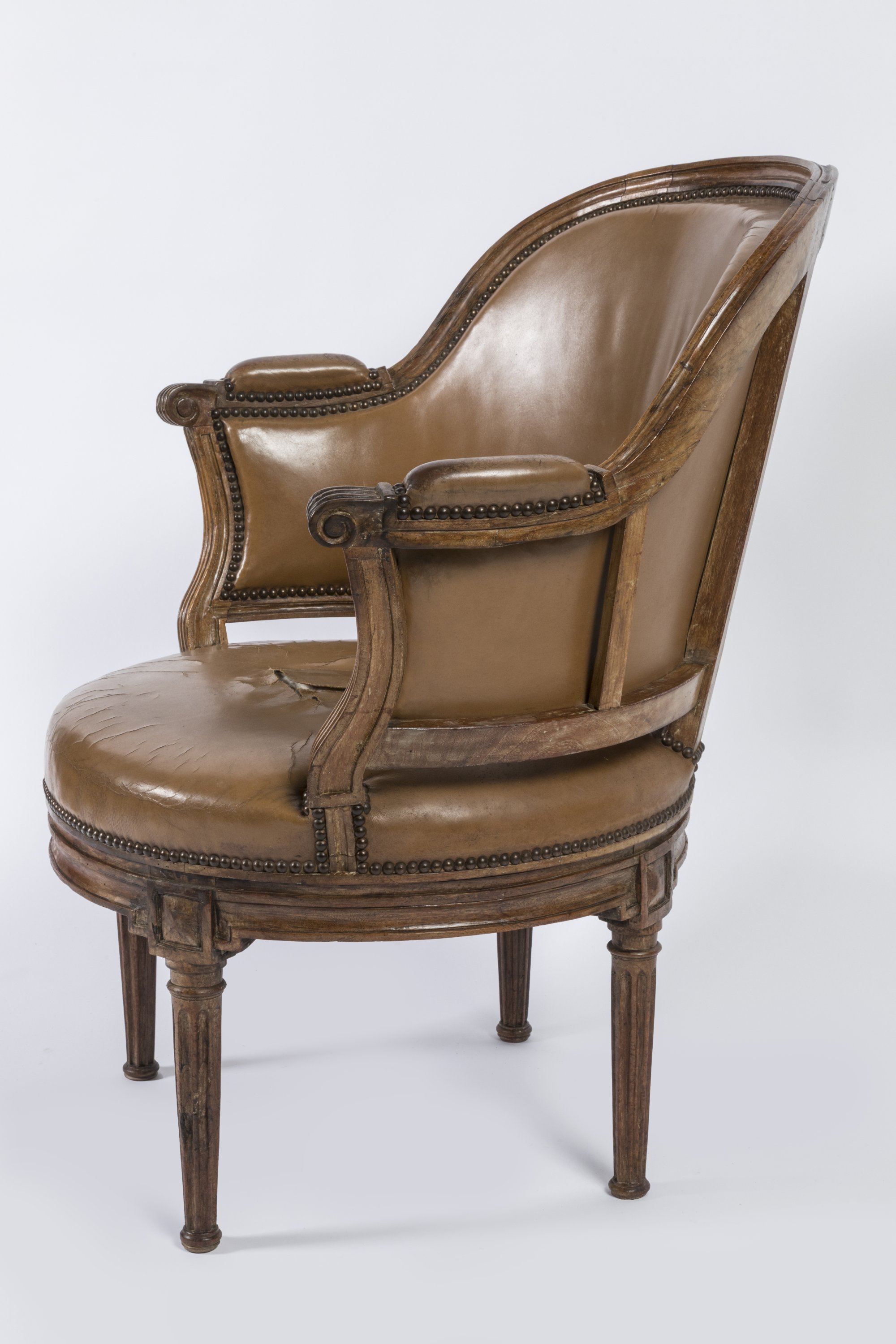 A carved and moulded beech wood armchair having belonged to the Marquis de Biencourt. Leather upholstery and brass nails. Louis XVI Period.