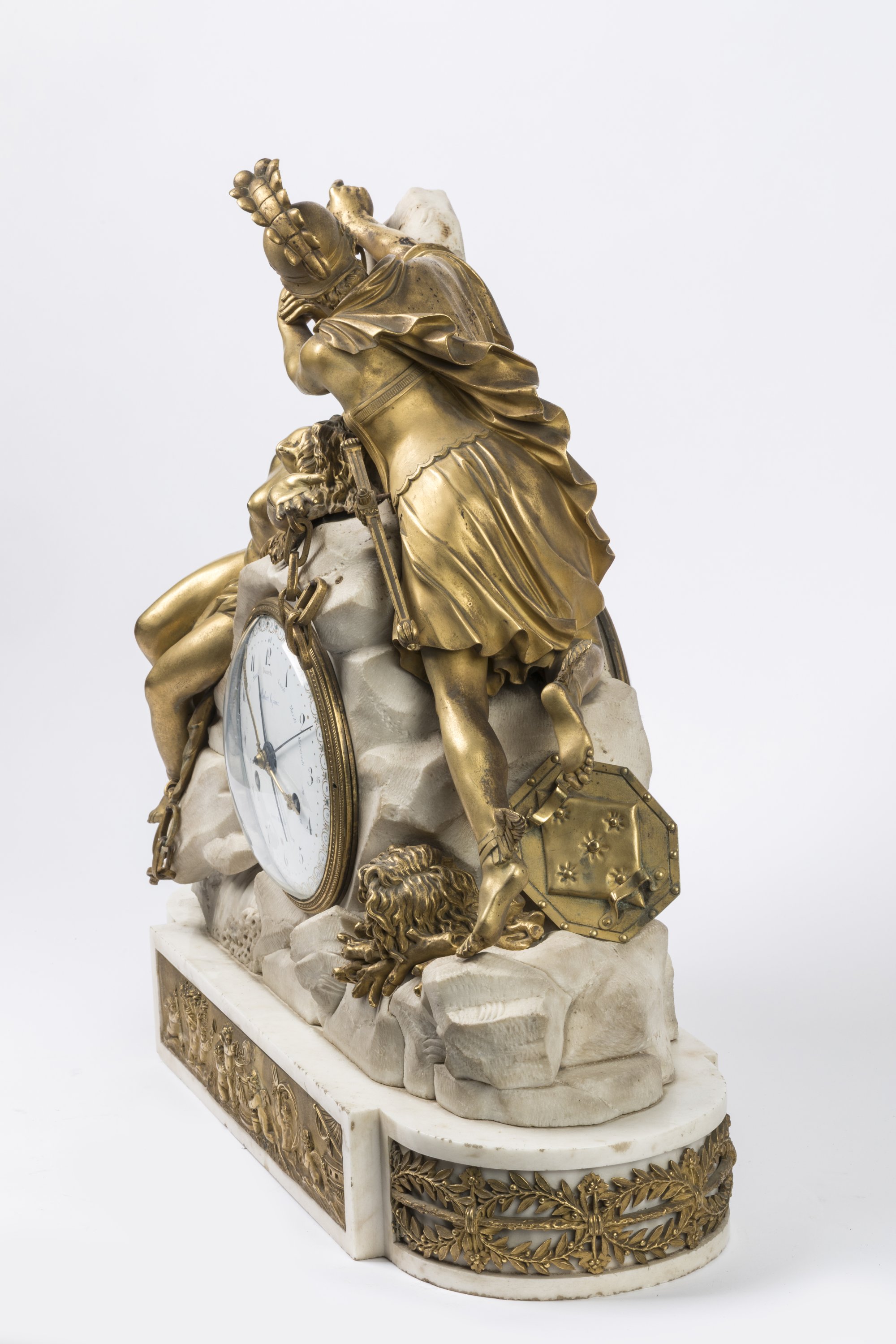 A chiseled ormolu and white marble mantel clock featuring Perseus freeing Andromeda. French Consulate-Empire Period.