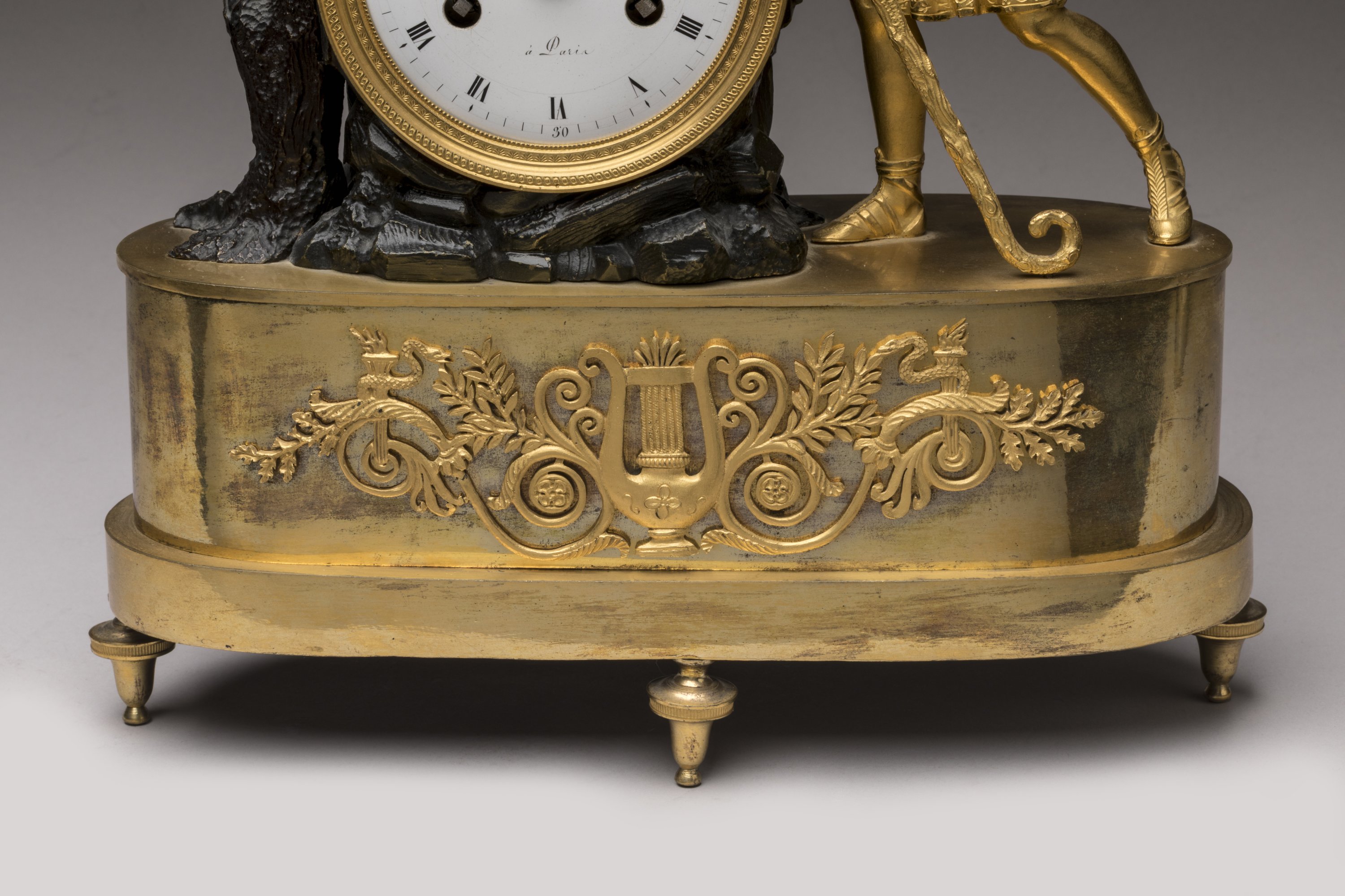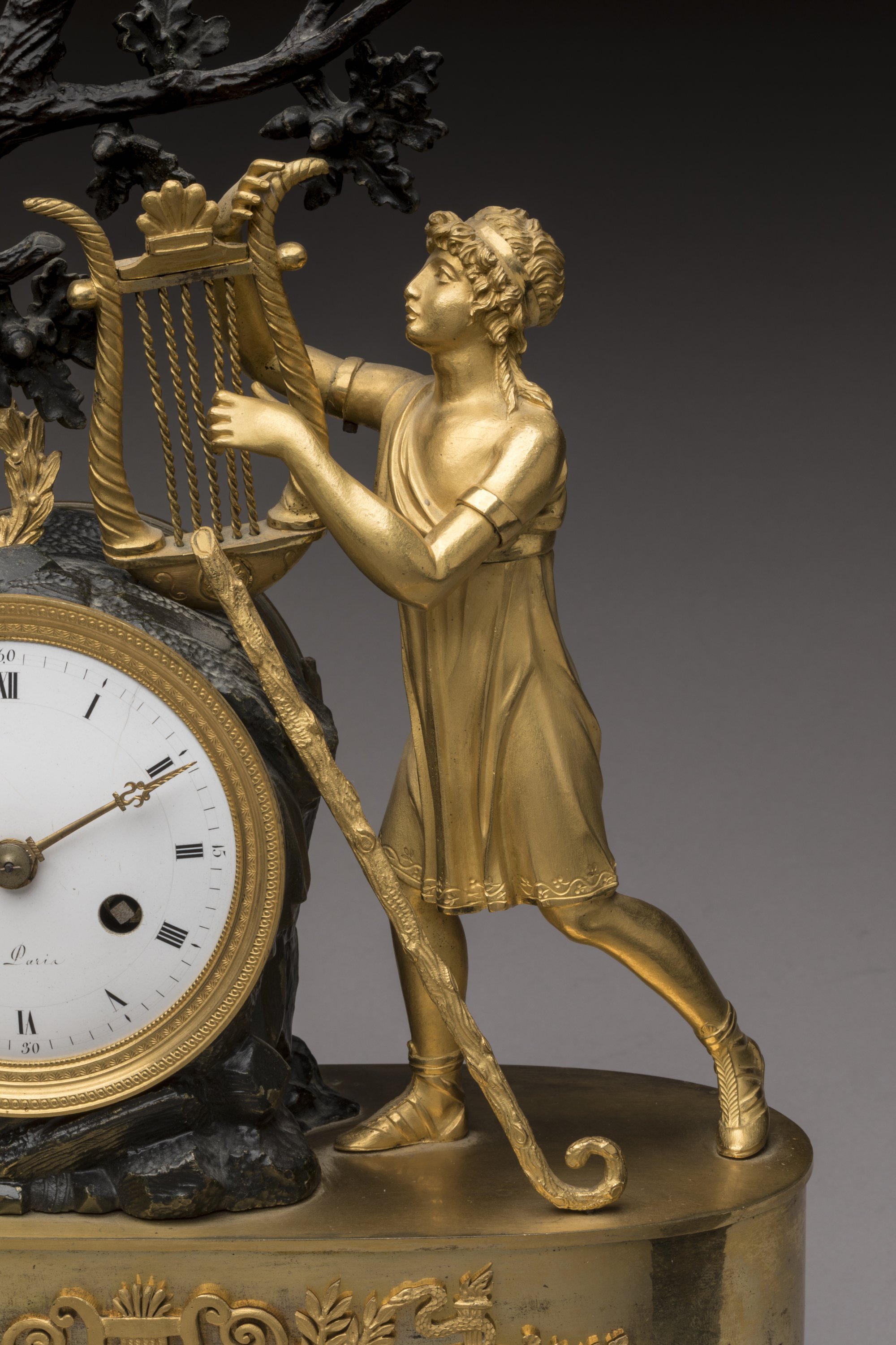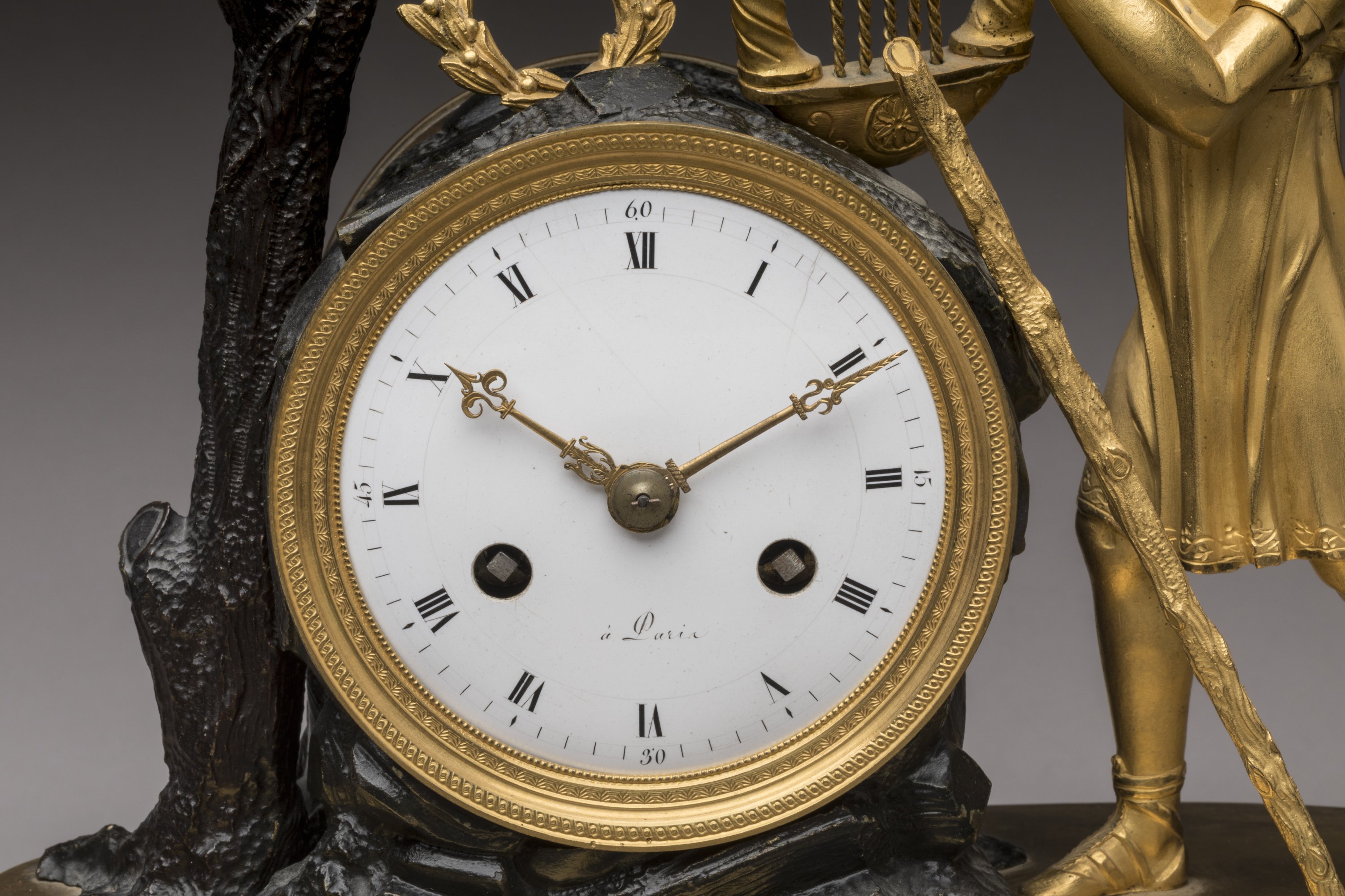 An ormolu clock featuring Eurydice holding a lyre. Early 19th century.