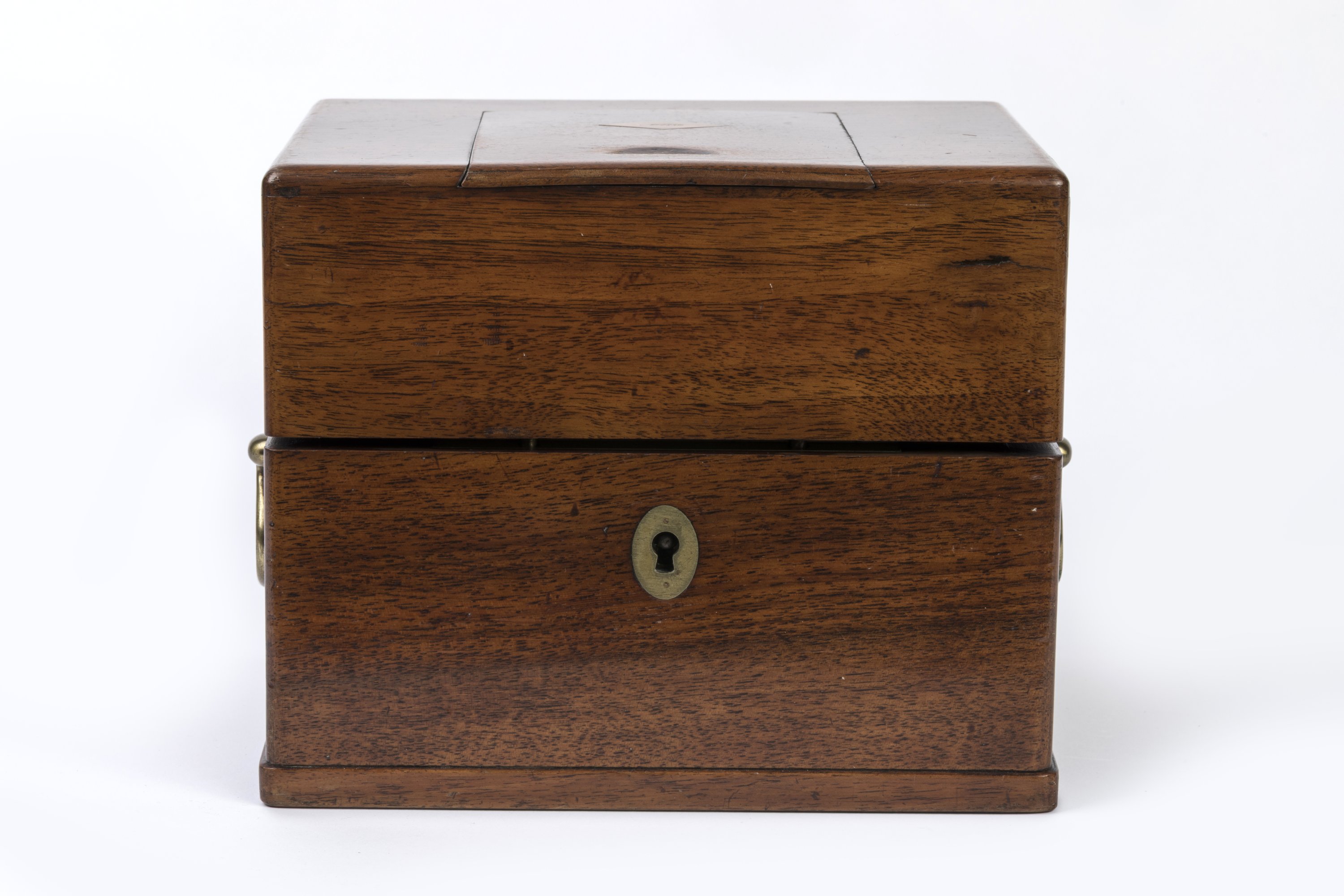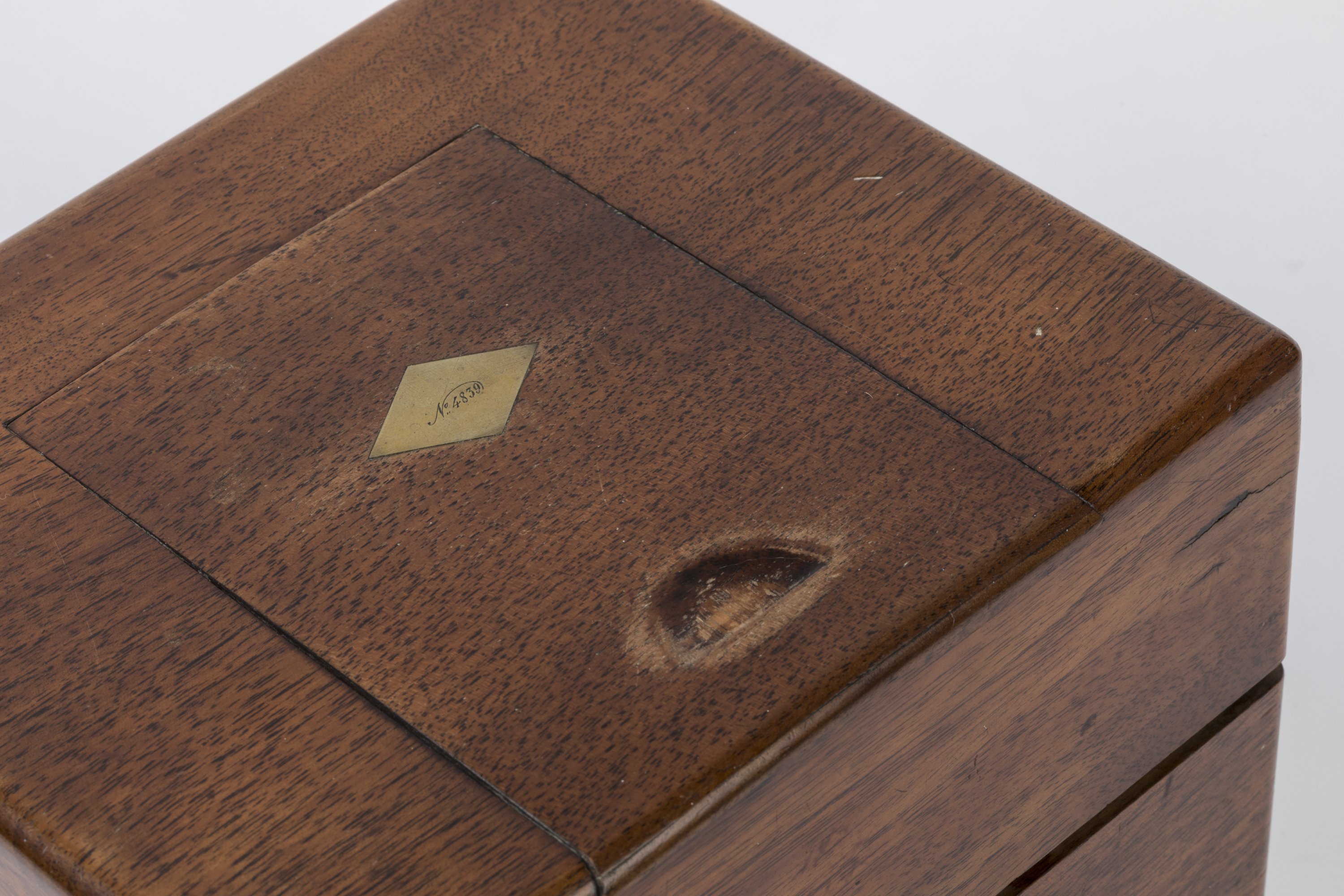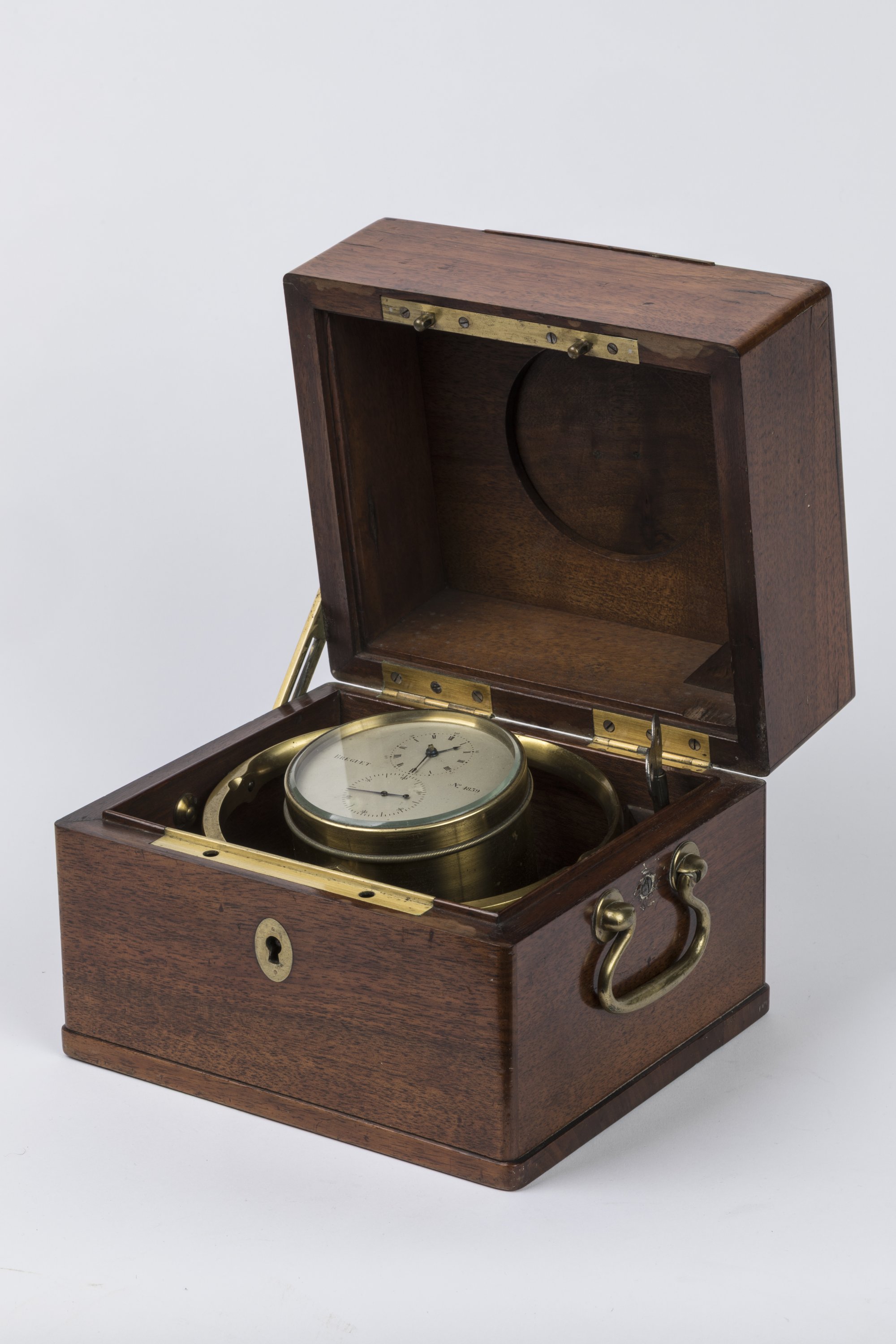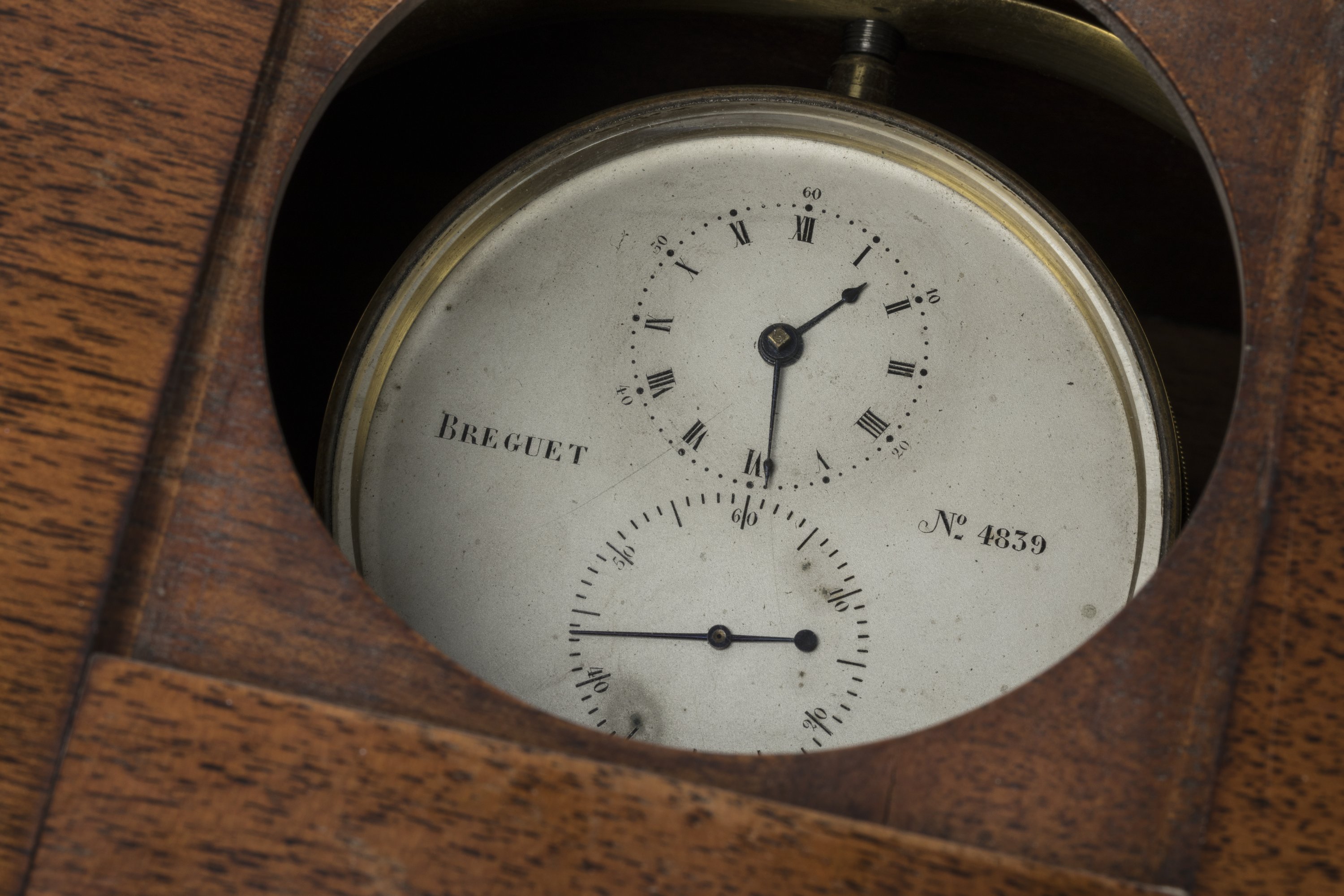 Breguet. A 1829-1830 single-barrel marine chronometer, walnut outer case with brass hinges and handles, brass clock case and Cardon suspension, silver-plated dial with subdial for hours/minutes above subdial for seconds, spring detent platform escapement. Signed and numbered.