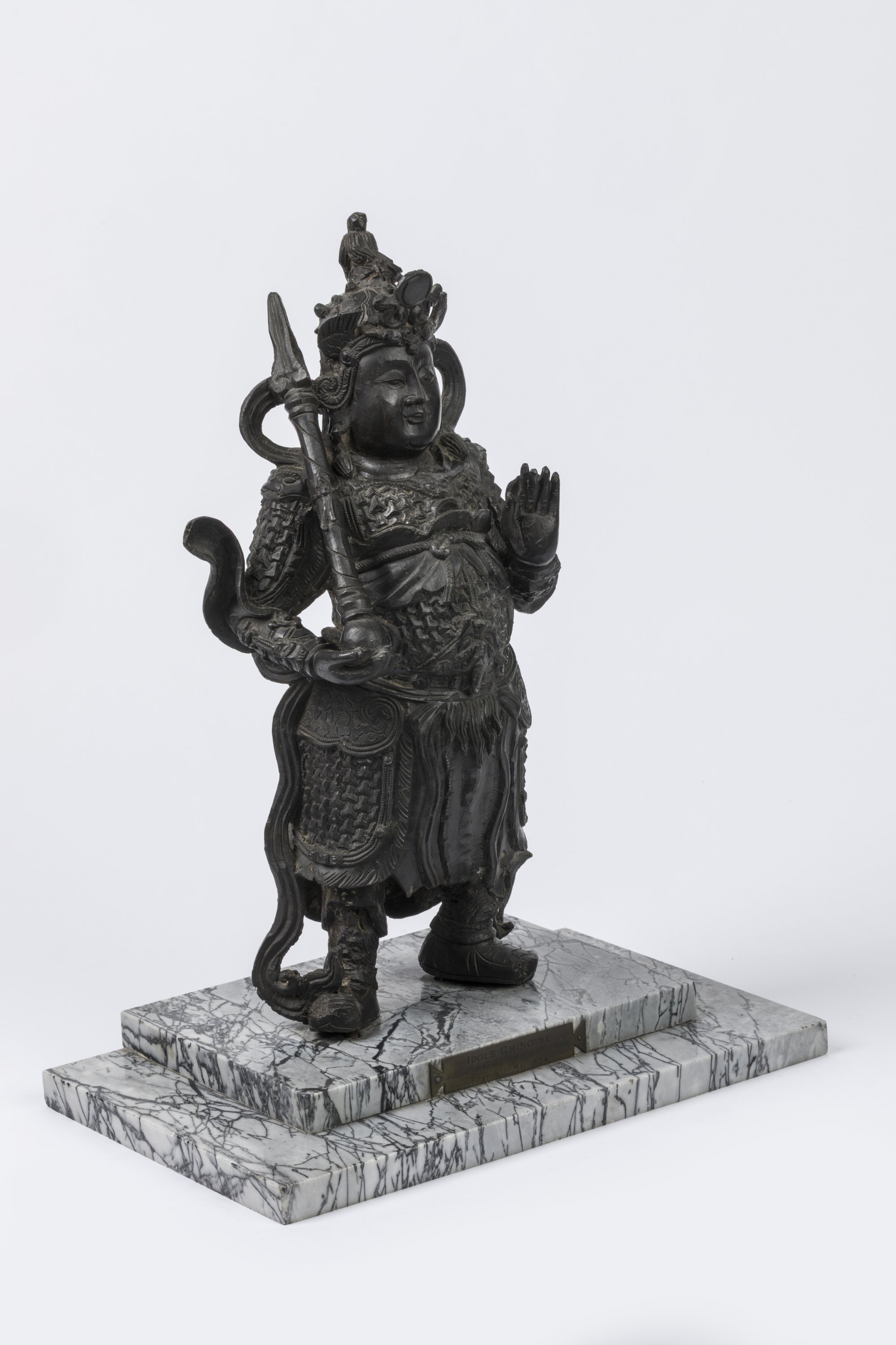 A Chinese bronze statue of Wei Tuo. On a stone base. Ming Dynasty.