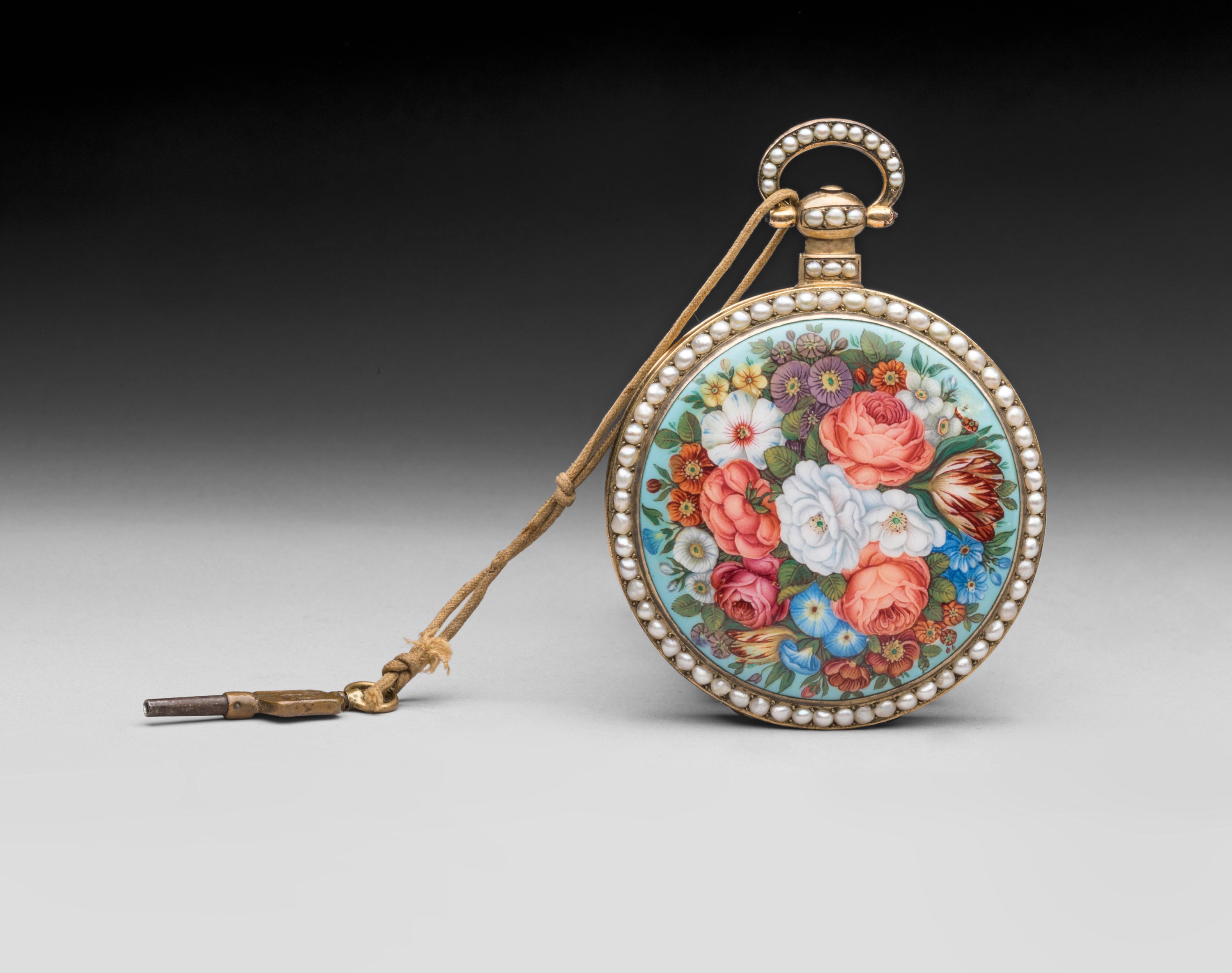 Métal doré à cadran émaillé blanc indiquant les heures en chiffres romains, les minutes par des bâtonnets et les aiguilles en acier bleui. Le boîtier et la bélière sont soulignés sur chaque face d'un rang de demi-perles. Au revers est présenté un décor en émail peint d'un bouquet de fleurs composé de pivoines, tulipes et marguerites. Le mouvement en acier poli protégé par une cuvette vitrée est signé "Bovet-Fleurier". Numérotée "1891".