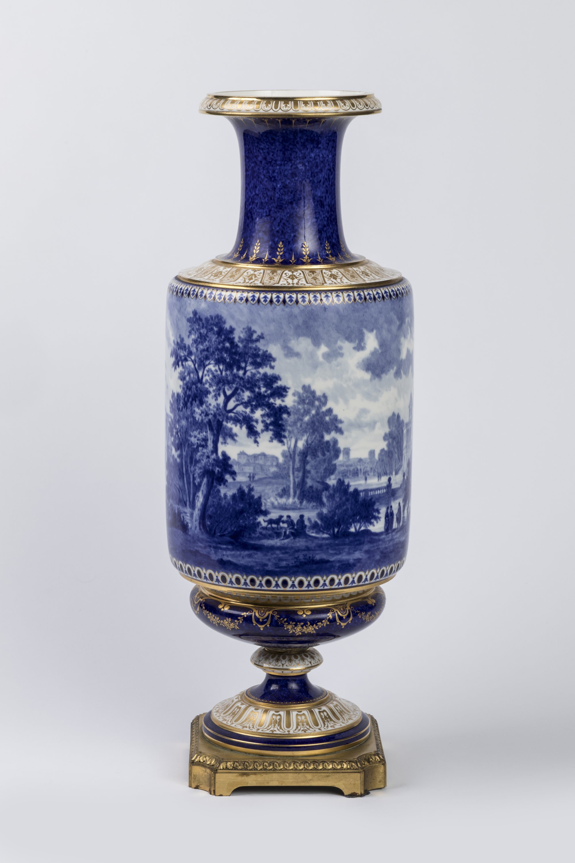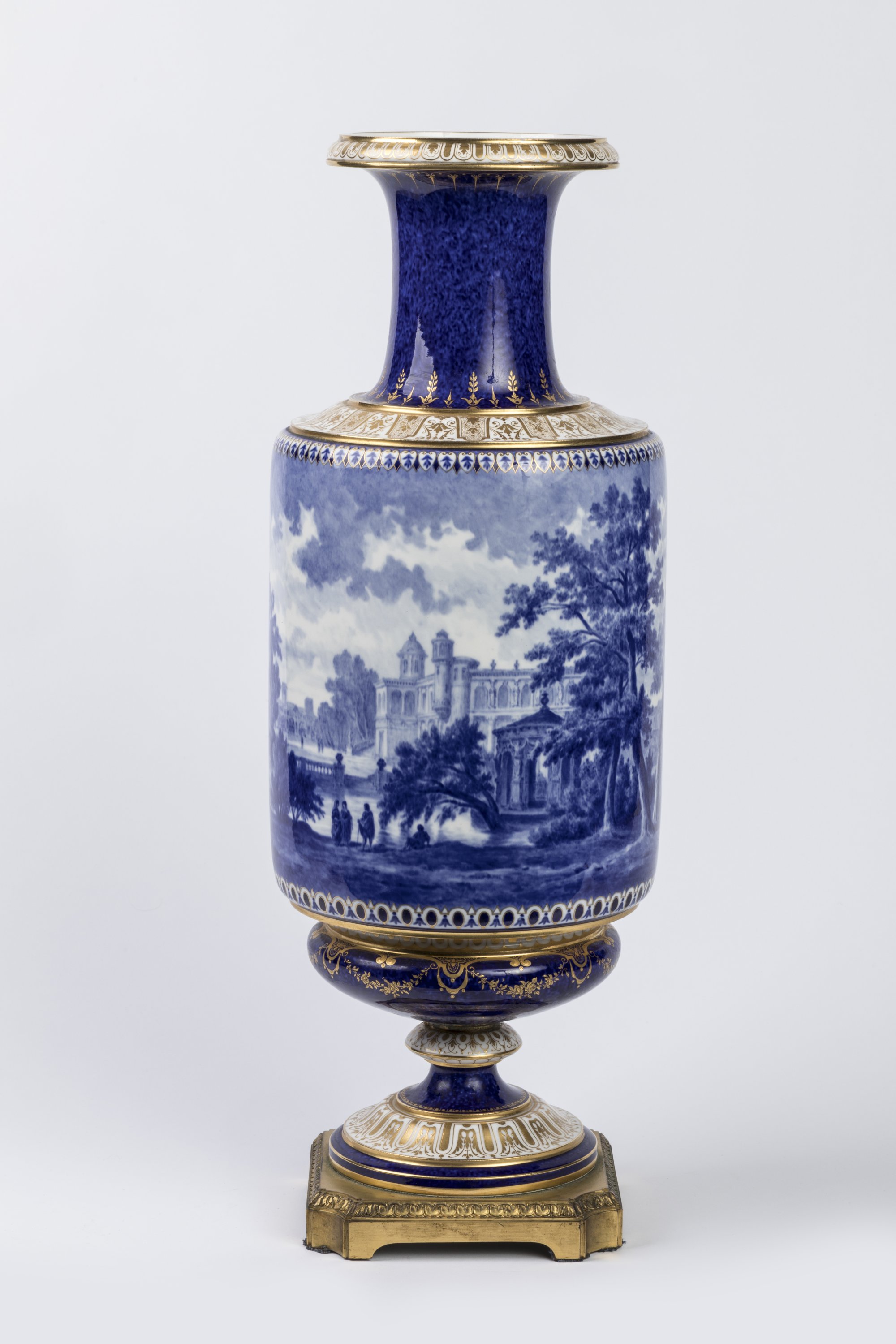 Eugène Hallion. An 1885 large ormolu-mounted blue baluster vase decorated with an Italian landscape. Monogrammed and dated.