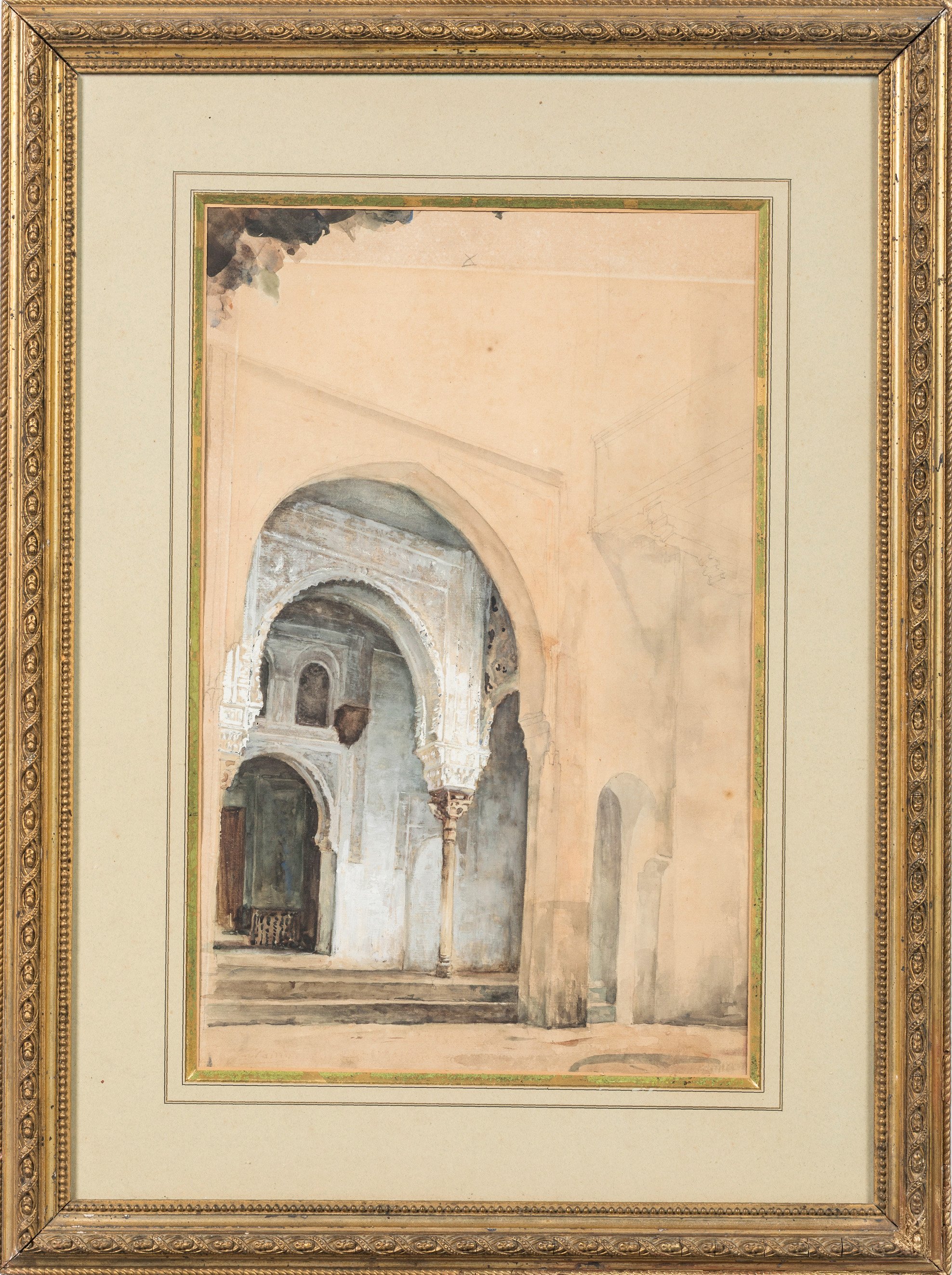 George Clairin. A drawing featuring one of the gates of the Alhambra Palace. Gouache, watercolor and black pencil on paper in a gilted stucco frame. Signed.