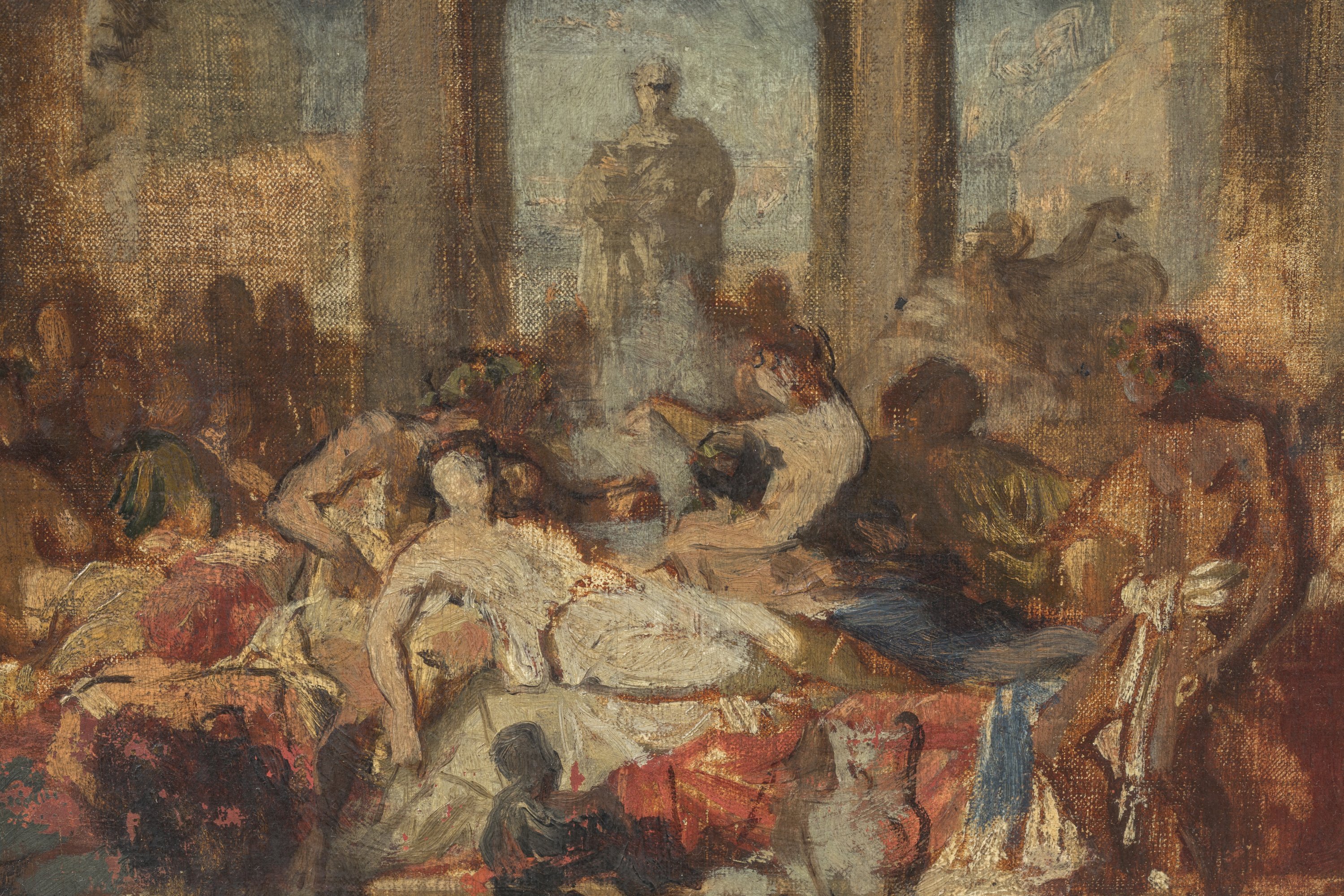 A painting depicting the Romans in their Decadence by a follower of Thomas Couture. Oil on original canvas. In a giltwood frame. French School, ca 1850.