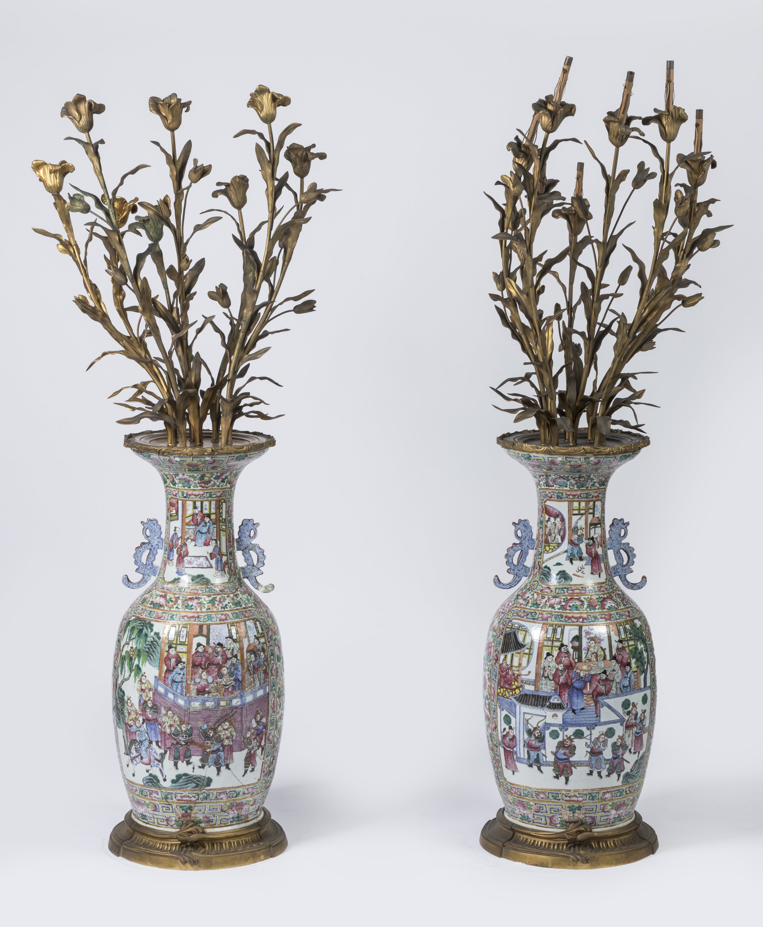A spectacular pair of ormolu-mounted Canton porcelain candelabra vases.