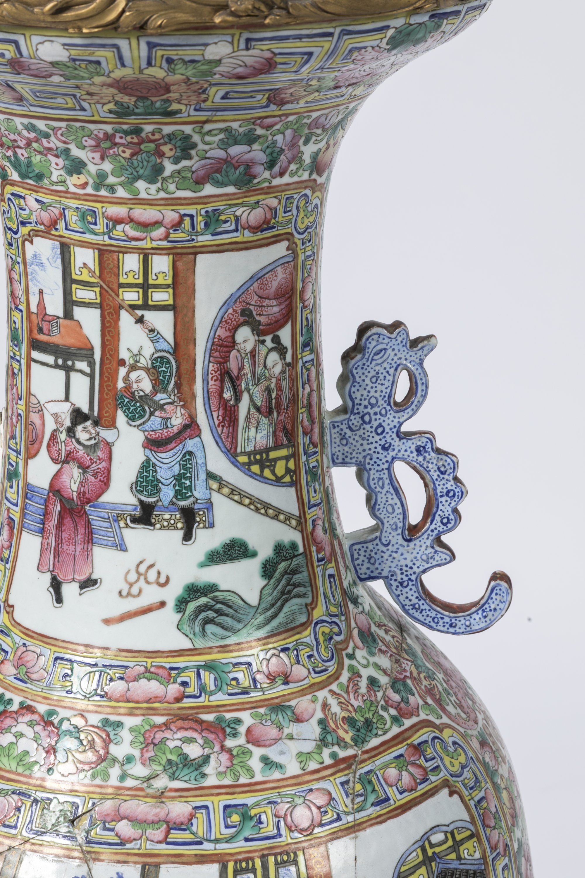 De forme balustre à décor émaillé de scènes de palais. La monture en bronze doré sous la base et à la lèvre retient en partie supérieure huit branches fleuries en bronze doré terminées par des fleurs de lys formant flambeaux.
